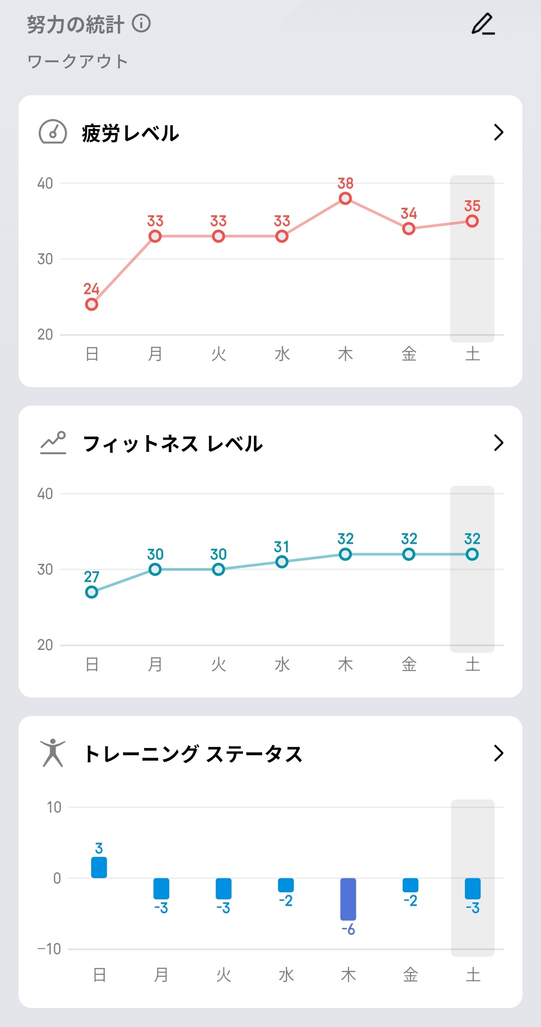 努力の統計では、疲労レベル(日曜24→月曜33→火曜33→水曜33→木曜38→金曜34→土曜35)、フィットネスレベル(27→30→30→31→32→32→32)、トレーニングステータス(日曜+3→以降マイナス推移)が7日間のグラフで可視化されています。木曜日に疲労がピークを迎えている一方でフィットネスレベルは着実に向上しており、トレーニングの効果と疲労のバランスを客観的に把握できるのが便利です。