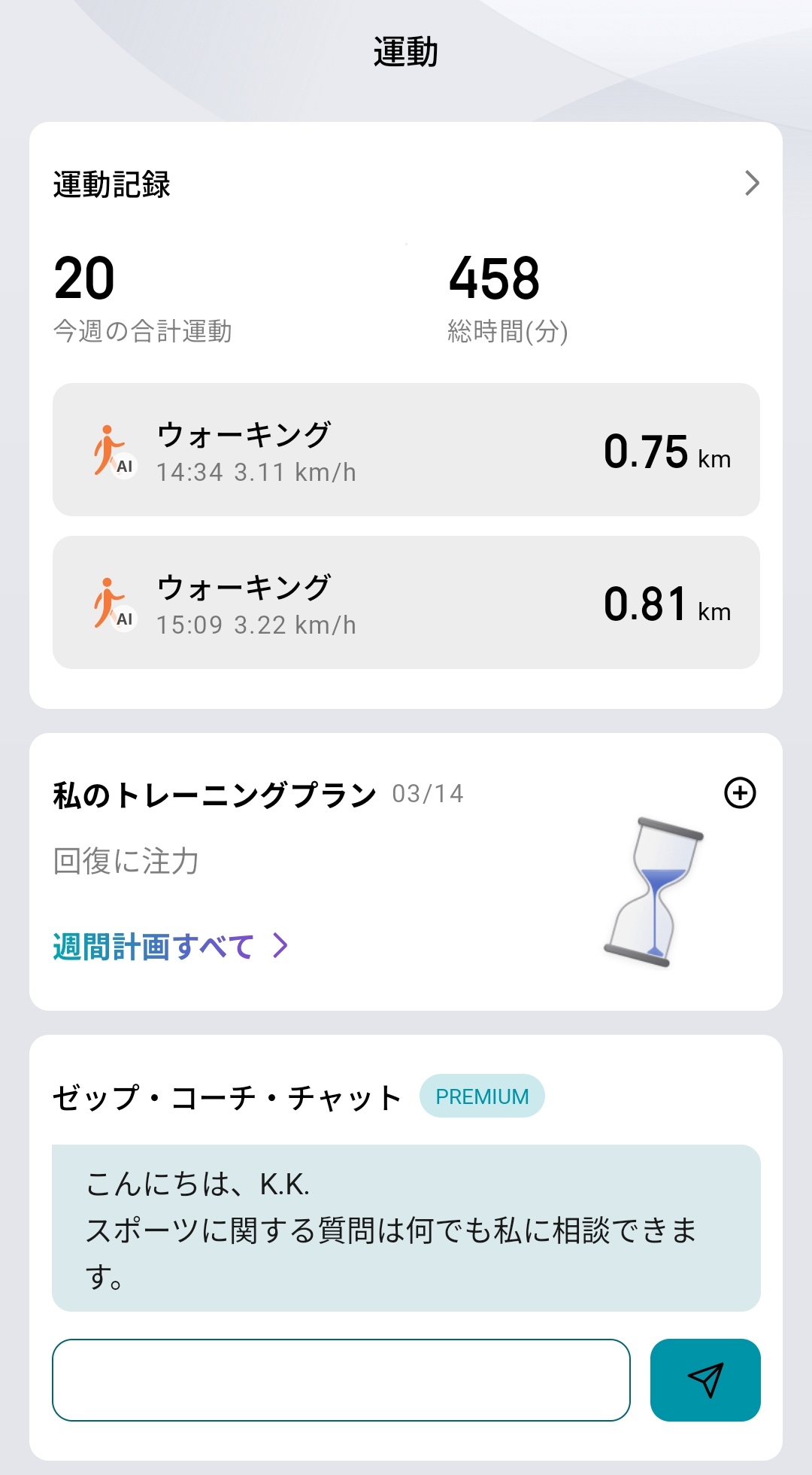 Zeppアプリの運動タブでは、運動記録(今週の合計運動20回・総時間458分)とAI自動検出されたウォーキング(14:34開始 0.75km / 15:09開始 0.81km)が一覧表示されます。その下にはZepp Coachの「私のトレーニングプラン」(03/14 回復に注力)が表示されており、「ゼップ・コーチ・チャット PREMIUM」からスポーツに関する質問も可能です。
