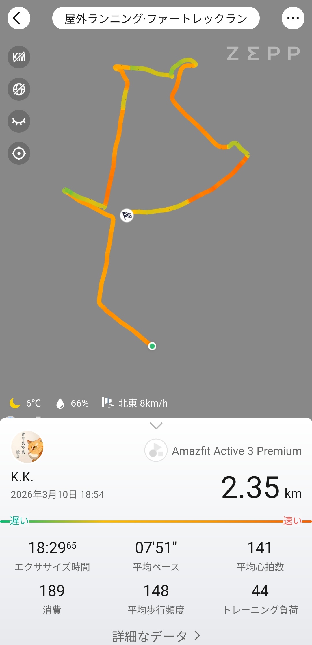 Amazfit Active 3 Premiumは円偏波GPSアンテナによる6衛星測位(GPS/GLONASS/Galileo/BeiDou/QZSSみちびき/NaviC)を搭載。高精度、かつ、高速な位置計測が可能で、屋外でのGPS捕捉速度は実測10〜20秒程度。運動を開始するときにはほぼ待たずに運動を開始することができます。短い距離ですが実際に走ってみた結果を確認してみると、エクササイズ時間や平均ペース、心拍数などをダイジェストで表示。また、マップ上に実際に走ったルートだけでなくペースに応じて色分けもしてくれて見やすくまとめてくれます。