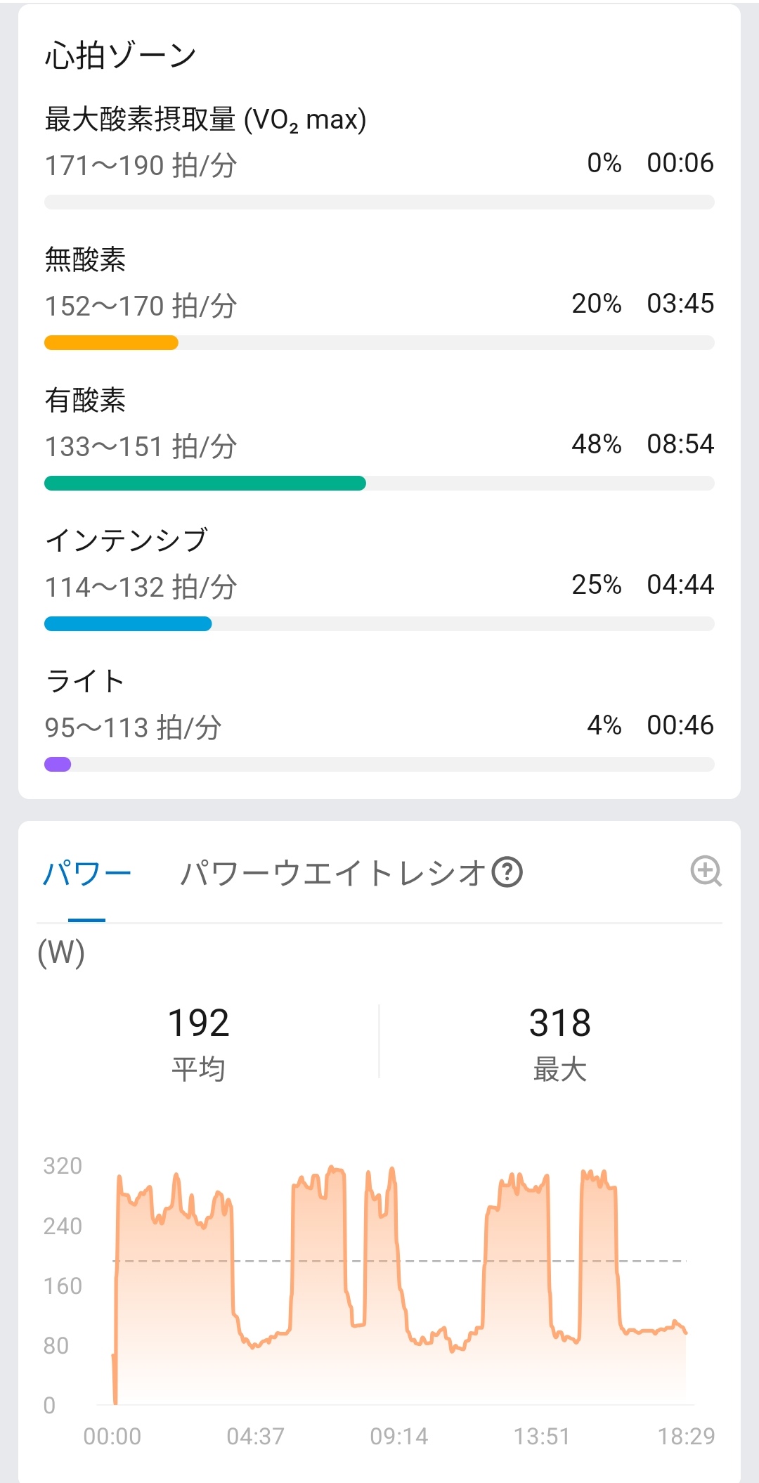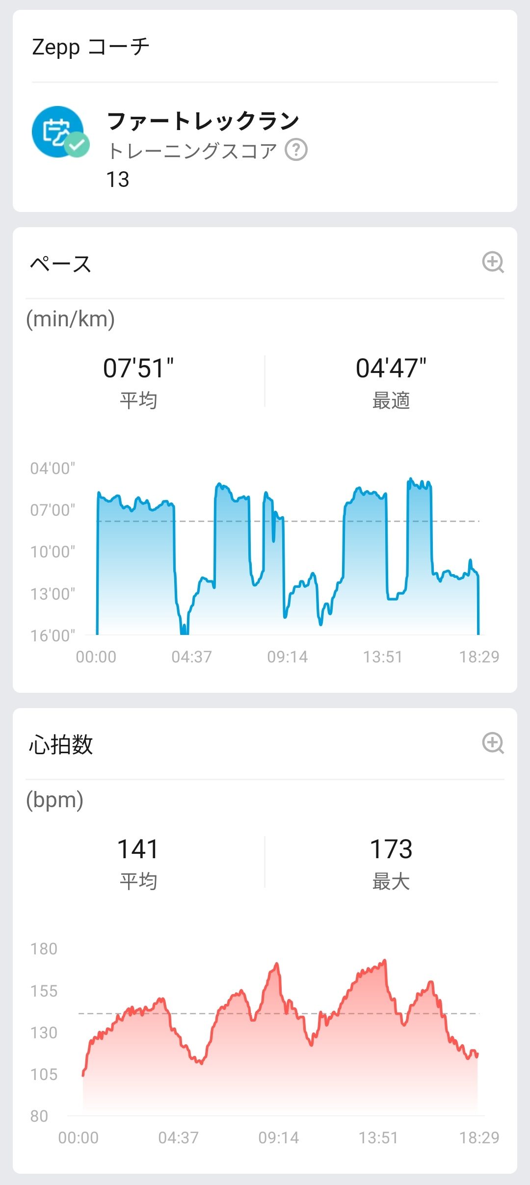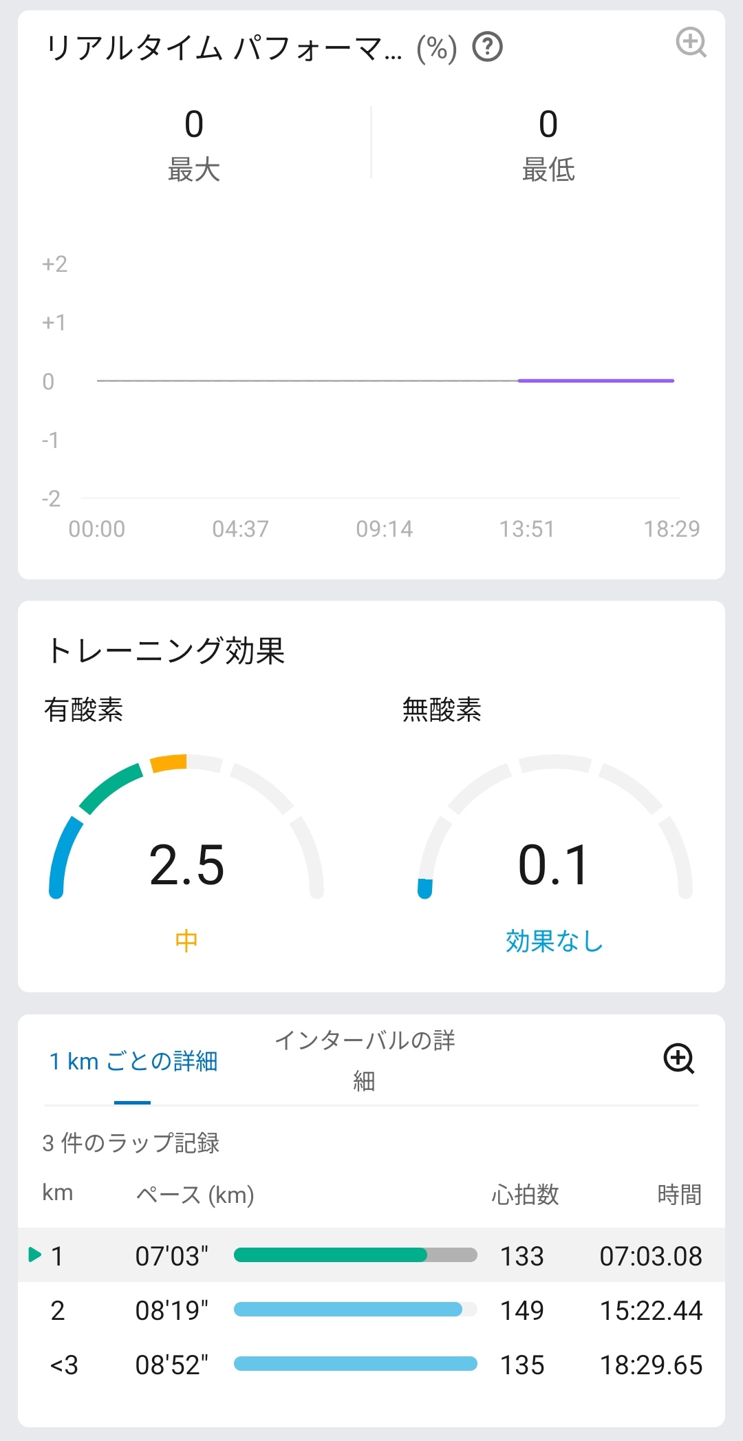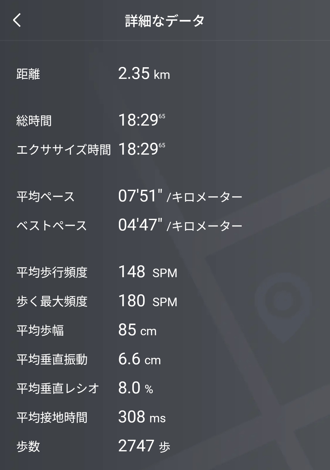 データを詳細に確認することも可能。距離2.35km、平均ペース07’51″/km、ベストペース04’47″/km、平均歩行頻度148SPM、平均歩幅85cm、平均垂直振動6.6cm、平均接地時間308msといったランニングダイナミクスに加え、消費189kcal、平均心拍数141回/分、最大心拍数173回/分、有酸素運動TE 2.5、VO2 max 46ml/kg/min、平均パワー192W、最大パワー318Wまで記録されていました。