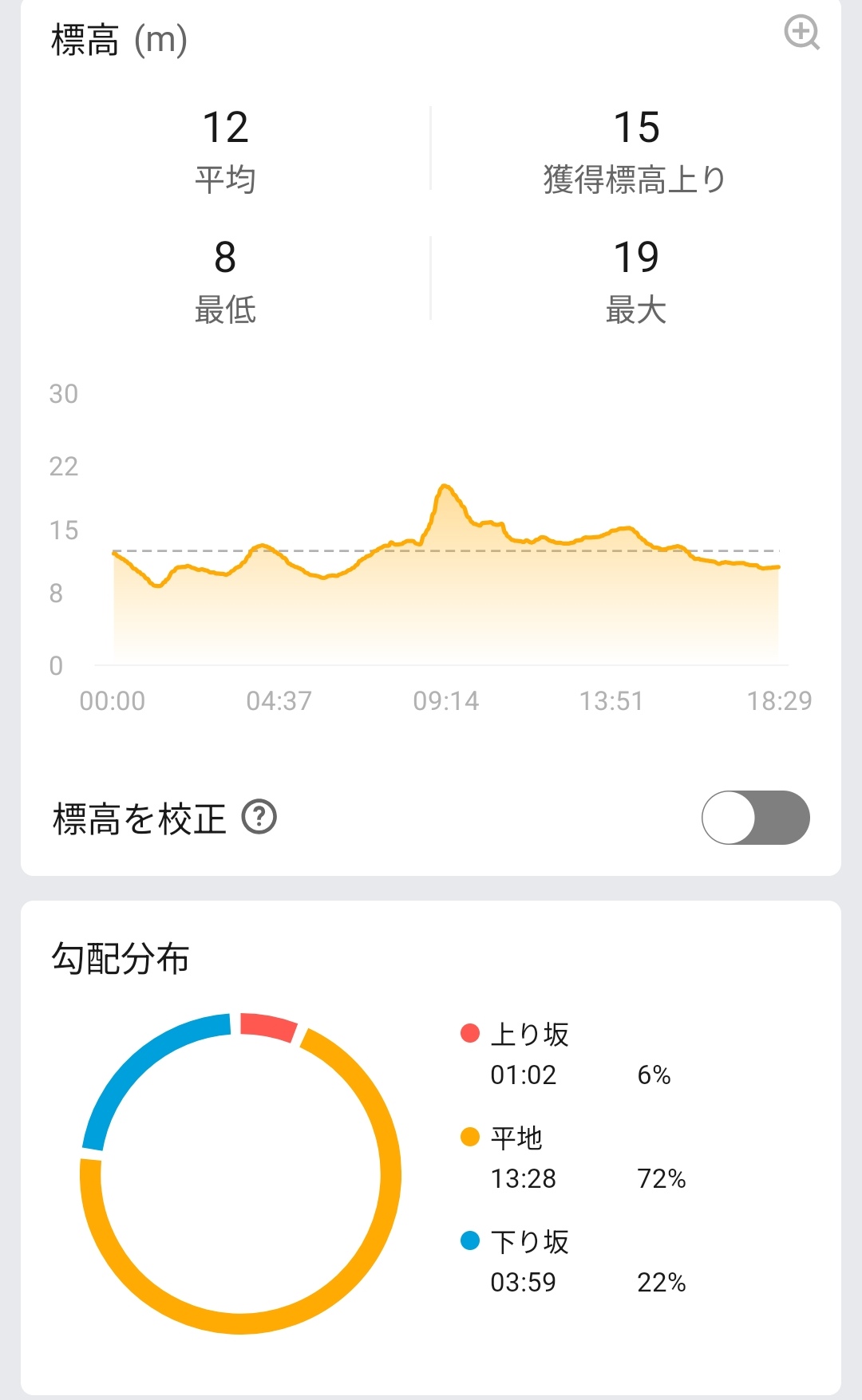 富良野にスキーに行った際にも本機をつけてその滑走の様子を記録。約2時間のスキーの中で滑走回数は5回ほど、総滑走距離は12kmほどの短めのスキー記録ですが、地図上にはその滑走の際の移動ルートがわかりやすく記録。リフト/ゴンドラで登っていた際と滑走していた際の記録も明確に分かれて記録されており、自身がどこを滑ったのかをパッと確認できるようになっています。