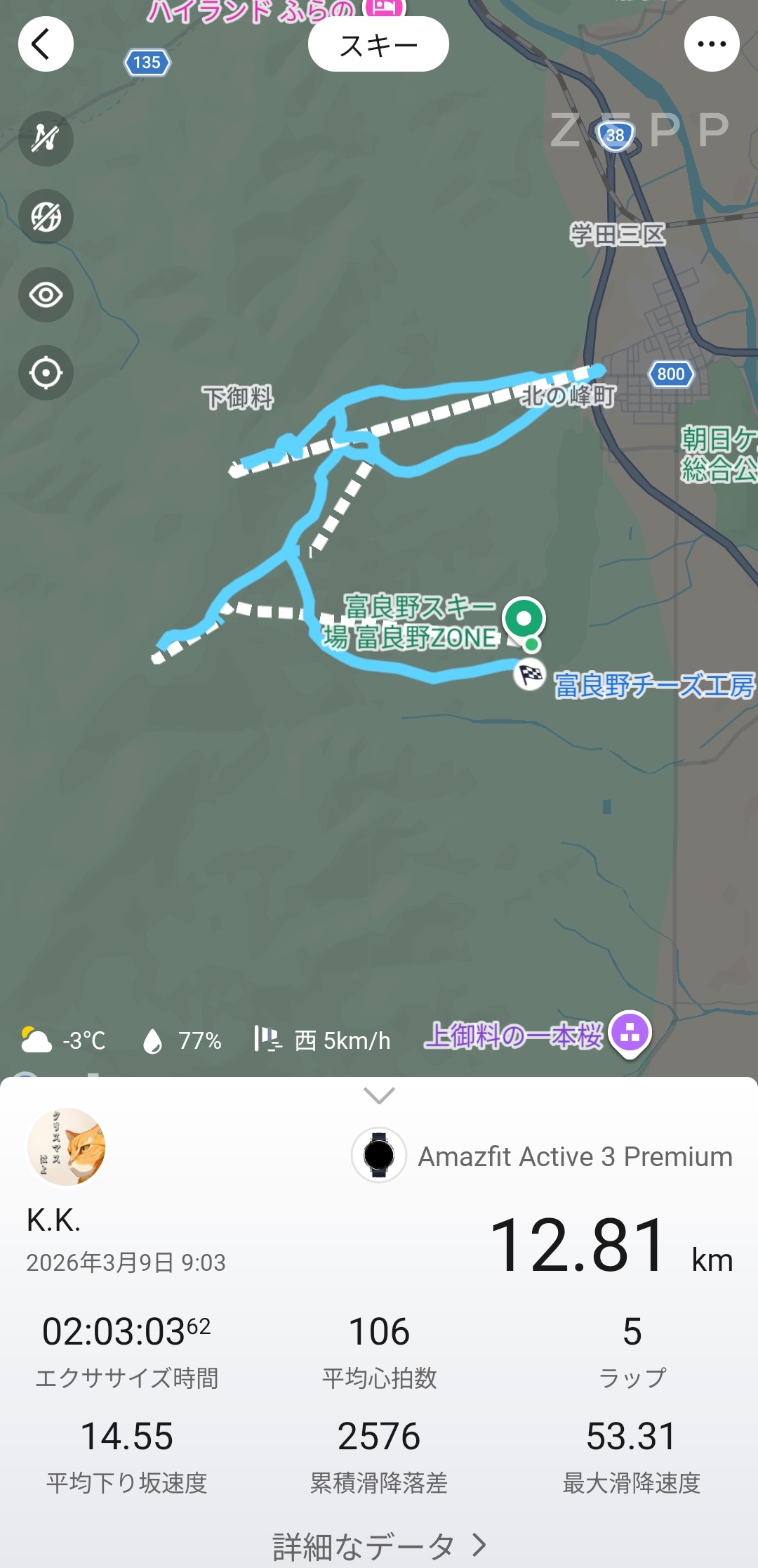富良野スキー場で2時間・12.81kmの滑走をGPS記録。リフトとコースが明確に分離する高精度
