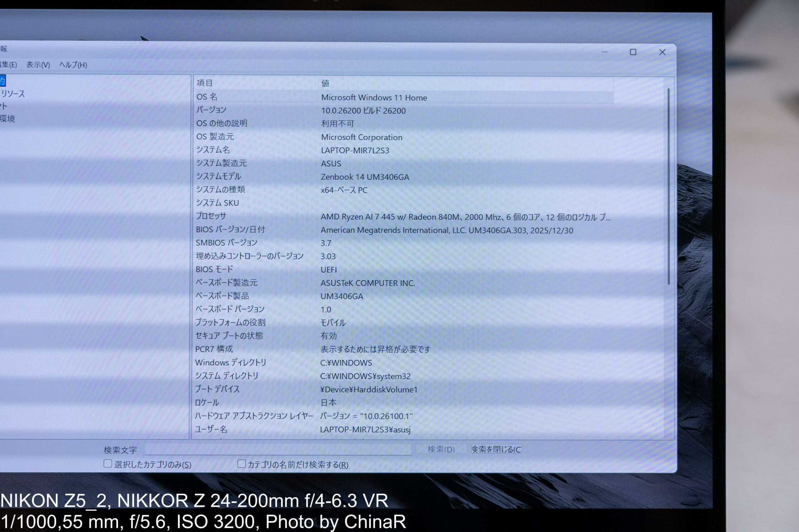 今回の発表会ハンズオンエリアでは、今回の発表対象製品以外にも、AMD Ryzen AI 7 445(6コア/12スレッド)を搭載したASUS Zenbook 14(UM3406GA)も実機展示されていました。システムモデル名がUM3406GAで、Windows 11 Home 64ビット・32GB LPDDR5X-7500・1TB PCIe 4.0 NVMe・約1.28kg・14型OLED(1,920×1,200 / 60Hz)という構成です。