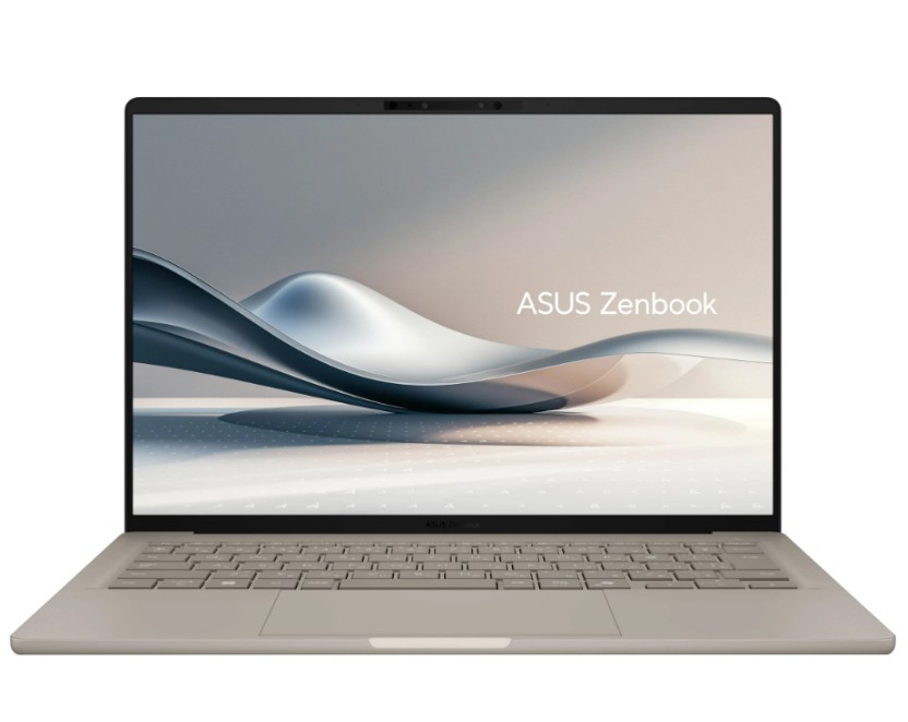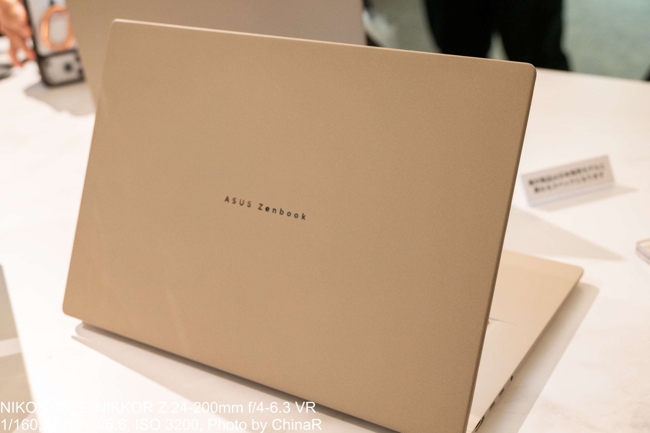 ベージュ(ザブリスキーベージュ)カラーモデルは温かみのある砂色の外観で、スタイリッシュでありながら主張しすぎない落ち着いた雰囲気が特徴的です。実機を会場の白いテーブルに置いた状態での見た目は非常に上品で、カジュアルとフォーマルの中間を狙ったようなデザインとなっています。背面のロゴは細いサンドブラスト仕上げのASUS Zenbookのロゴのみで、余計な装飾を一切排した洗練されたデザインを実現しています。
