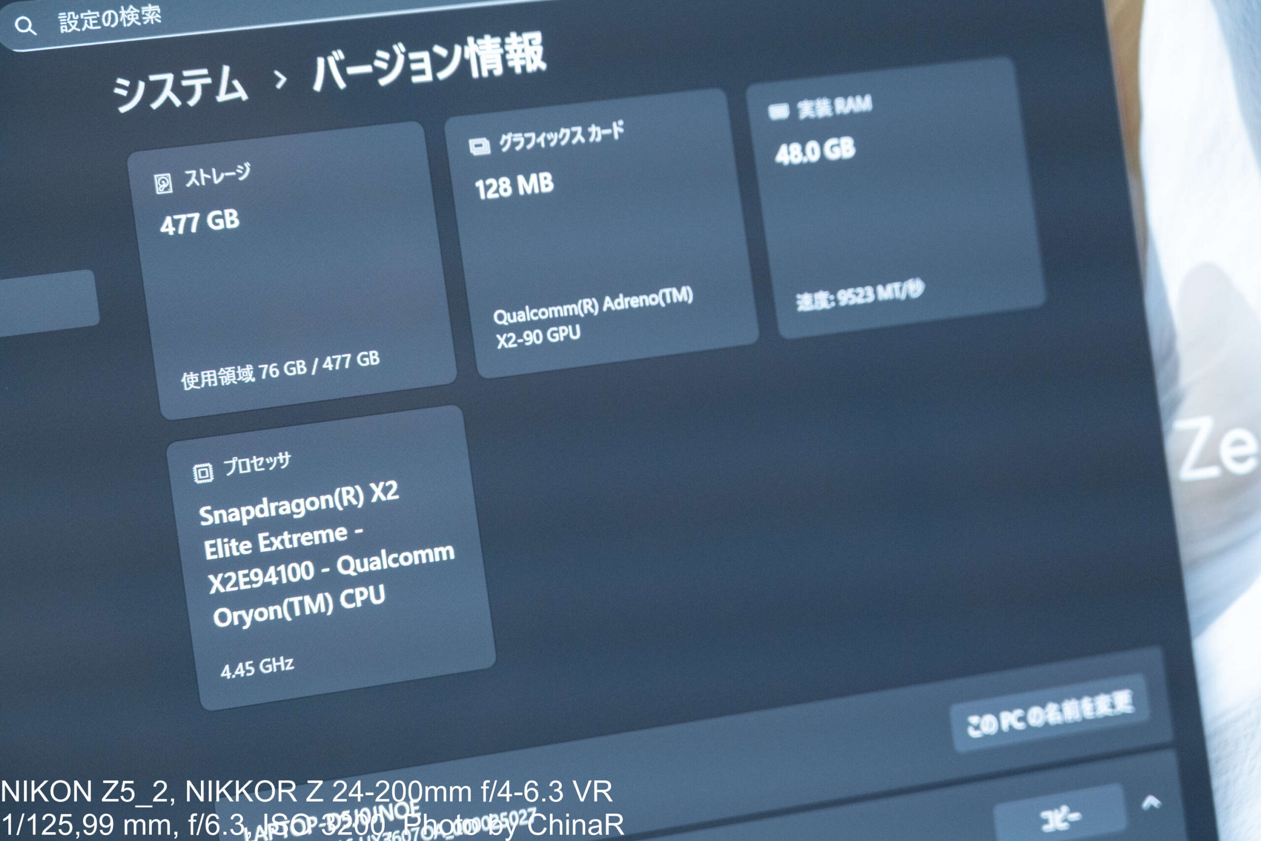 さらにシステムのバージョン情報画面では、プロセッサが「Snapdragon R X2 Elite Extreme – X2E94100 – Qualcomm Oryon(TM) CPU」、グラフィックスが「Qualcomm Adreno X2-90 GPU」、実装RAMが48.0GBで速度が9523MT/秒、ストレージが477GBと表示されており、公称スペックどおりの構成が確認できました。Snapdragon X2 Elite Extremeの定格クロックは4.45GHzで動作していることも確認しました。