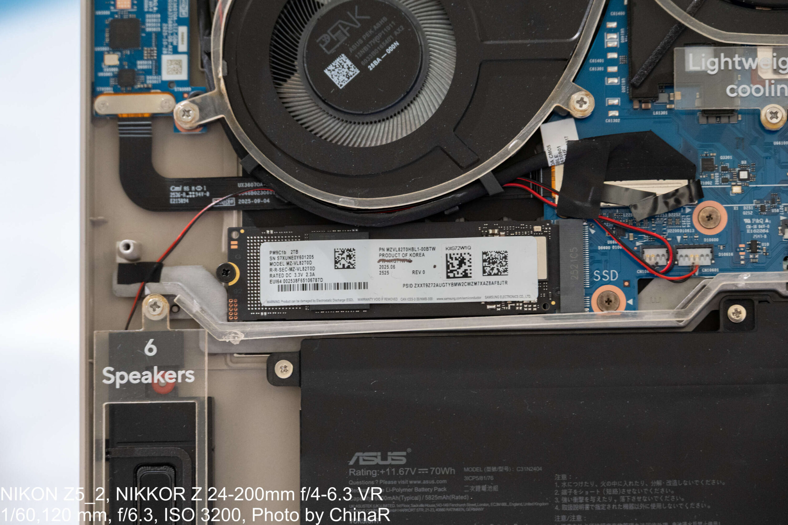 また、展示機ではSSDが「Samsung PM9C1b 2TB」であることも確認できました。展示機は2TB搭載でしたが、日本販売モデルは1TB(PCIe 4.0)構成となっています。全体的にコンポーネントの配置が非常に整然としており、薄型軽量と冷却性能の両立を徹底してエンジニアリングした跡が随所に見えます。