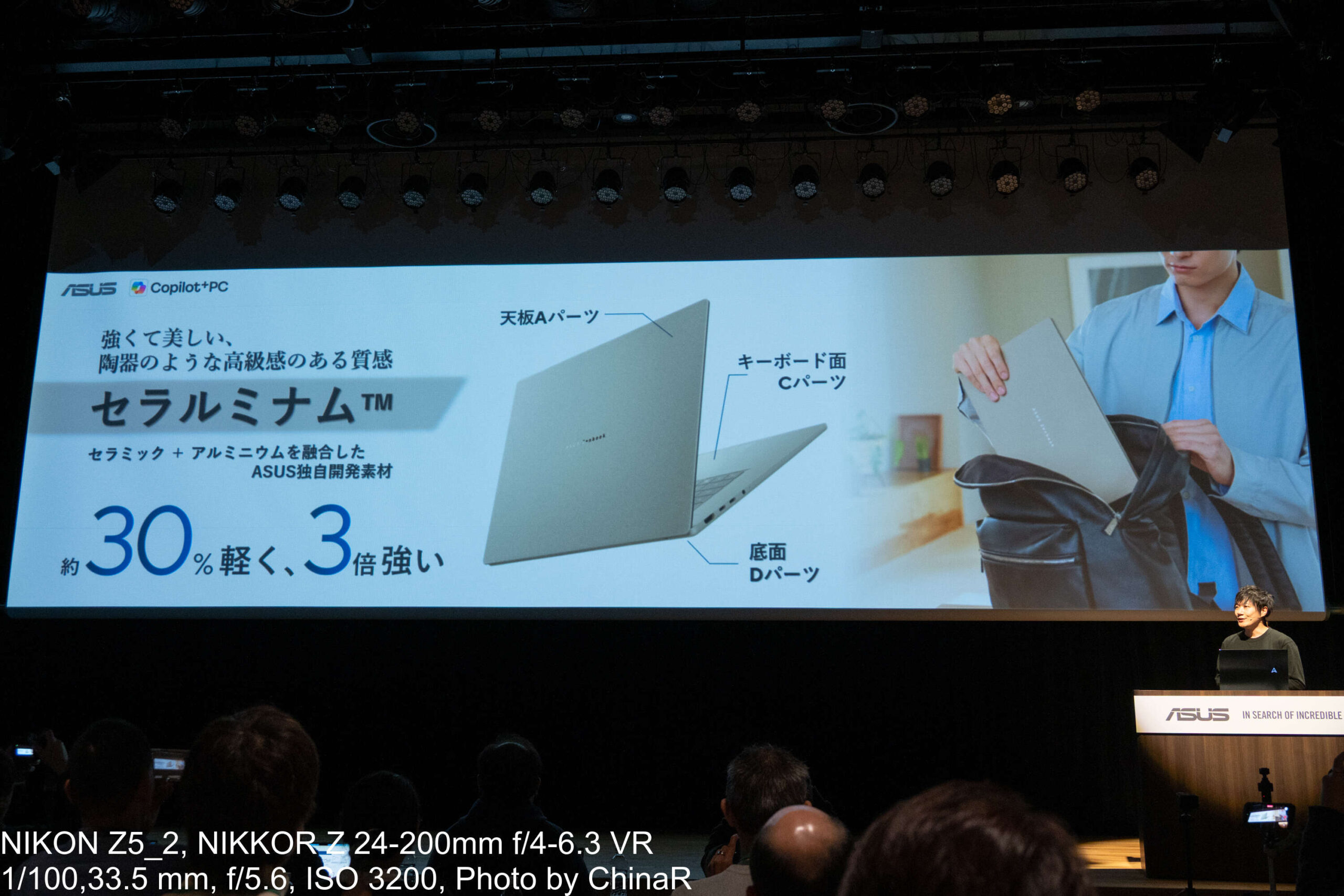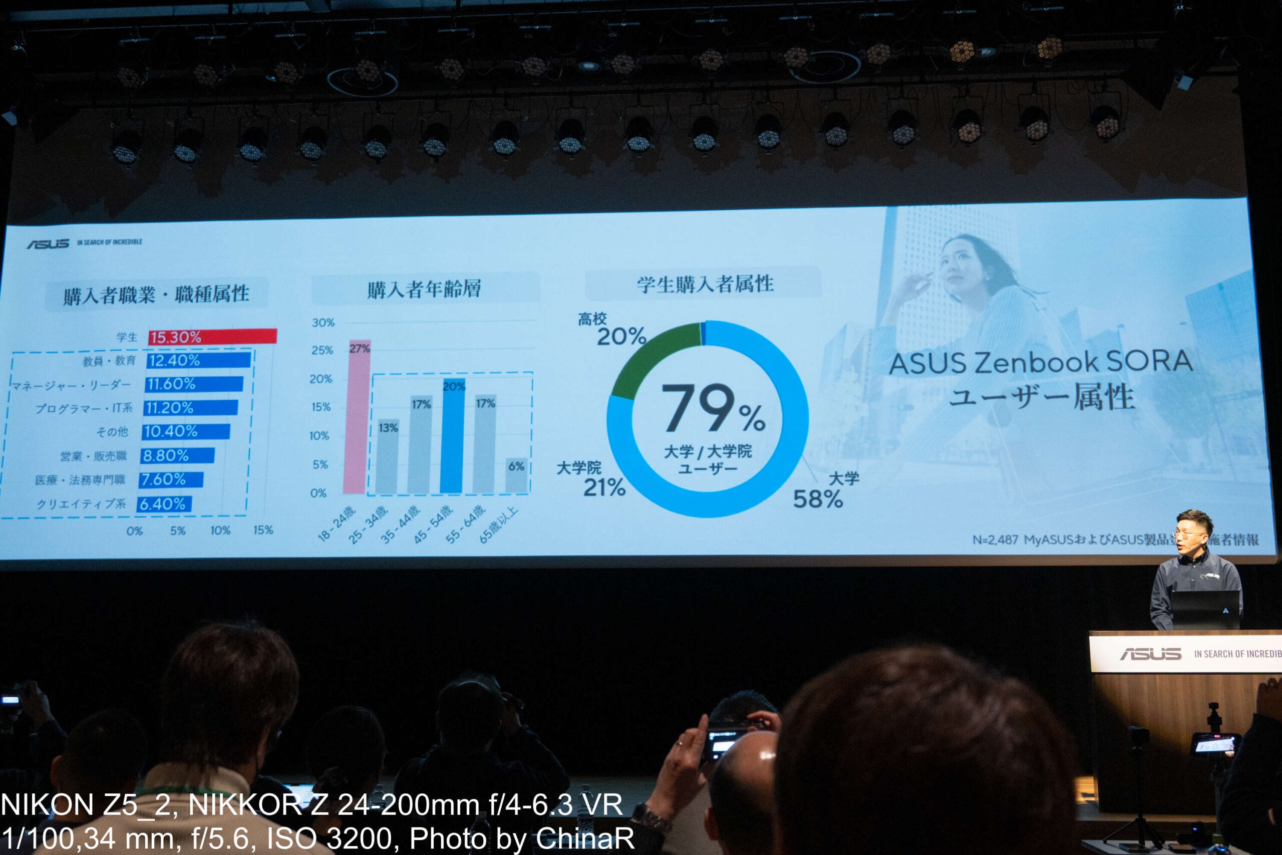 ASUSのAI PCセグメントは、GPUも搭載したAdvanced AIセグメント、40TOPS以上のNPUを搭載したCopilot+ PCセグメント、そして日常使いにも最適なEveryday AIセグメントの3本柱で展開しているとのこと。旧Zenbook SORAの購入者の約15%が学生(うち8割が大学生・大学院生)というデータを踏まえ、今回の新モデルではビジネスやクリエイティブのプロフェッショナル層へのユーザー拡大も視野に入れていることが強調されていました。