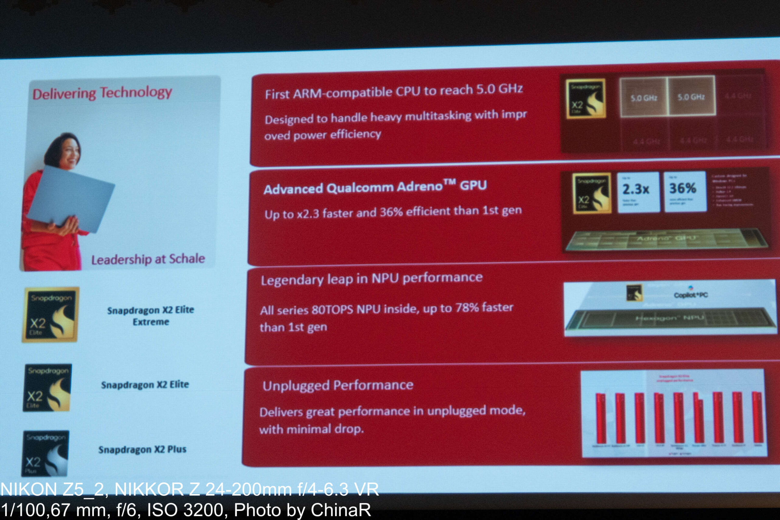 パートナーセッションでは、クアルコムジャパン・コンピュート事業 統括本部長の井田晶也氏が登壇し、Snapdragon X2シリーズの特長を解説しました。NPU性能が前世代の45TOPSから80TOPSへと約78%向上したことに加え、「アンプラグドパフォーマンス」の維持という点がQualcommプラットフォームの一貫した強みであることを力説。従来のレガシーPCがバッテリー駆動時に性能を落とすのに対し、スマートフォン設計をルーツに持つSnapdragon X2はACアダプター非接続状態でもほぼ変わらないパフォーマンスを維持するという仕様は、X2世代でも引き続き踏襲されているとのことです。