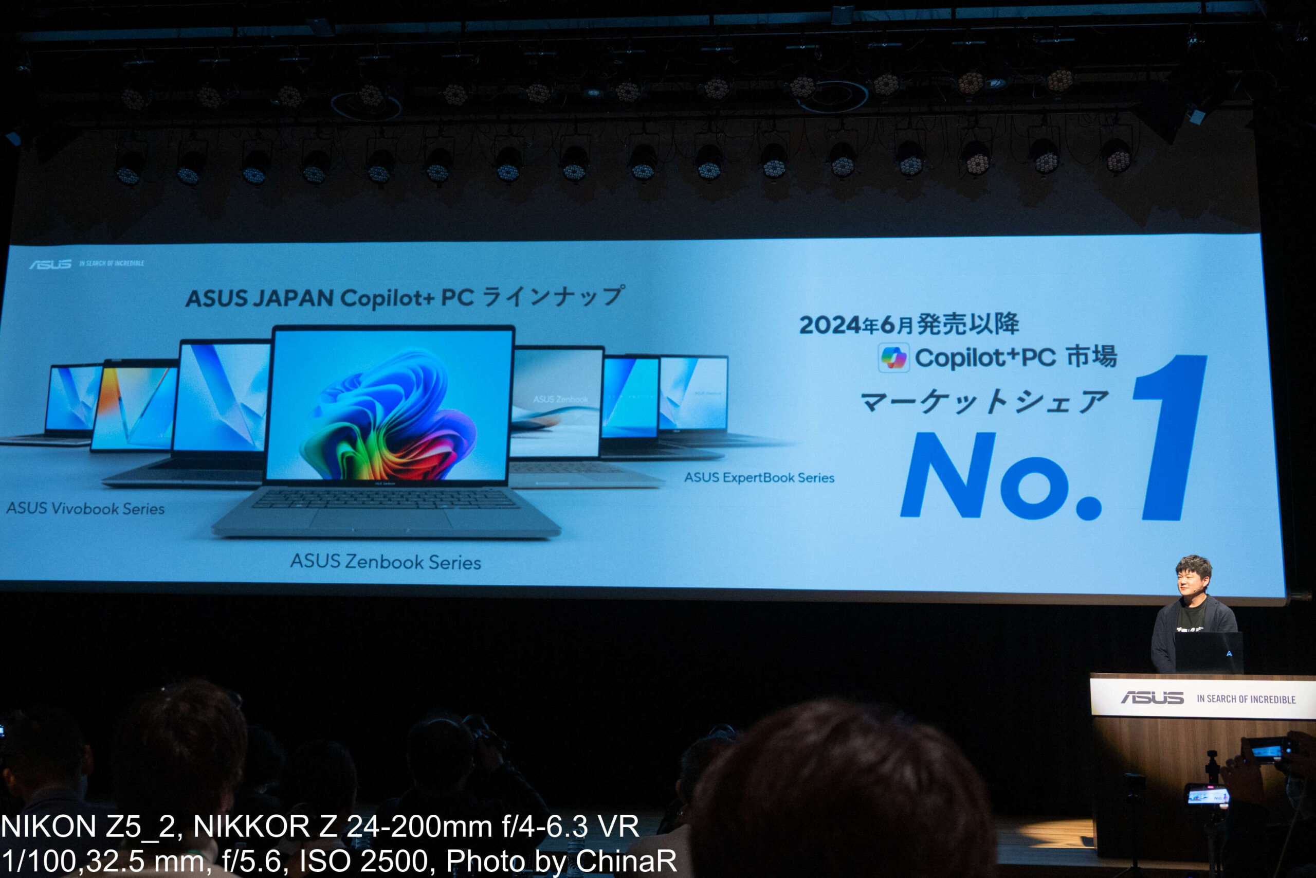 発表会の冒頭では、ASUS JAPAN株式会社・システムビジネスグループ・コンシューマービジネス事業部のDavid Chu氏が登壇。ASUSの製品開発における基本理念である「Start with People(すべては人から始まる)」というフィロソフィーを改めて説明しました。これは、自分たちが心から使いたいと思える製品、そして家族や友人にも安心してお勧めできる製品をユーザーに届けることを信念とする姿勢を示したもの。2025年に投入されたASUS Zenbook SORAはその象徴的な成功例であり、発売以来、国内Copilot+ PC市場において2024年6月からトップシェアを維持し続けているとのことでした。