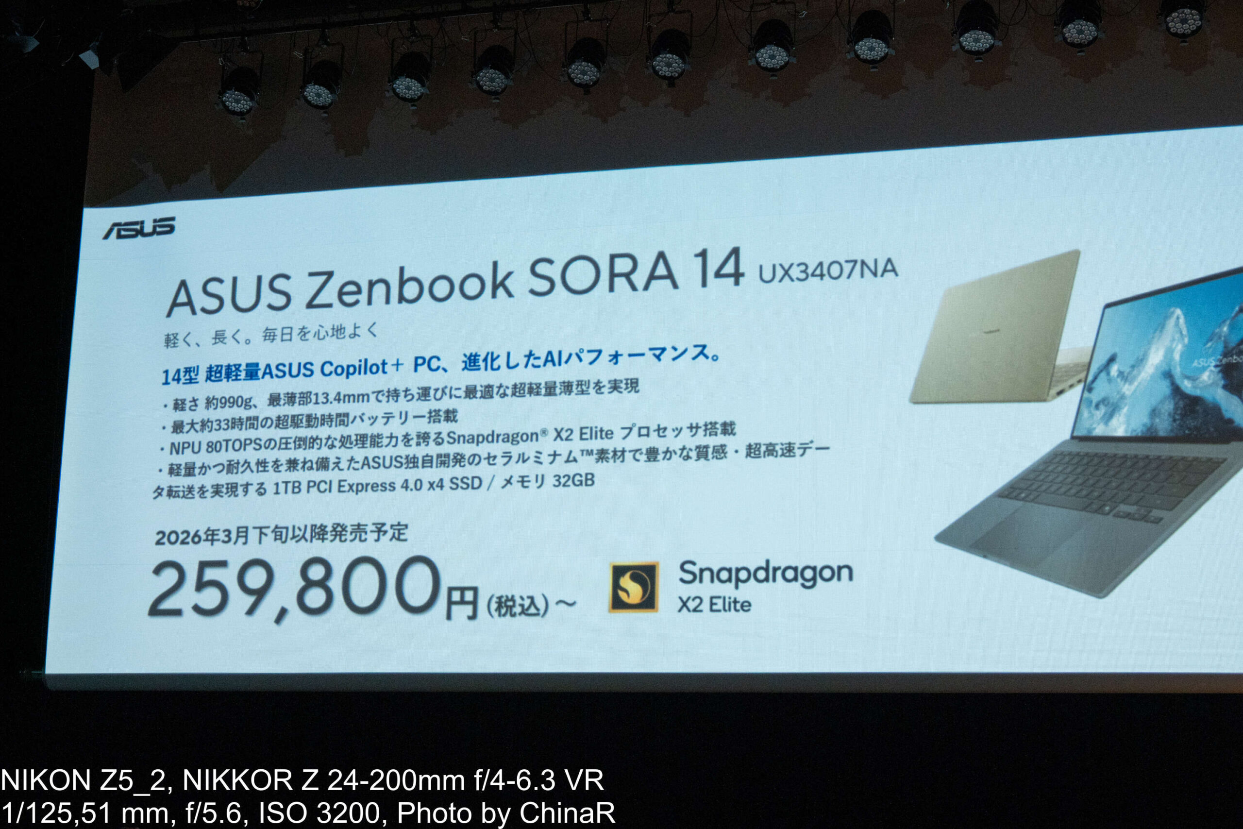 【ASUS 発表会】ASUS Zenbook SORA 16・14登場|16型1.2kg・Snapdragon X2 Elite Extreme・48GB・3K OLED 120Hz・80TOPSのCopilot+ PCが2026年3月25日発売、SORA 14は驚異の33時間駆動を実現