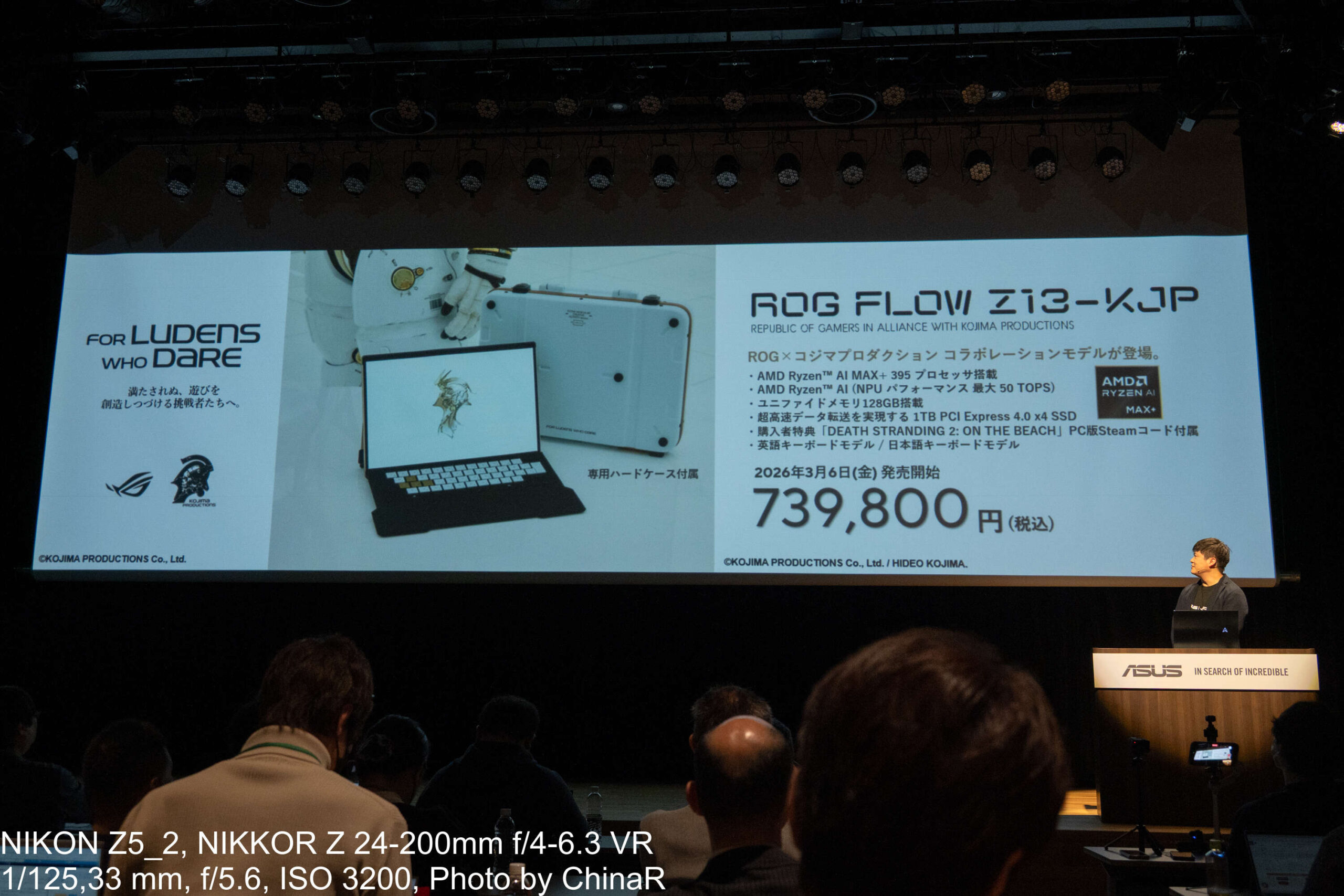 ROG設立20周年を記念したコラボモデルROG Flow Z13 KJP Editionも発表。コジマプロダクションとのコラボレーションで生まれた本製品は、アートディレクター新川洋司氏によるデザインを採用。ROGゲーミングノートPC初となるカーボンファイバー筐体を使用し、AMD Ryzen AI Max+ 395プロセッサーと128GBのユニファイドメモリを搭載。専用ハードケースやROGデルタ2・ROGクリス2・ROGスカバード2の周辺機器コラボも含まれており、2026年3月19日発売予定の「DEATH STRANDING 2 ON THE BEACH」PC版が発売日から利用できる特典も付属。価格は3,739,000円(税込)という、まさにコレクターズアイテムとしての位置づけの製品に仕上がっています。
