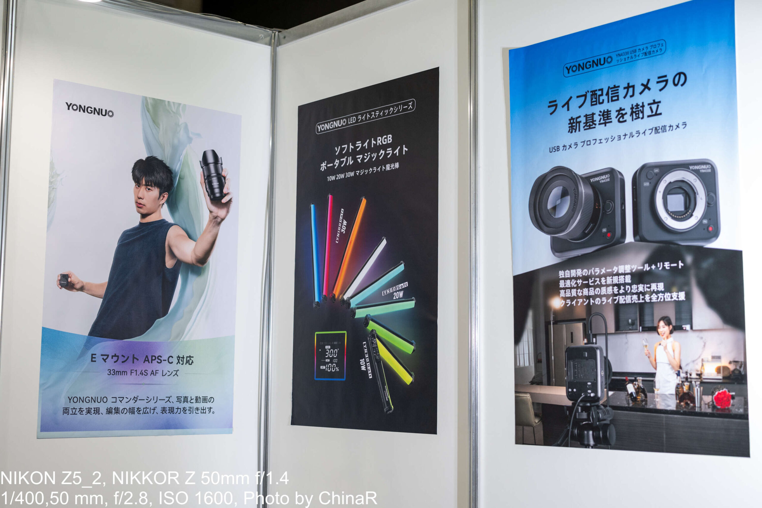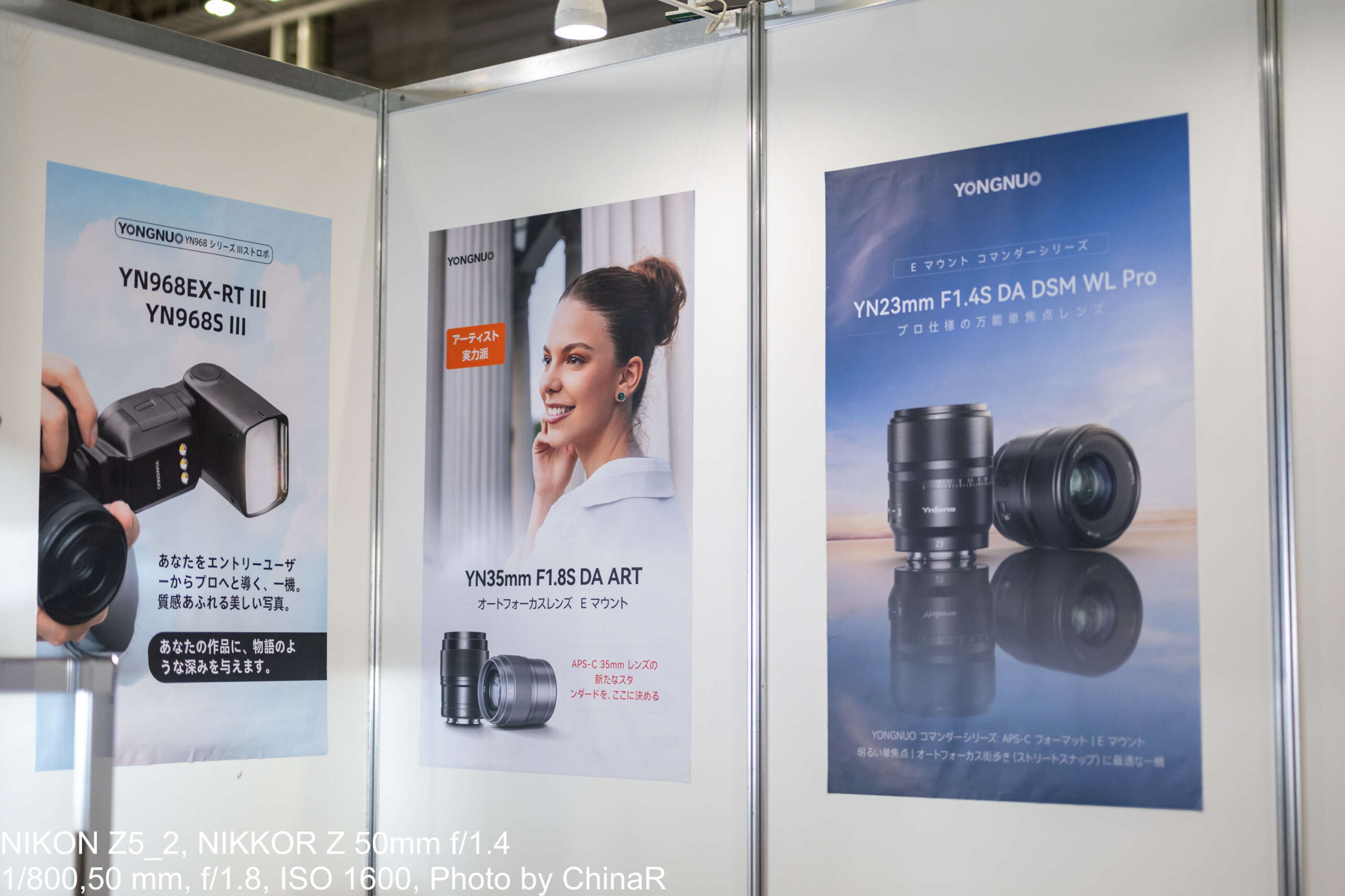 ブース壁面のポスターで特に目を引いたのがソニーEマウントAPS-C向けのラインナップでした。「YONGNUOコマンダーシリーズ」として展開するYN35mm F1.8S DA ARTには「アーティスト実力派」「APS-C 35mmレンズの新たなスタンダード」というキャッチコピーが。またYN23mm F1.4S DA DSM WL Proは「プロ仕様の万能単焦点レンズ」として街歩き・ストリートスナップ向けに訴求していました。33mm F1.4S AFもポスターに掲示されており、「写真と動画の両立を実現、編集の幅を広げ、表現力を引き出す」というコマンダーシリーズとしての訴求が行われていました。