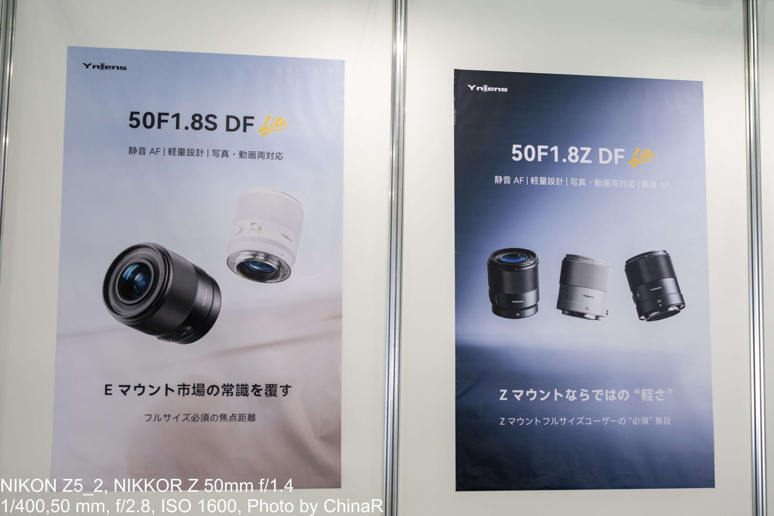 今回のCP+2026でYongnuoが最も前面に打ち出していたのが「Ynlens 50F1.8Z DF Lite」(Nikon Zマウント対応)と「Ynlens 50F1.8S DF Lite」(ソニーEマウント対応)の2本。ブース壁面には大判ポスターが掲示されており、Zマウント版には「Zマウントならではの”軽さ”」、Eマウント版には「Eマウント市場の常識を覆す」というコピーが添えられていました。静音AF・軽量設計・写真動画両対応・高速AFを特徴として訴求しています。