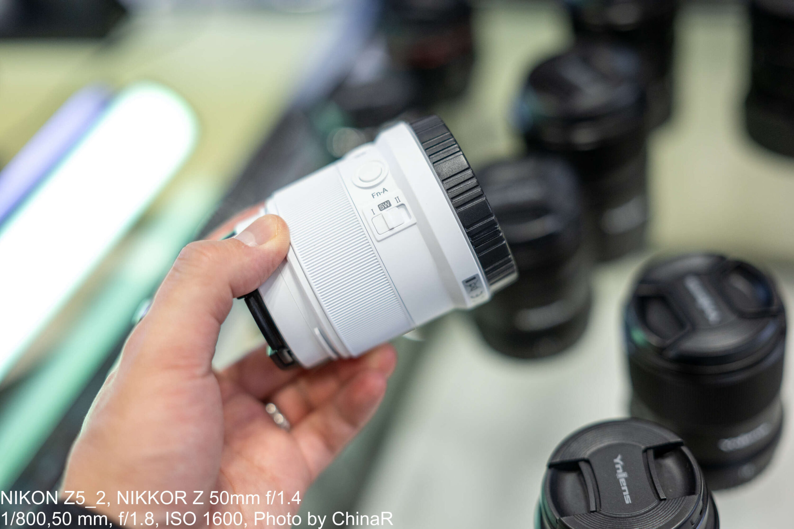 Ynlens 50F1.8Z DF Liteを実際に手に取って確認したところ、Zマウント版の50F1.8Z DF Liteは鏡筒上部に「Fn-B」「Fn-A」の2つのファンクションボタンと「AF/MF」切り替えスイッチが搭載されており、操作性をしっかり確保した仕様です。AF/MF切り替えスイッチ部分に「SW」と記載されているのがYN85mm F1.8Z DF DSMとの違いです。