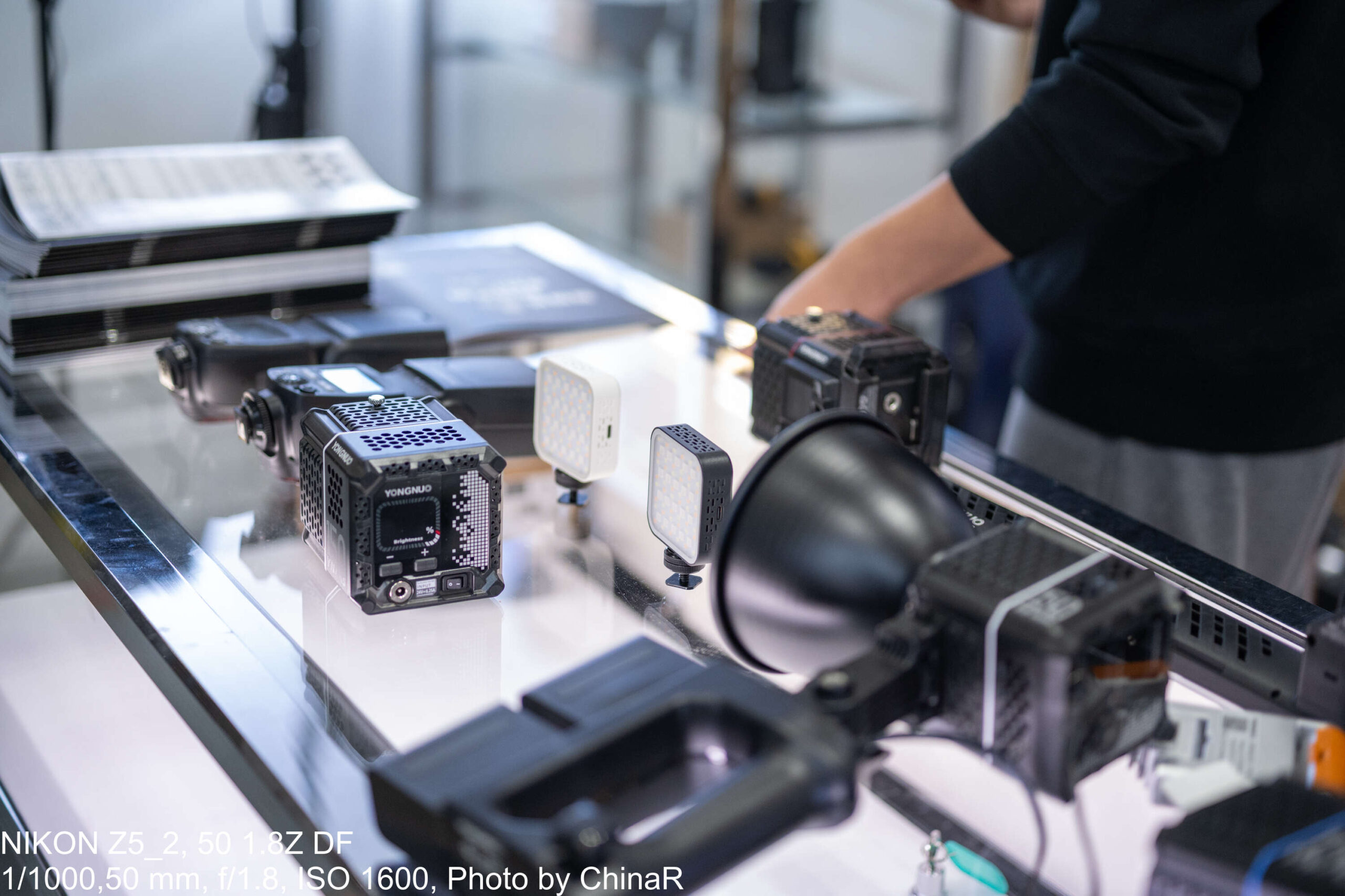 Yongnuoはレンズ・ストロボに留まらず、LED照明・ライブ配信カメラという新カテゴリにも積極的に展示スペースを割いていました。展示台の照明エリアには「YONGNUOロゴ入りの小型LEDキューブライト」(ドット状の放熱パターンが特徴)、白い小型LEDパネル、大型の放物面型ディフューザー付き照明機材が整列配置されており、スライダーレールや各種ケーブルも展示されていました。