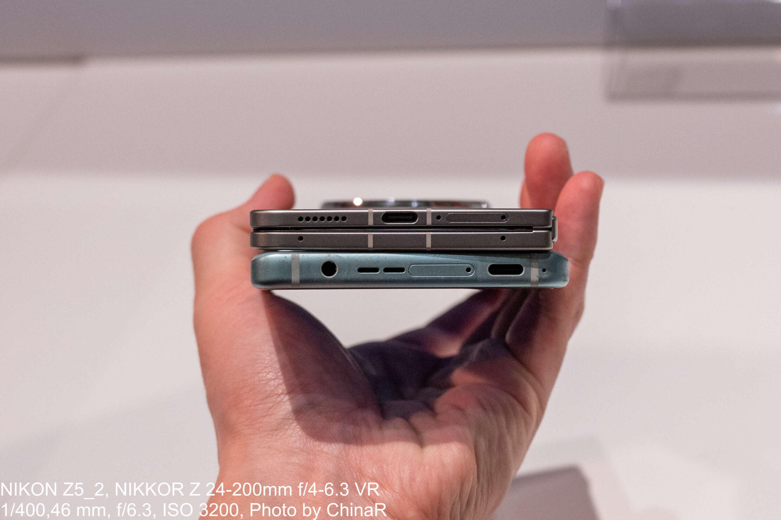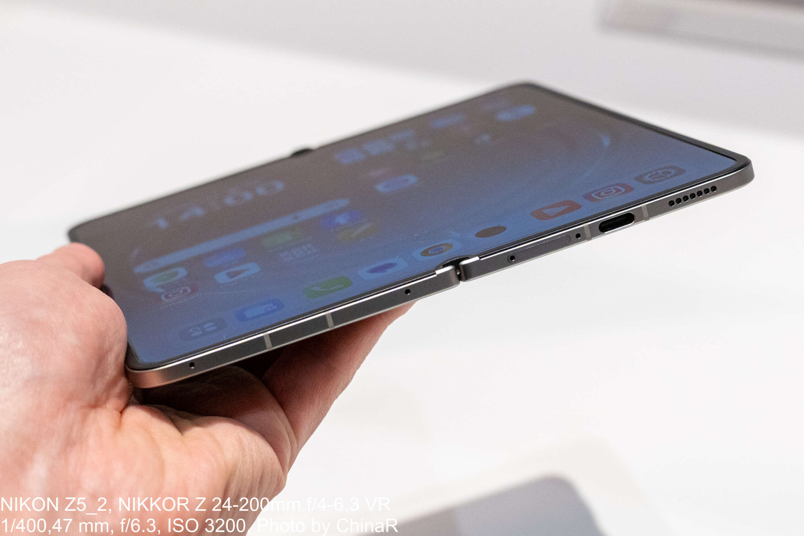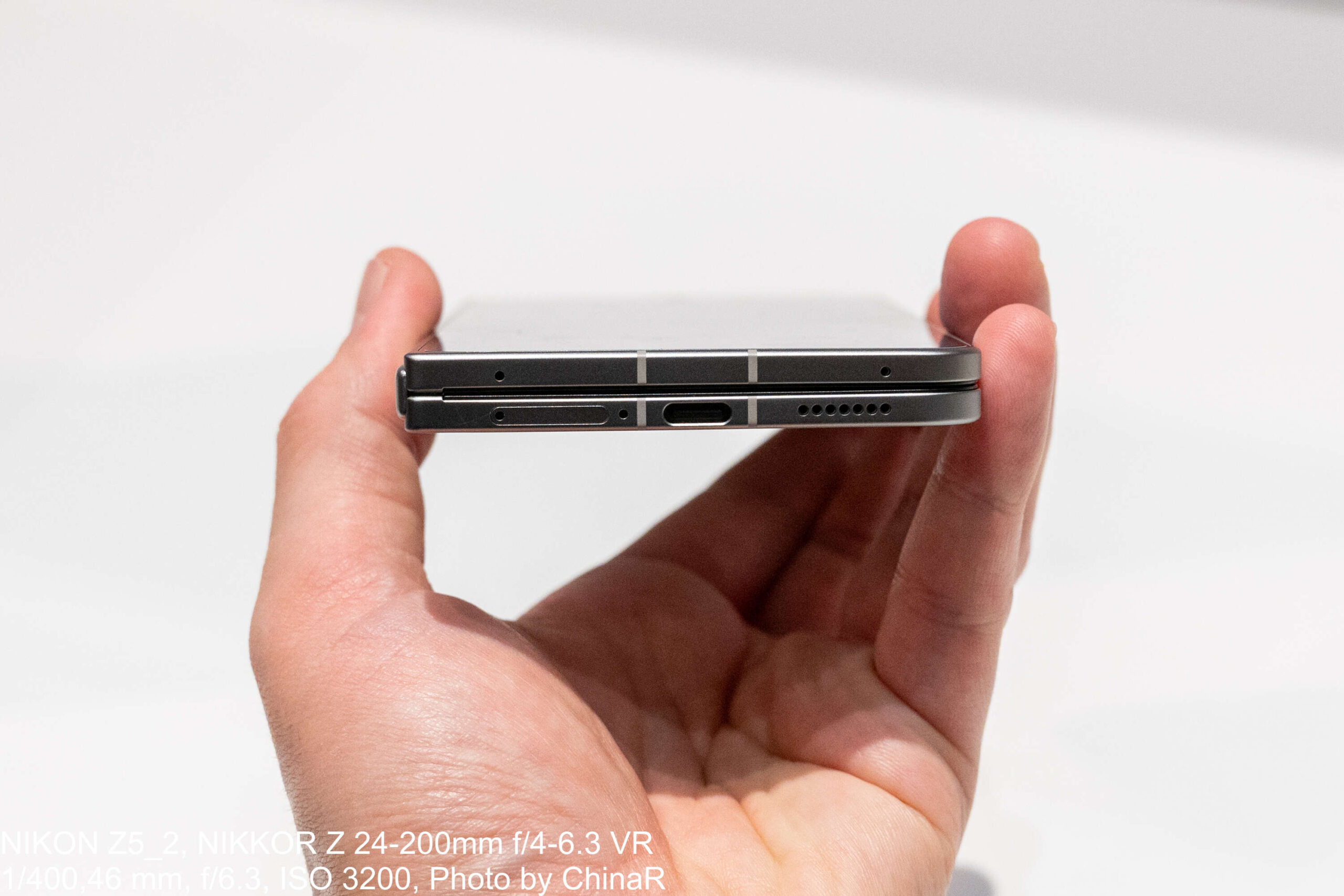 タッチ&トライで閉じた状態の端末を横から眺めると、USB-Cポート周辺の薄さには驚かされます。手に持った感触は折りたたみスマートフォンというよりも、ちょっと大きめのストレート端末に近い印象で225gという数値以上に軽く感じる仕上がりに驚かされました。