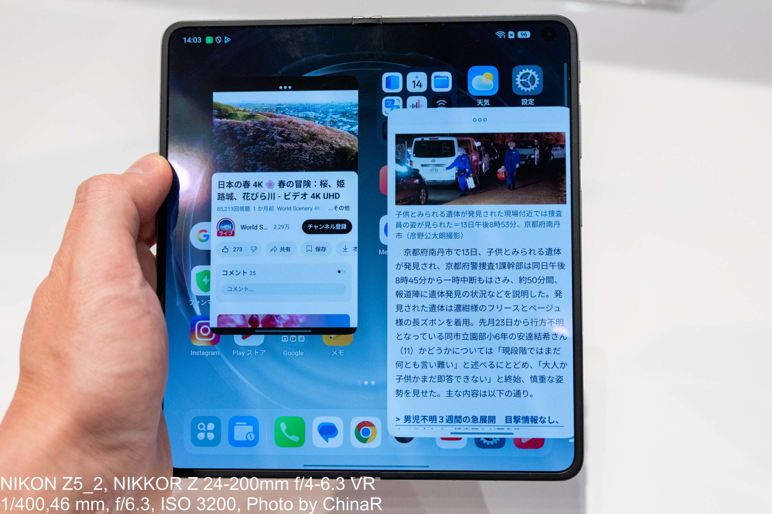 カバースクリーンは約1.4mmの極細ベゼルで没入感の高い表示を実現。タッチ&トライで閉じた状態のカバースクリーンを操作してみても普通のスマートフォンとまったく同じ感覚で使うことができ、折りたたみであることを忘れるほどの自然さでした。TÜV Rheinland Intelligent Eye Care 5.0認証と高周波PWM調光によるアイケア機能も搭載しています。