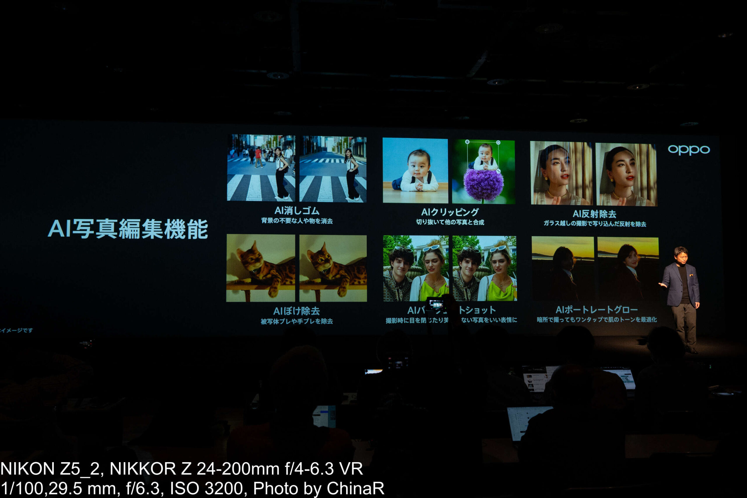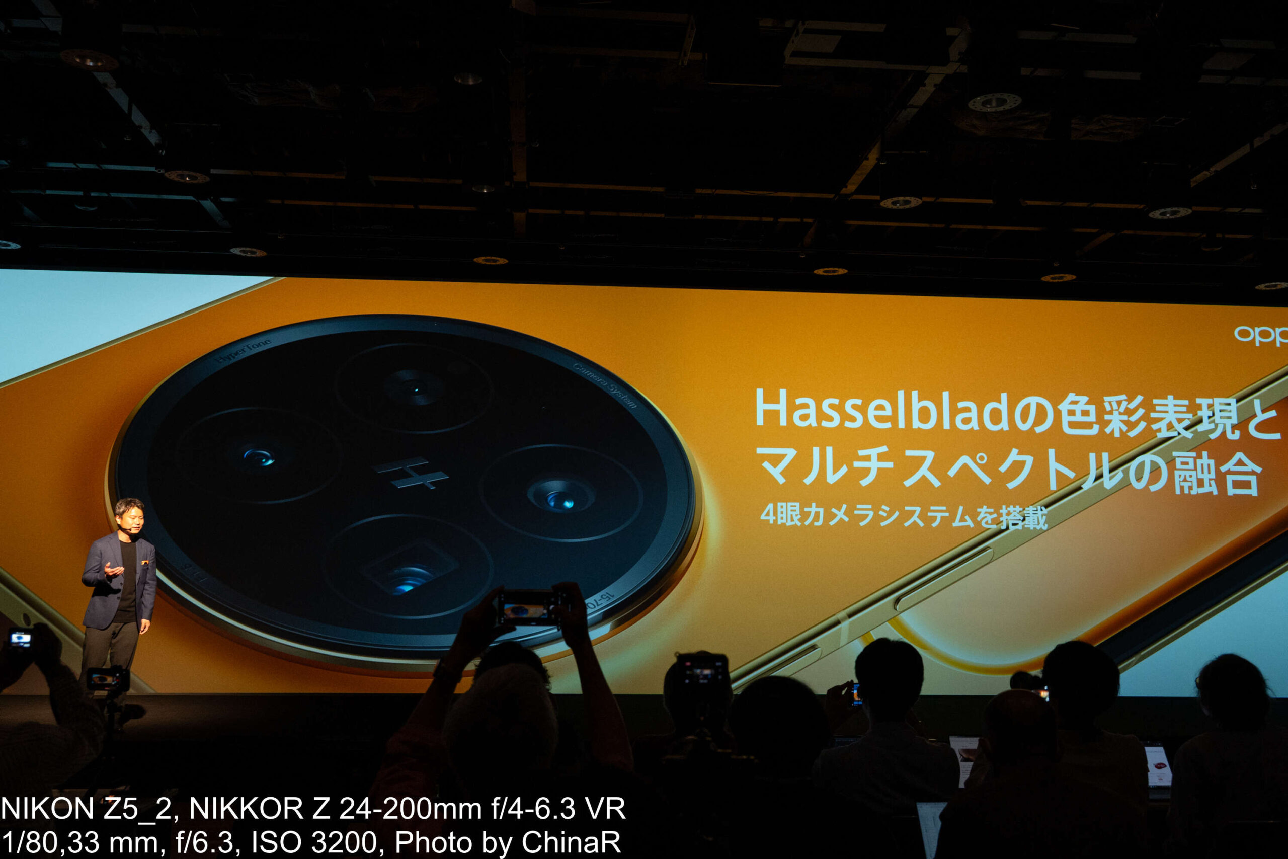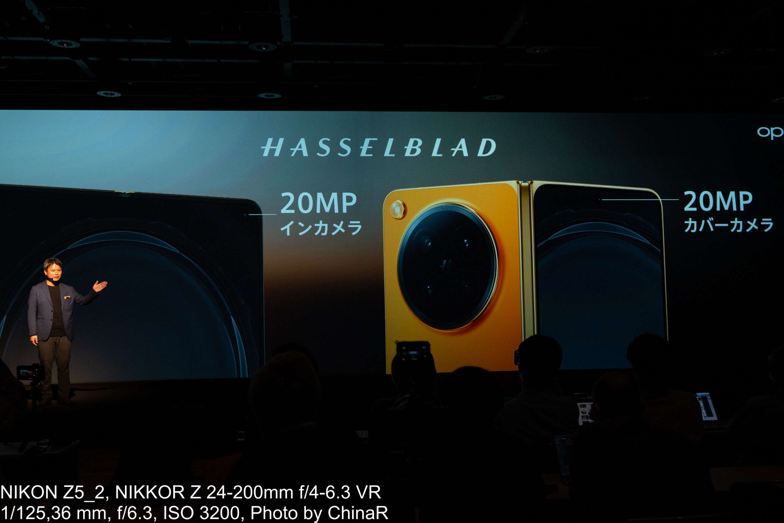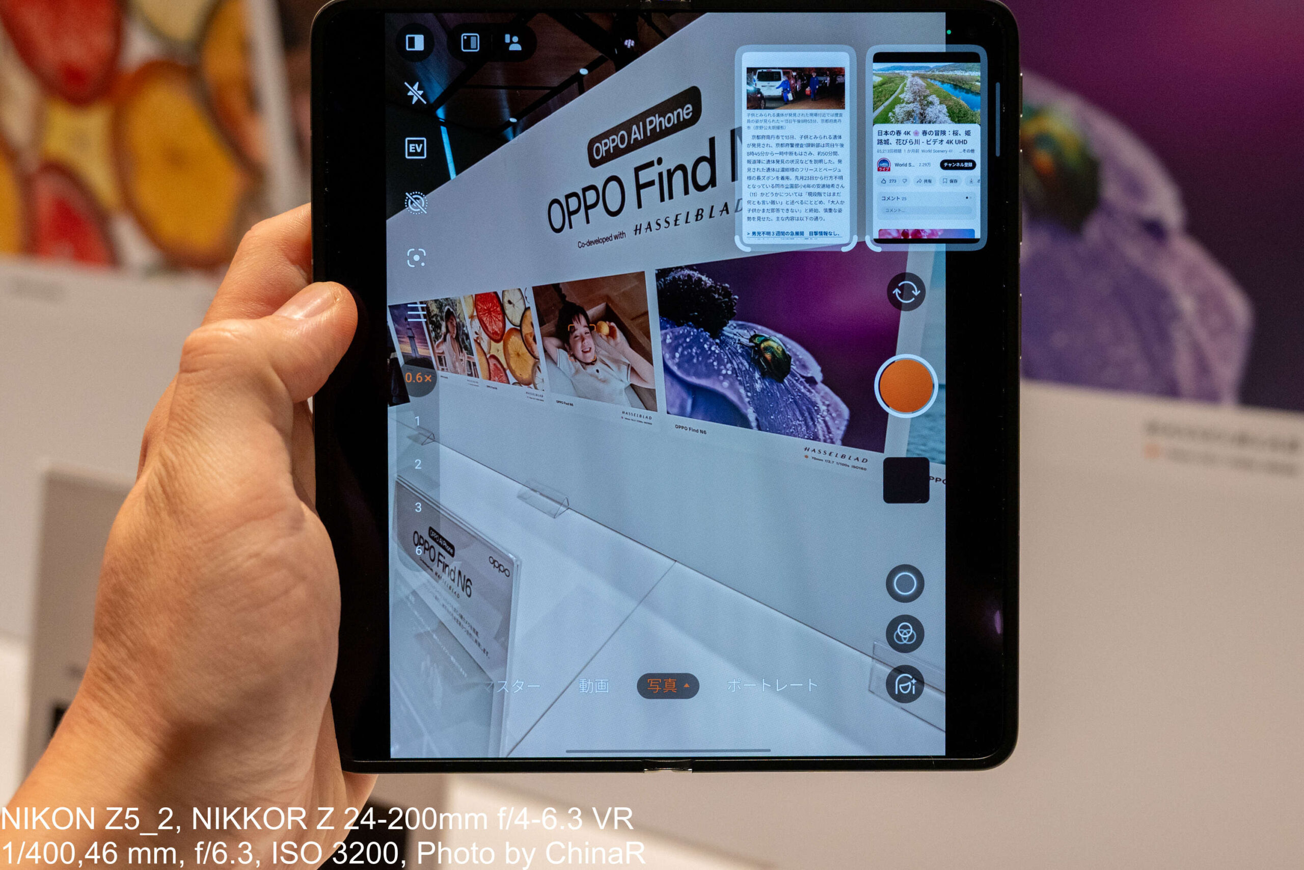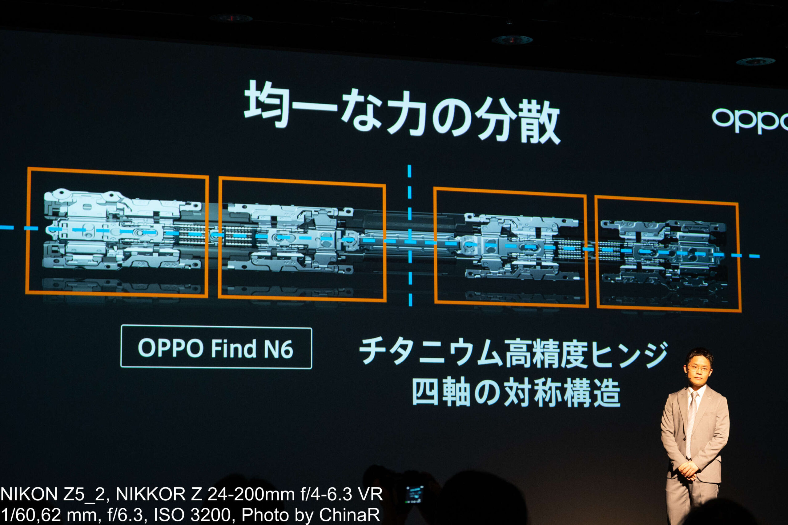 カメラシステムの説明はプロダクトマネージャーの中川裕也氏が担当しました。OPPO Find N6はHasselbladの色彩表現とOPPOのマルチスペクトルカラー技術を融合させた新世代の四眼カメラシステムを搭載しています。広角カメラは約2億画素でF1.8、OIS対応、1/1.56インチの大型センサーを採用。望遠は約5,000万画素のペリスコープ構造でOIS対応、光学3倍ズームに最大AI120倍、最短10cmのマクロ撮影にも対応。超広角が約5,000万画素で画角120度と充実したカメラを搭載しています。