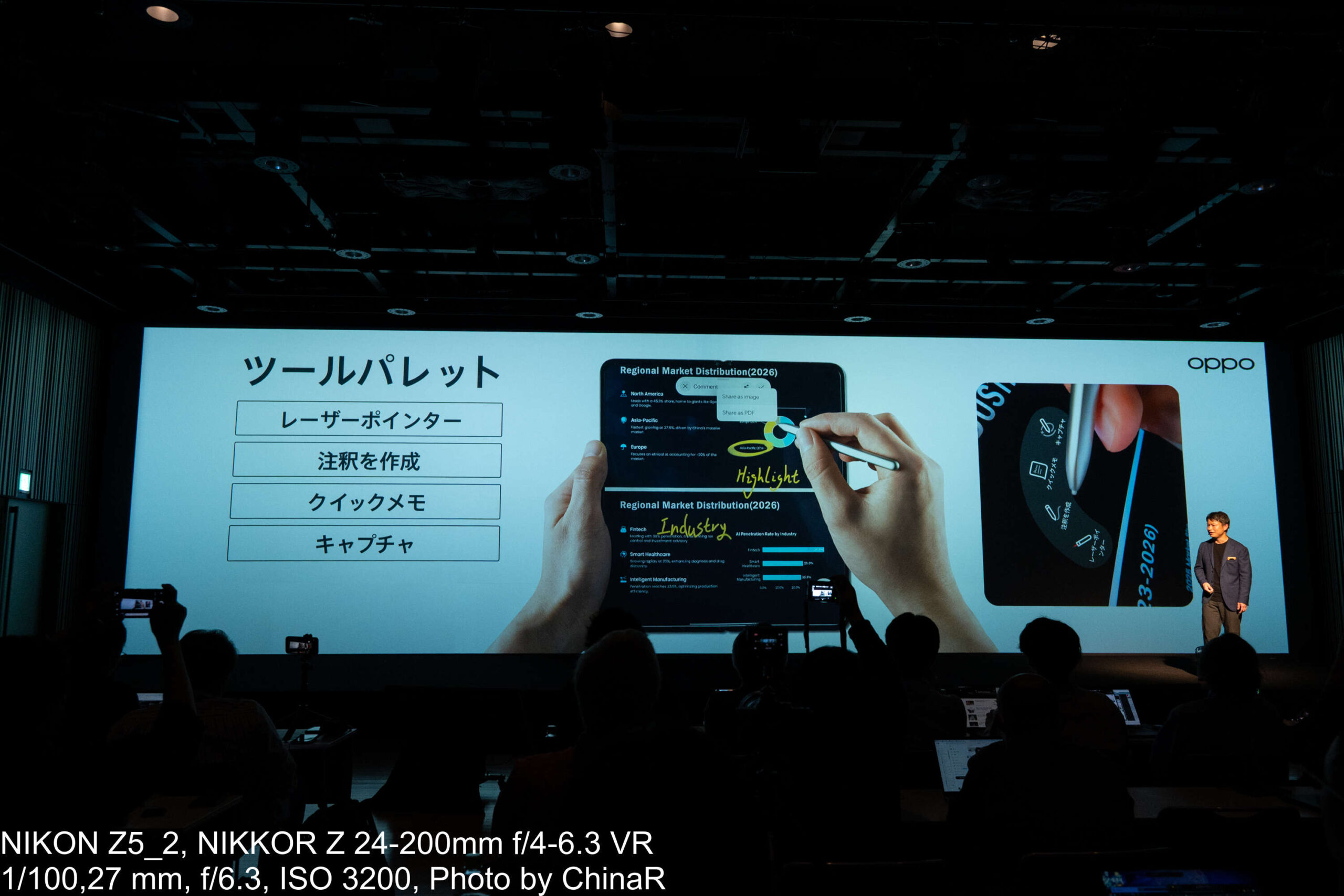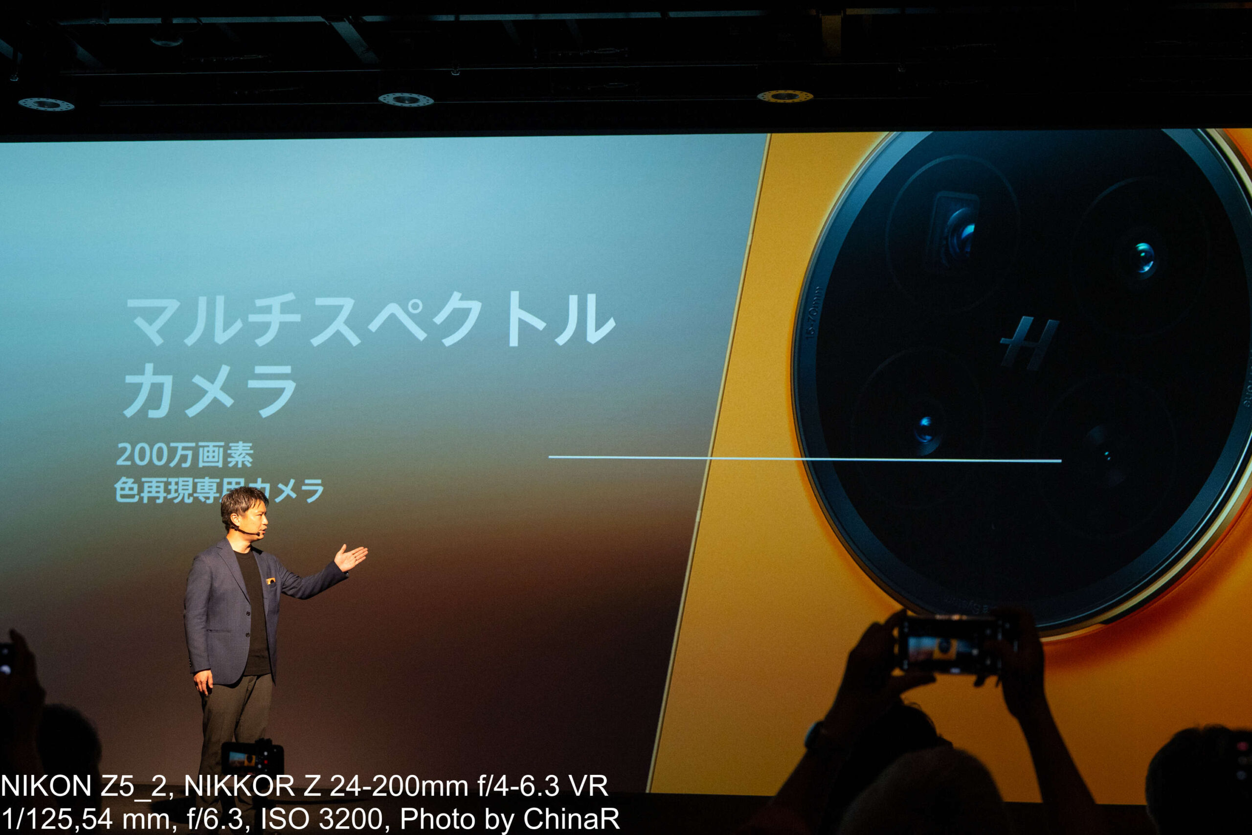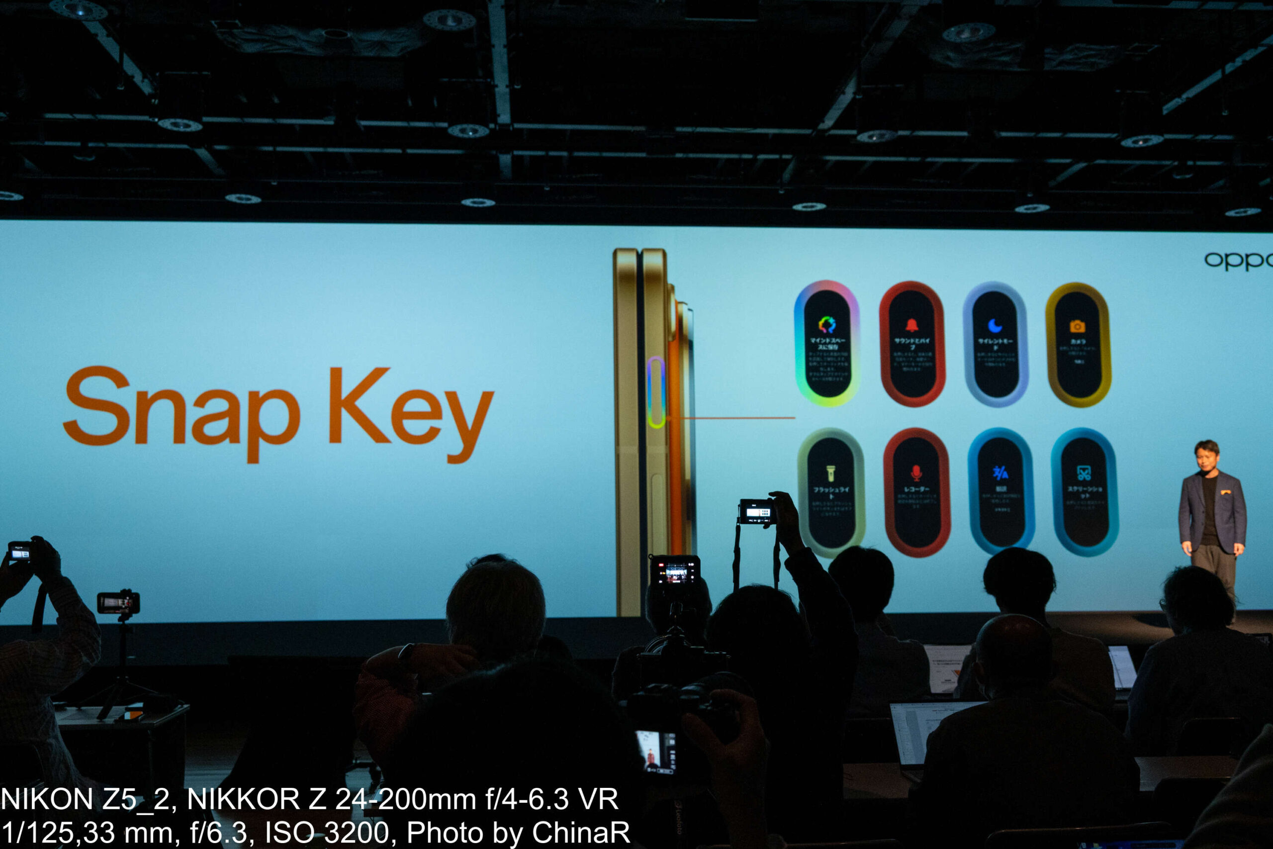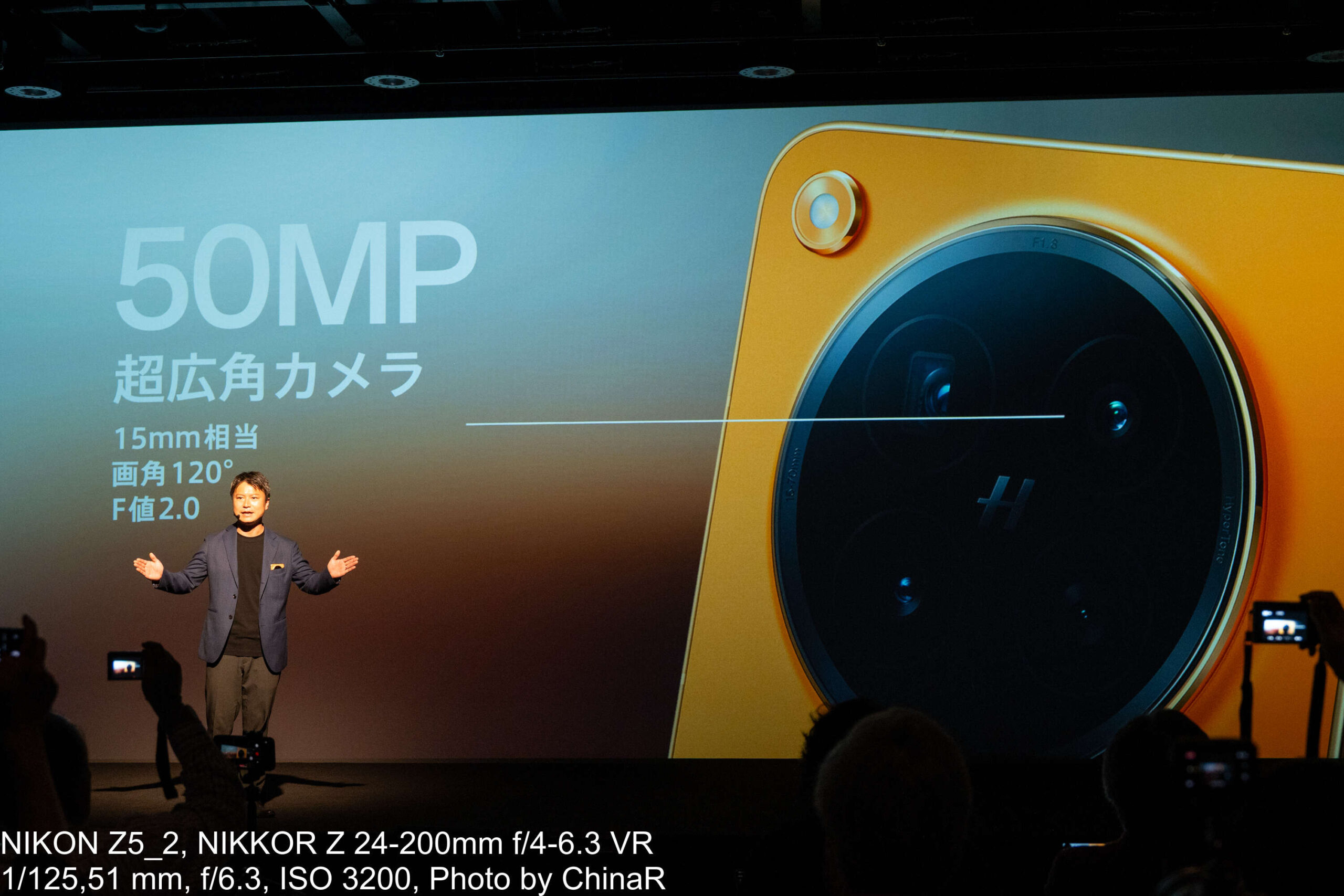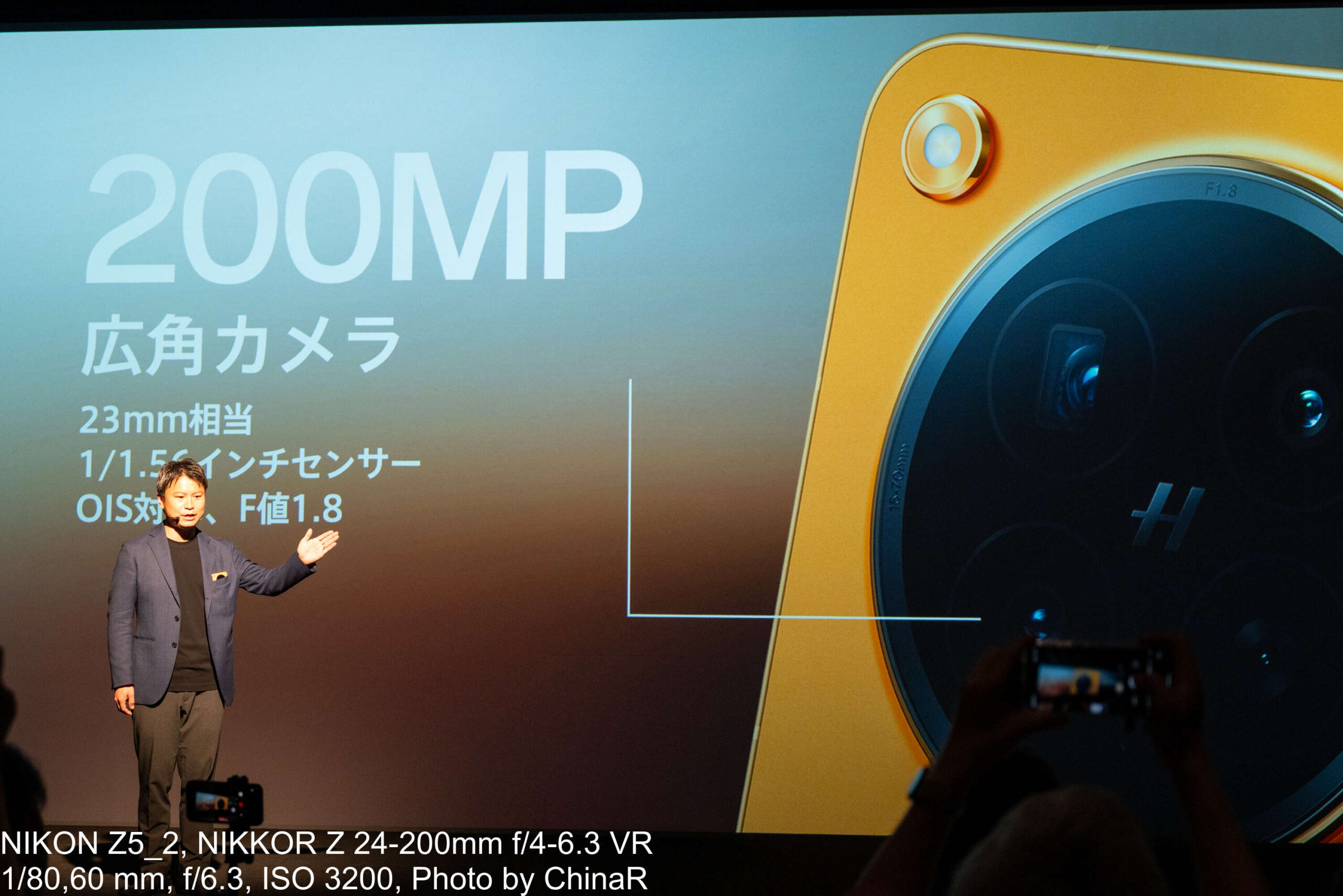 カメラシステムの説明はプロダクトマネージャーの中川裕也氏が担当しました。OPPO Find N6はHasselbladの色彩表現とOPPOのマルチスペクトルカラー技術を融合させた新世代の四眼カメラシステムを搭載しています。広角カメラは約2億画素でF1.8、OIS対応、1/1.56インチの大型センサーを採用。望遠は約5,000万画素のペリスコープ構造でOIS対応、光学3倍ズームに最大AI120倍、最短10cmのマクロ撮影にも対応。超広角が約5,000万画素で画角120度と充実したカメラを搭載しています。