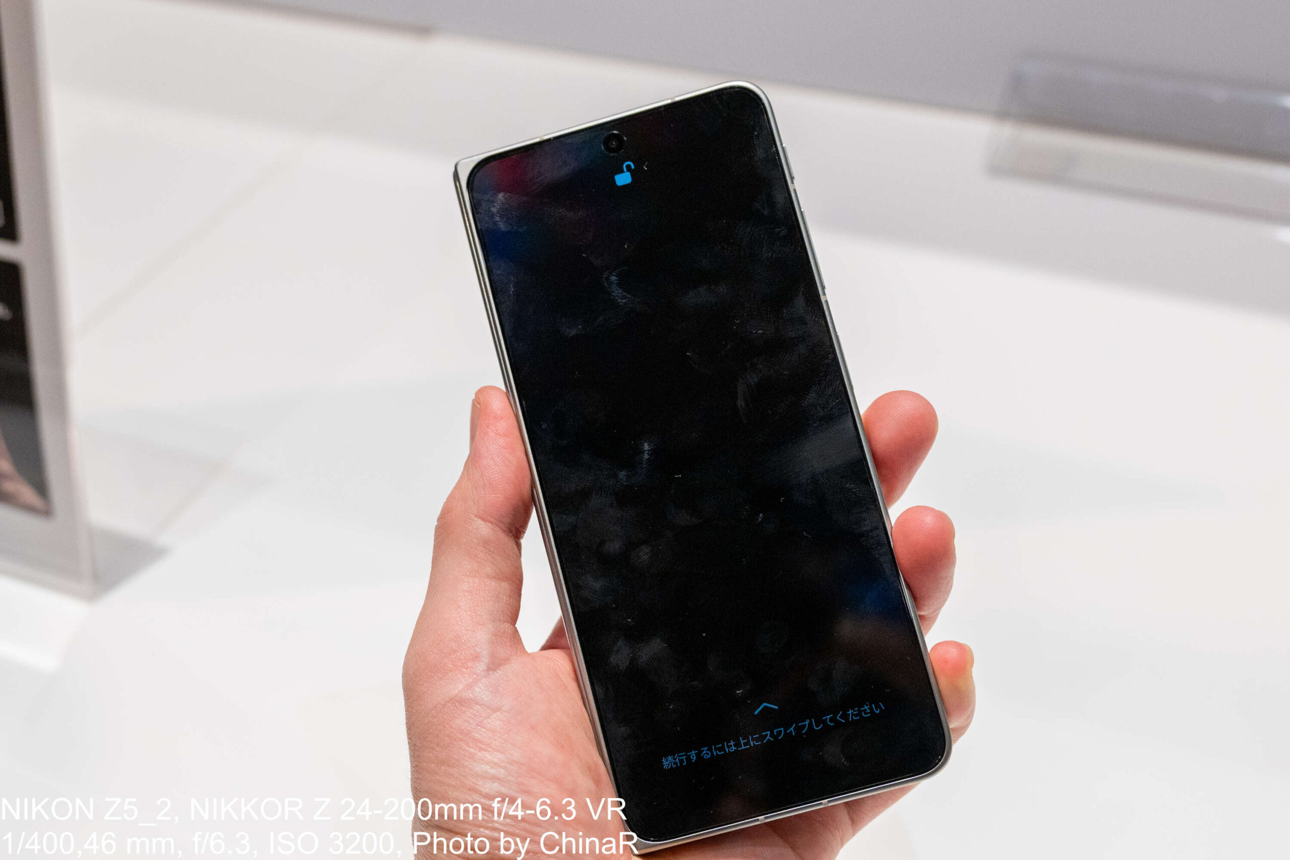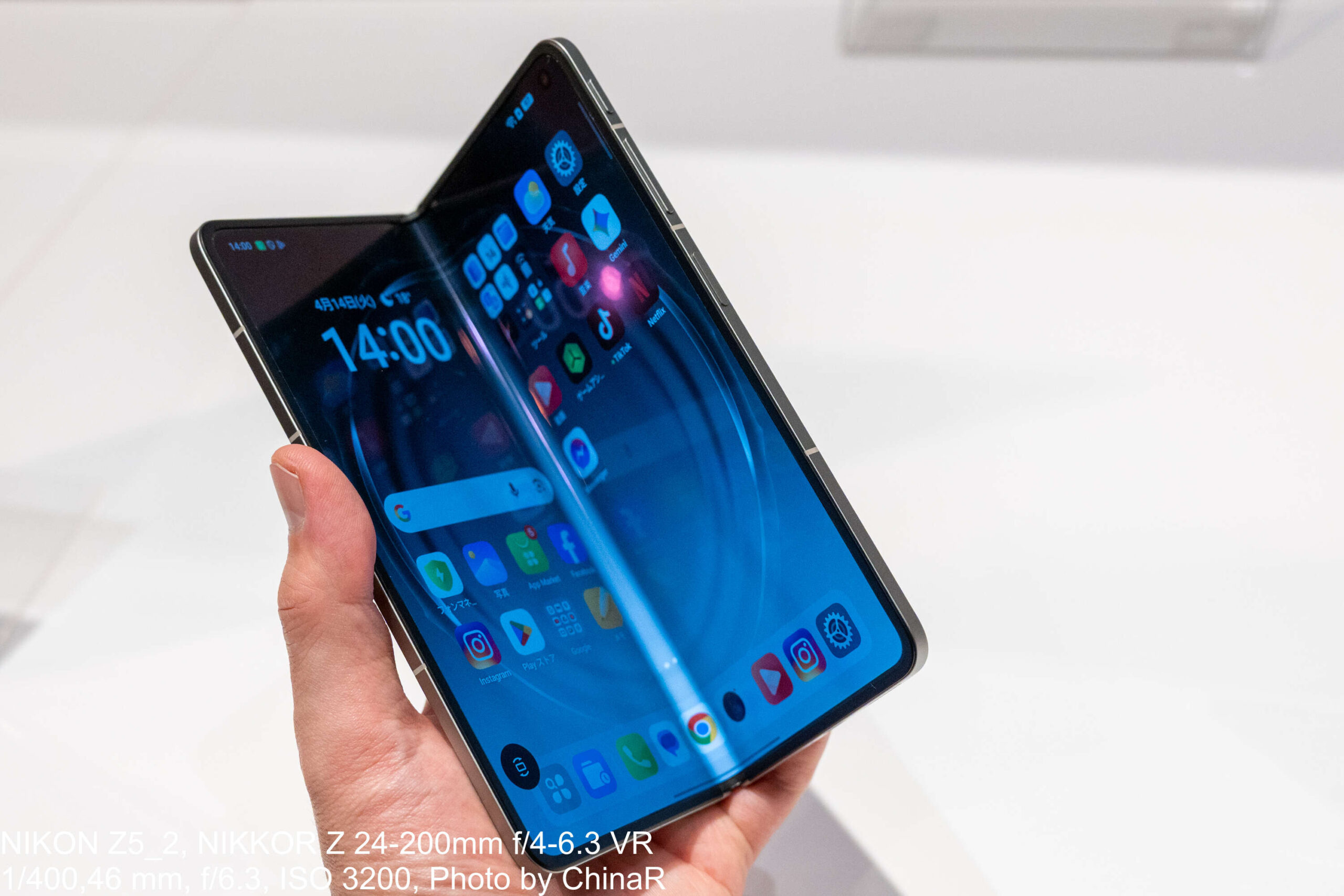 発表後のタッチ&トライで実機に触れてみたところ、メインスクリーンを開いた瞬間の印象はまさにフラットの一言。指で折り目付近をなぞっても凹凸がほとんど感じられず、従来の折りたたみスマートフォンとは明らかに違う仕上がりでした。