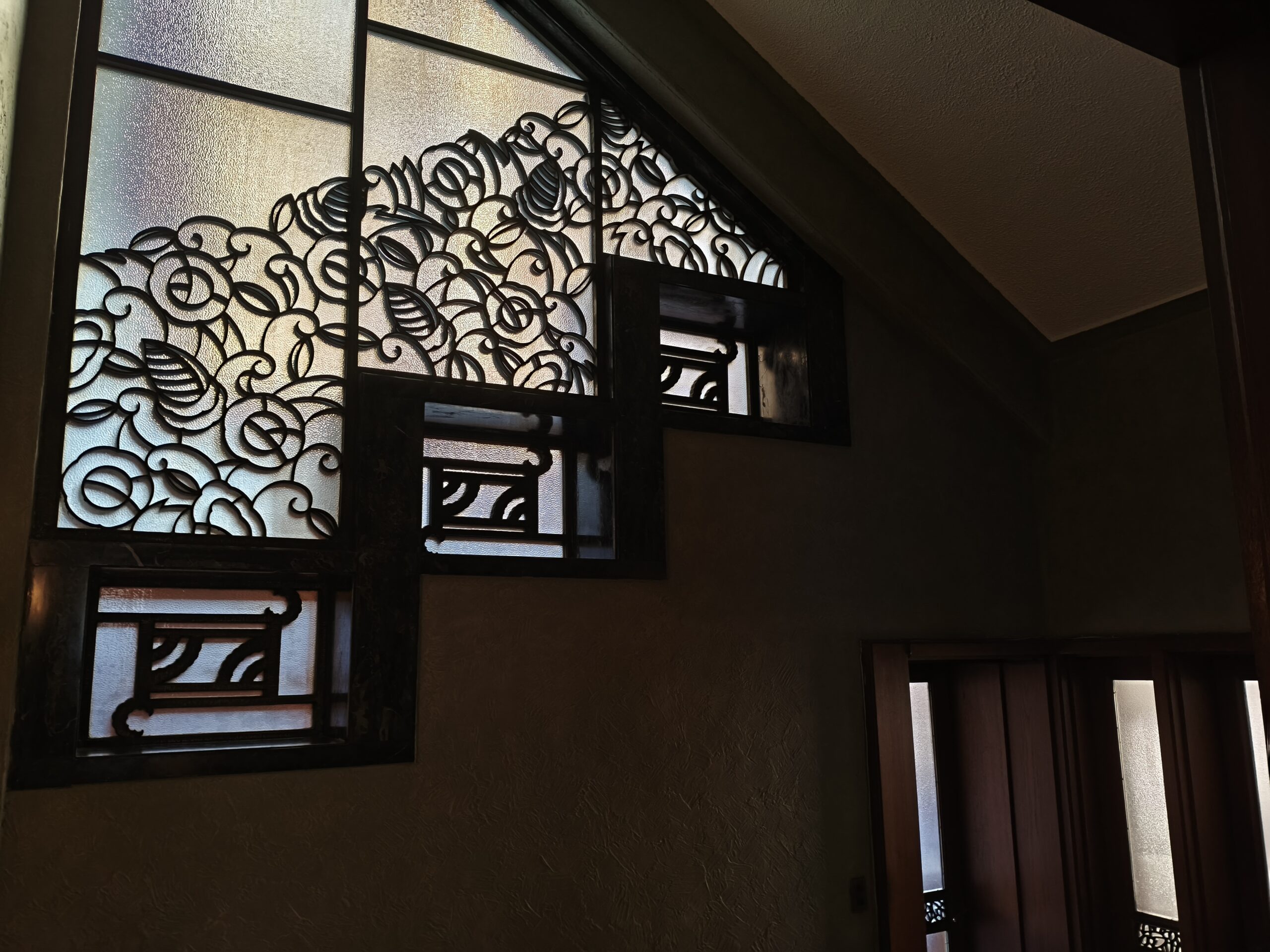 特に印象的だったのが、階段下からアール・デコ様式のガラス窓装飾を見上げて撮影した一枚です。明暗差の激しい構図ながら、ガラス窓の緻密な幾何学模様と質感を非常にシャープに描写してくれています。暗い室内側のディテールも潰れすぎず、装飾の美しさを際立たせる仕上がりに。決まる構図ではメインカメラがしっかり高いポテンシャルを発揮してくれることを確認できました。
