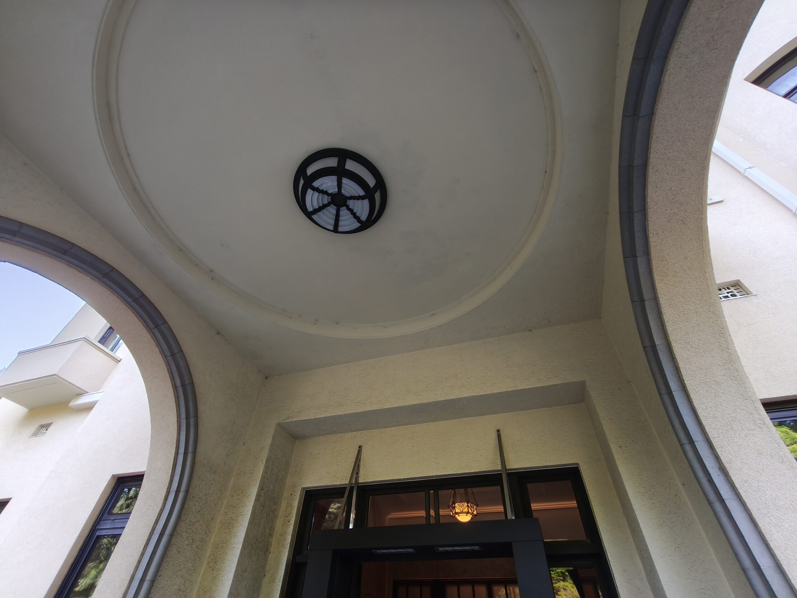 正面玄関ポーチの天井を超広角で撮影してみたところ、湾曲が抑えられた素直な描写が確認できました。白壁の細かな質感や照明の金属パーツのディテールがしっかり残っており、超広角レンズとしての完成度は十分なレベル。