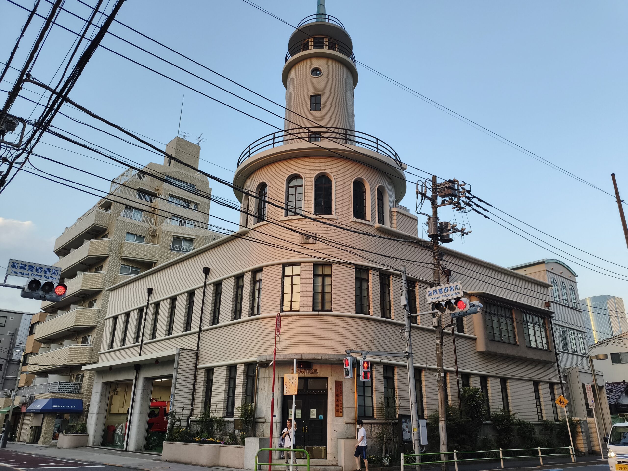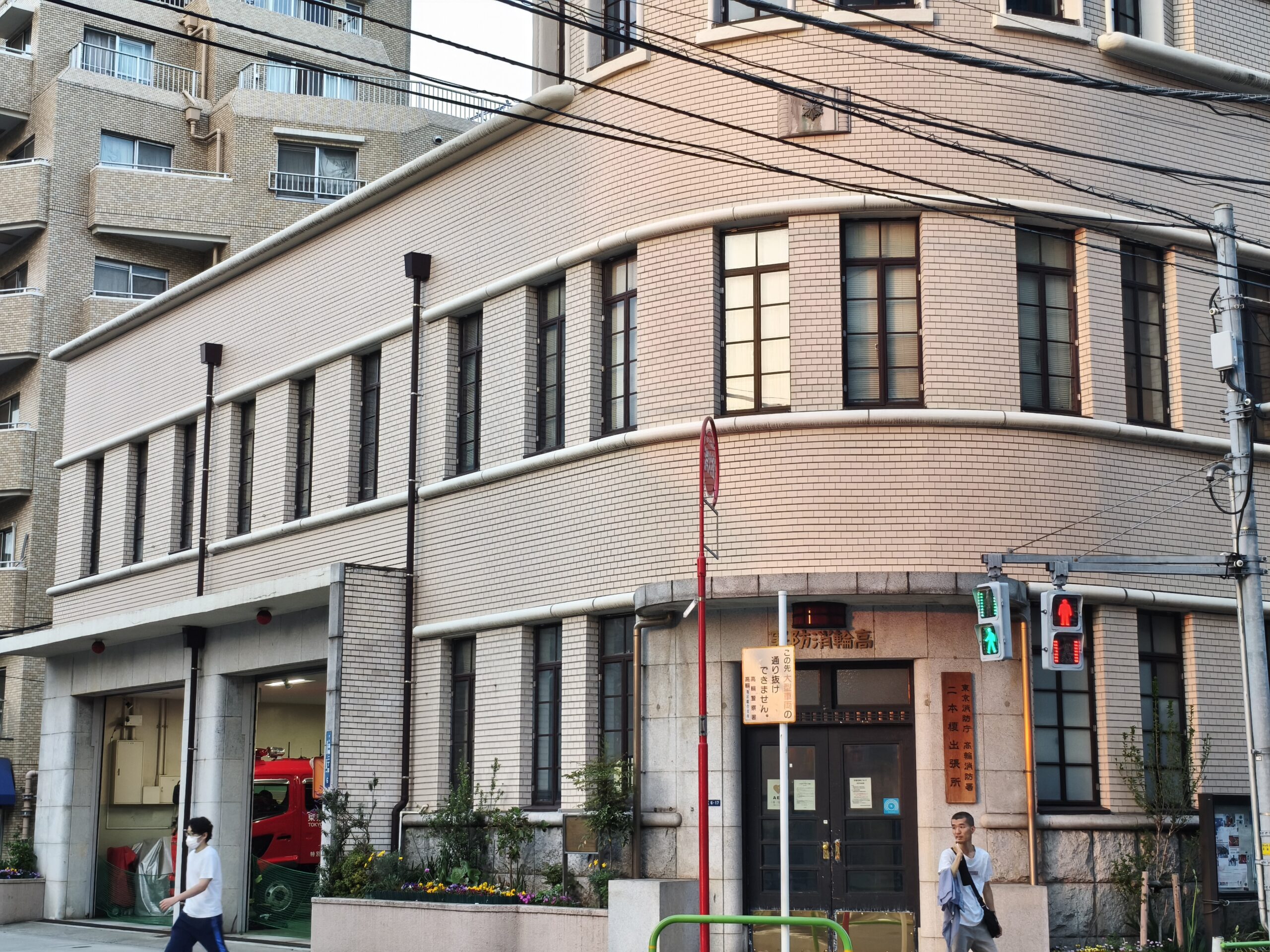 そのまま高輪エリアに足を伸ばし、高輪消防署二本榎出張所に到着したのは夕焼けがほのかに建物をオレンジ色に染める時間帯。ここではメインレンズと50mm付近のズームで撮り比べてみました。広角での撮影では、夕焼けの柔らかなオレンジ色がベージュのタイル壁に美しく反映されており、タイル一枚一枚の境界まで識別できる解像感を確保しています。