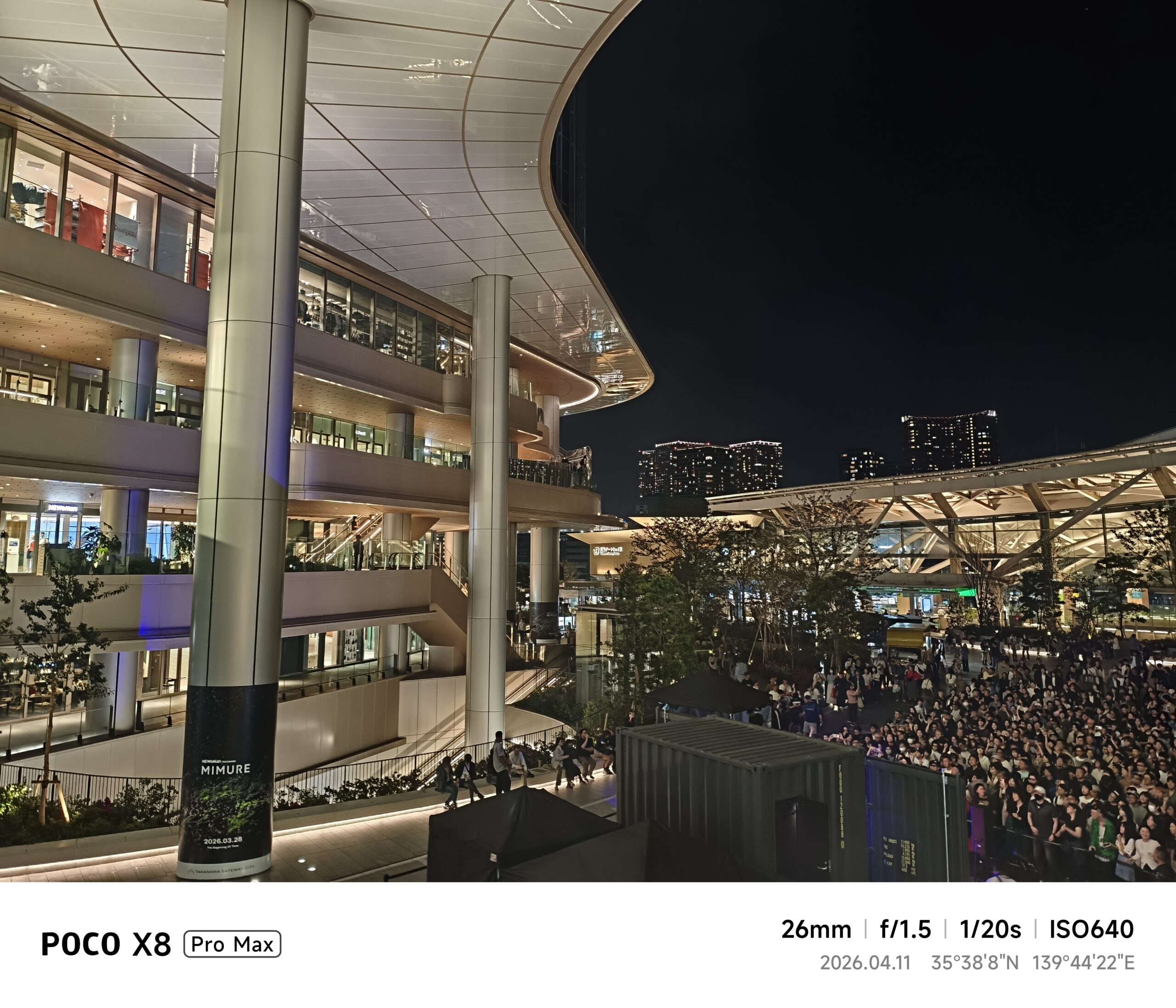 夜間撮影の検証として、高輪ゲートウェイ駅周辺に繰り出してきました。NEWoManの4Fから駅前広場方面を26mm相当で撮影したところ、夜間の複雑な光源下でも駅舎の明るい部分と観客の暗い部分をバランス良く収めることができました。バックライトの強い案内板の白飛びも上手く抑え込んでくれており、HDRの優秀さを夜の難しい光線条件でも実感できる結果に。ただし暗所ゆえに、エッジのシャープネス強調がやや目立つ傾向もありました。