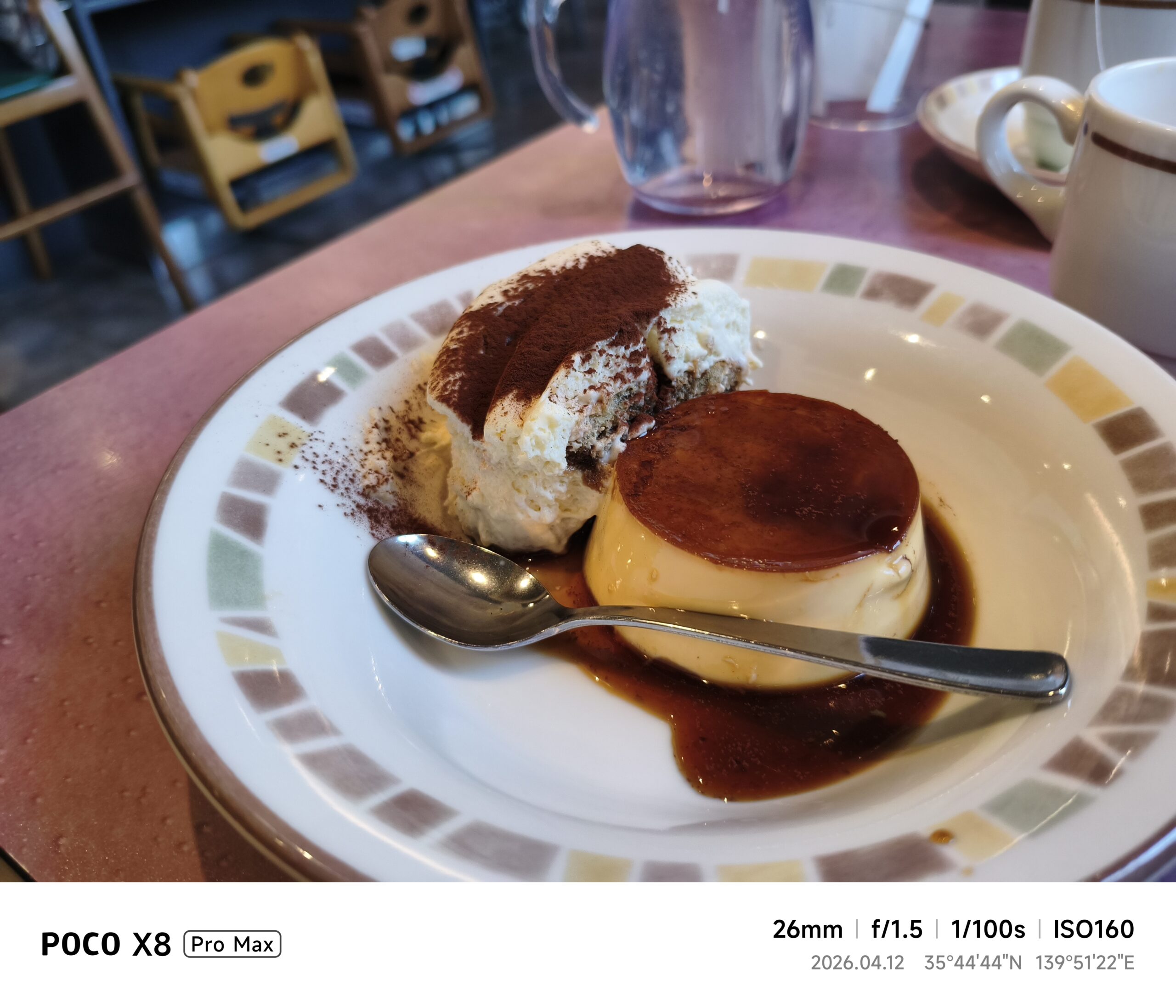飲食シーンでも何枚か撮影してきました。サイゼリヤのプリンを撮ってみたところ、f/1.5の絞り値による背景のボケ味は綺麗に出ているものの、カラメルソースの彩度が強調されすぎており、やや派手な発色になってしまう傾向が見られました。料理を実物以上に美味しそうに見せるという意味では効果的かもしれませんが、ナチュラルな色味を求める場合には少し主張が強い印象。