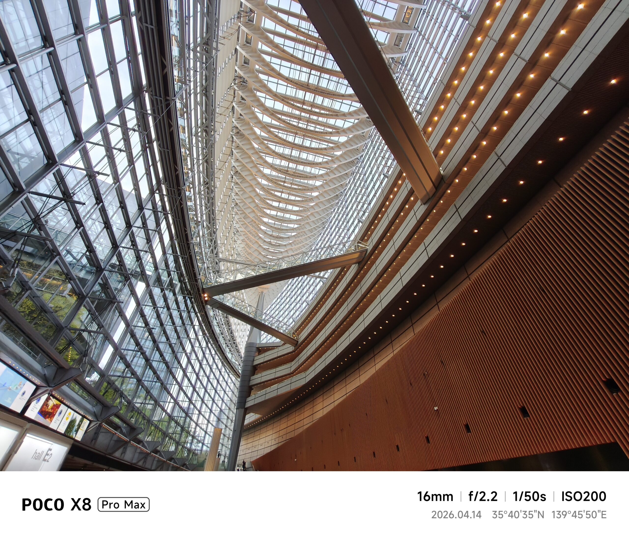 最終チェックとして訪れたのは東京国際フォーラム。ガラスホールの天井を見上げて16mm(超広角)で撮影すると、ガラスの透明感と木目の温かみを一枚に凝縮できました。パースの歪みが少なく、巨大建築のスケール感をダイナミックに切り取ってくれる仕上がり。