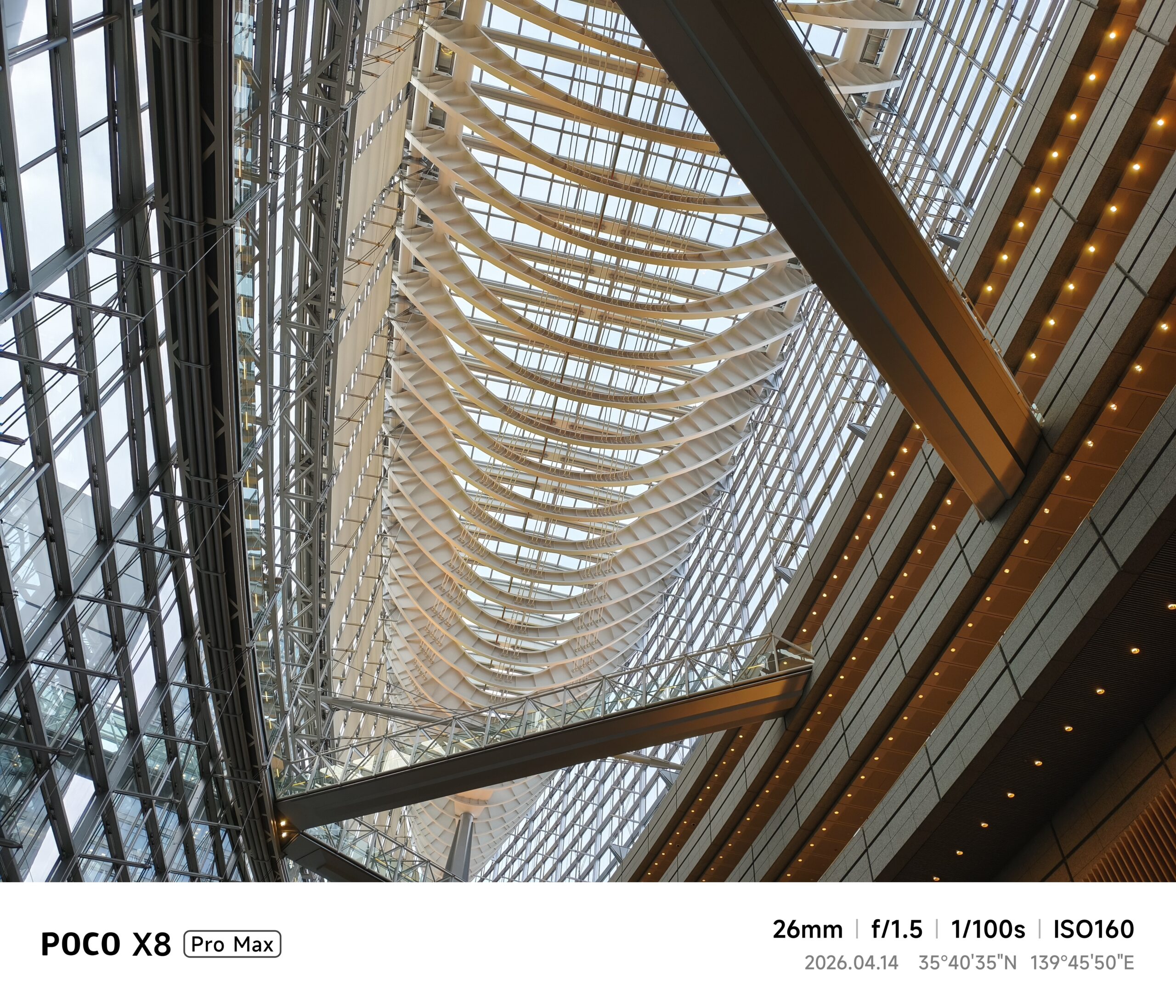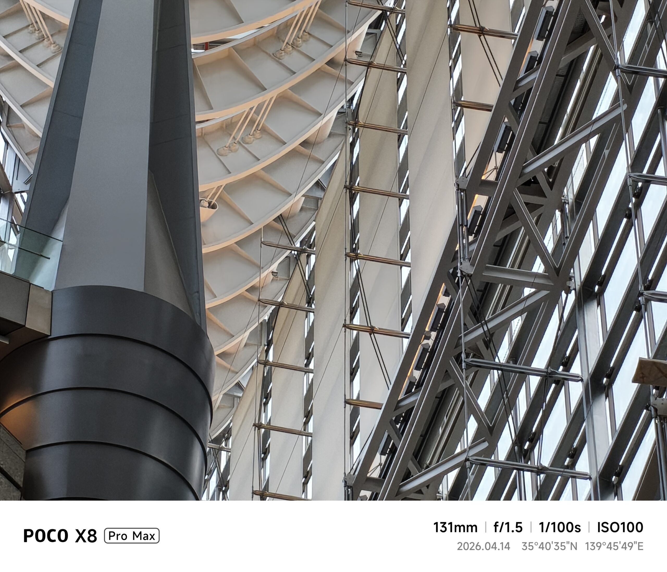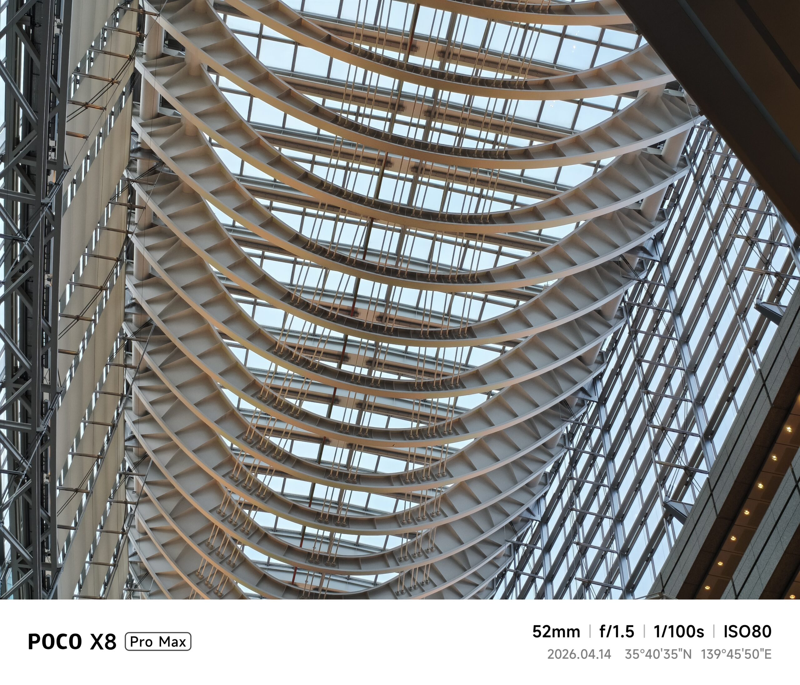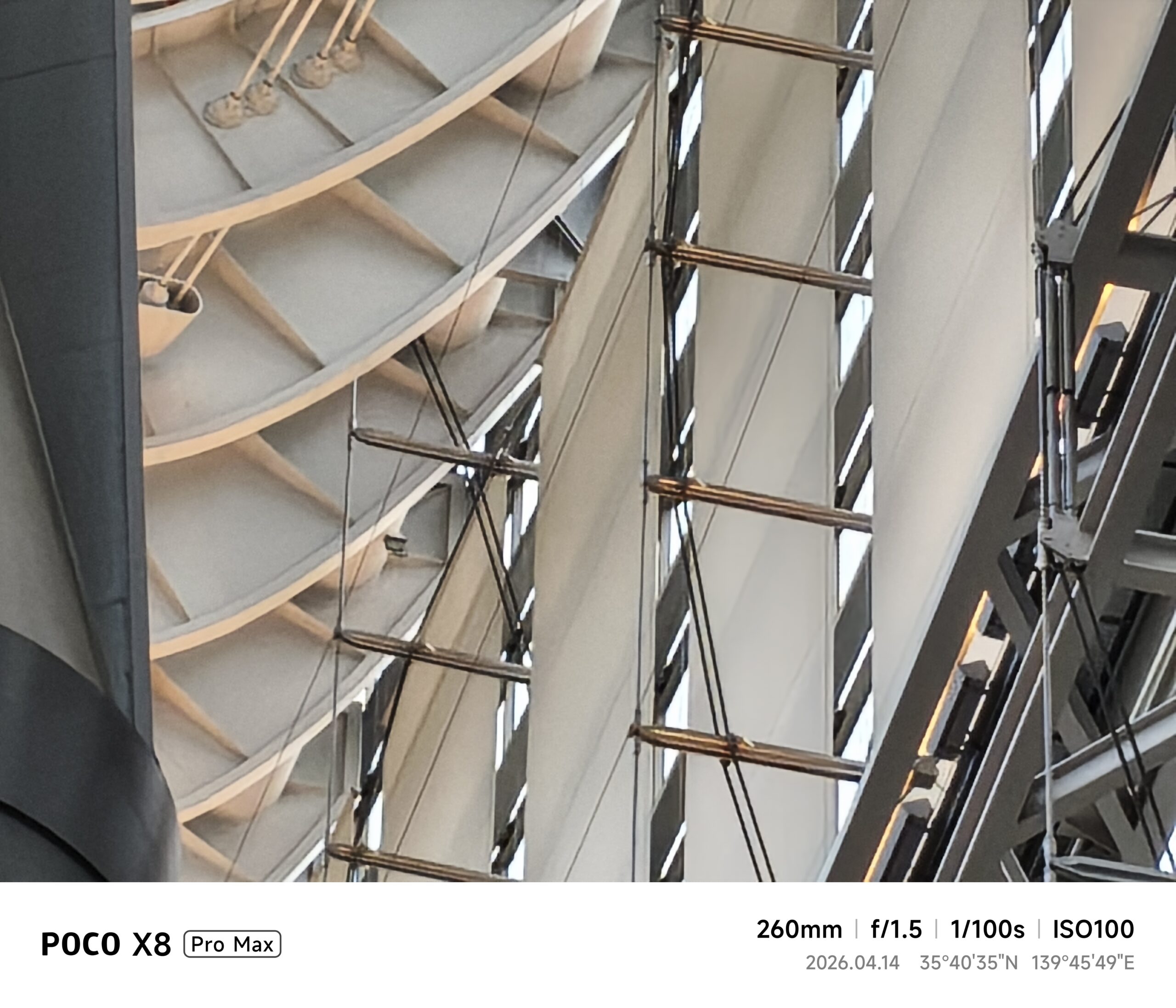 26mm相当(1x標準)に切り替えると、UltraHDRのバランスが良く、明るい天井部と影になった通路部分の明暗を極めて自然に描写してくれました。さらに52mm相当で天井の骨組みにフォーカスを当てると、鉄骨の規則正しい並びが驚くほどくっきりと捉えられており、光学ズームに近い解像感を実現しているところ。