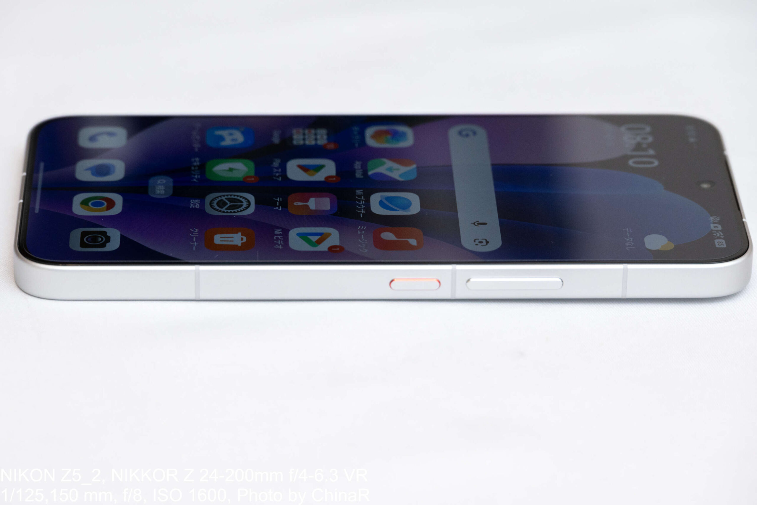 側面に回ると、右側面には音量キーと電源ボタンを配置。電源ボタンには赤いワンポイントラインを入れており、手探りでも電源と音量を一発で判別できる粋な仕掛けが嬉しいポイント。左側面はアンテナラインが1本走るのみのフラットな仕上がり。フレームは金属的な光沢を持ち、継ぎ目がほとんど見当たらない一体感の高い造形となっています。実測220.5gと200gを大きく超える重量級ですが、この1週間使った限りでは「重くて疲れる」という感覚はなく、むしろ手に持ったときの密度感が満足感につながる印象。