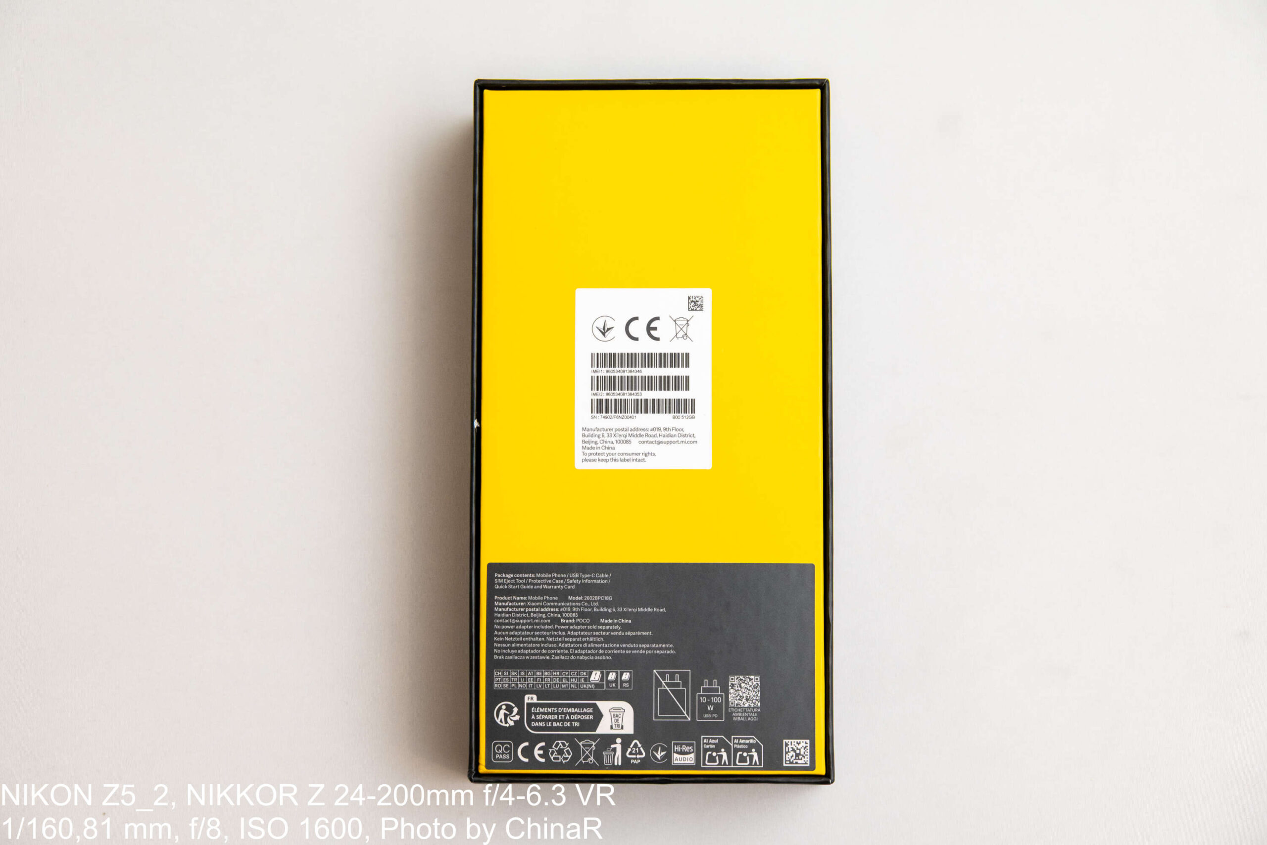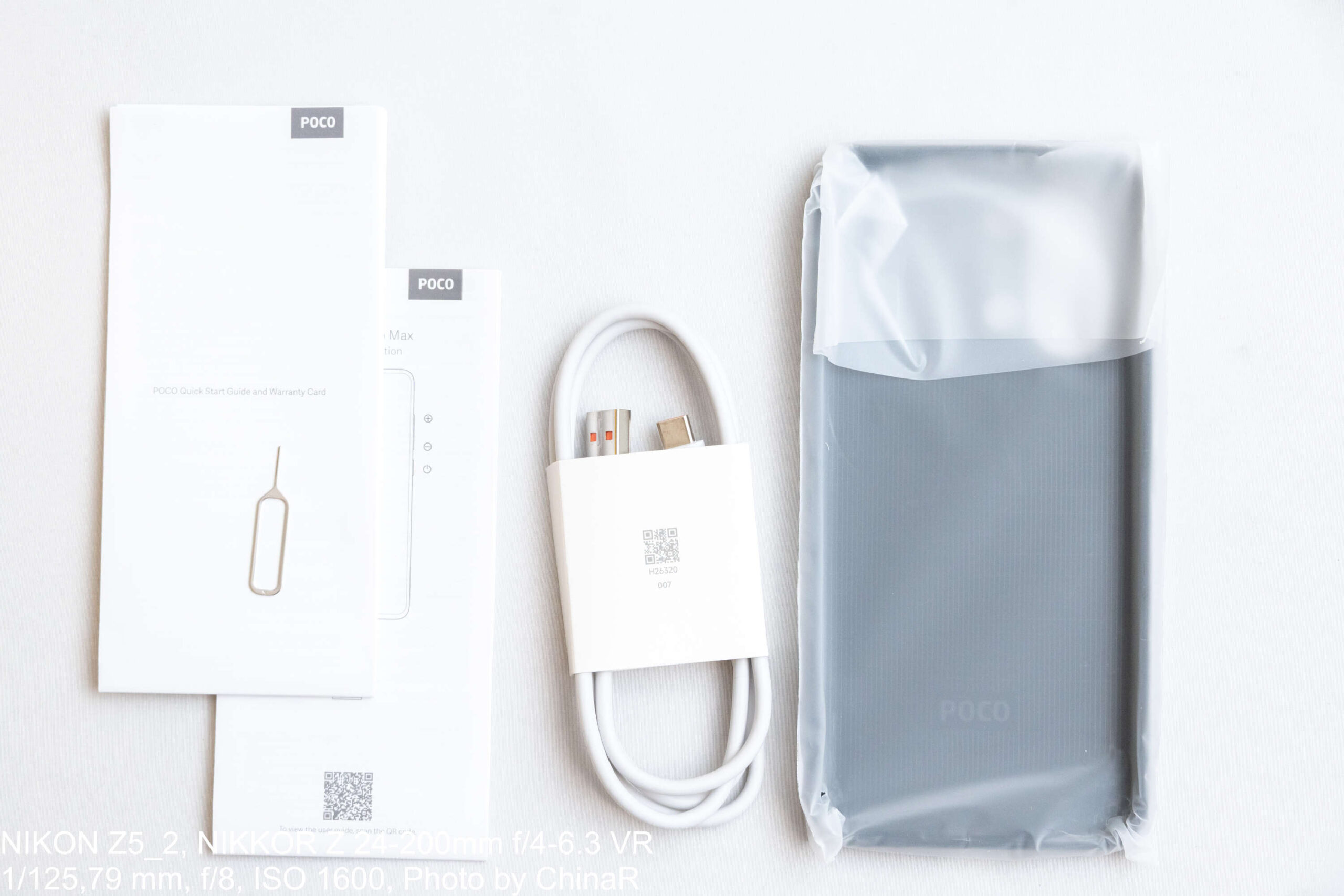外箱はPOCOらしい黒地に黄色の象徴的なデザイン。同梱品はクイックスタートガイド、SIMピン、ダークグレーの専用ケース、そして充電ケーブルです。純正100Wハイパーチャージの実速度については今回は検証していません。