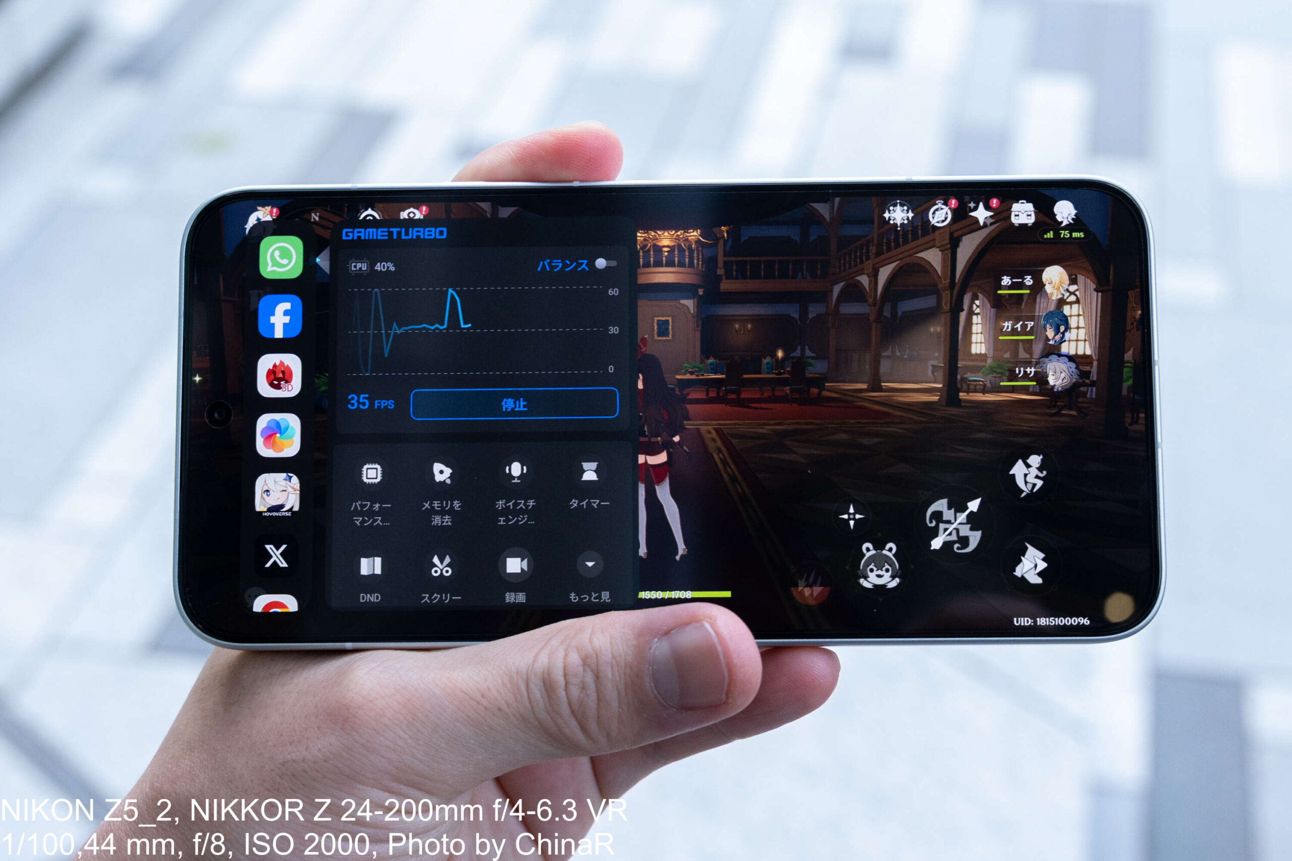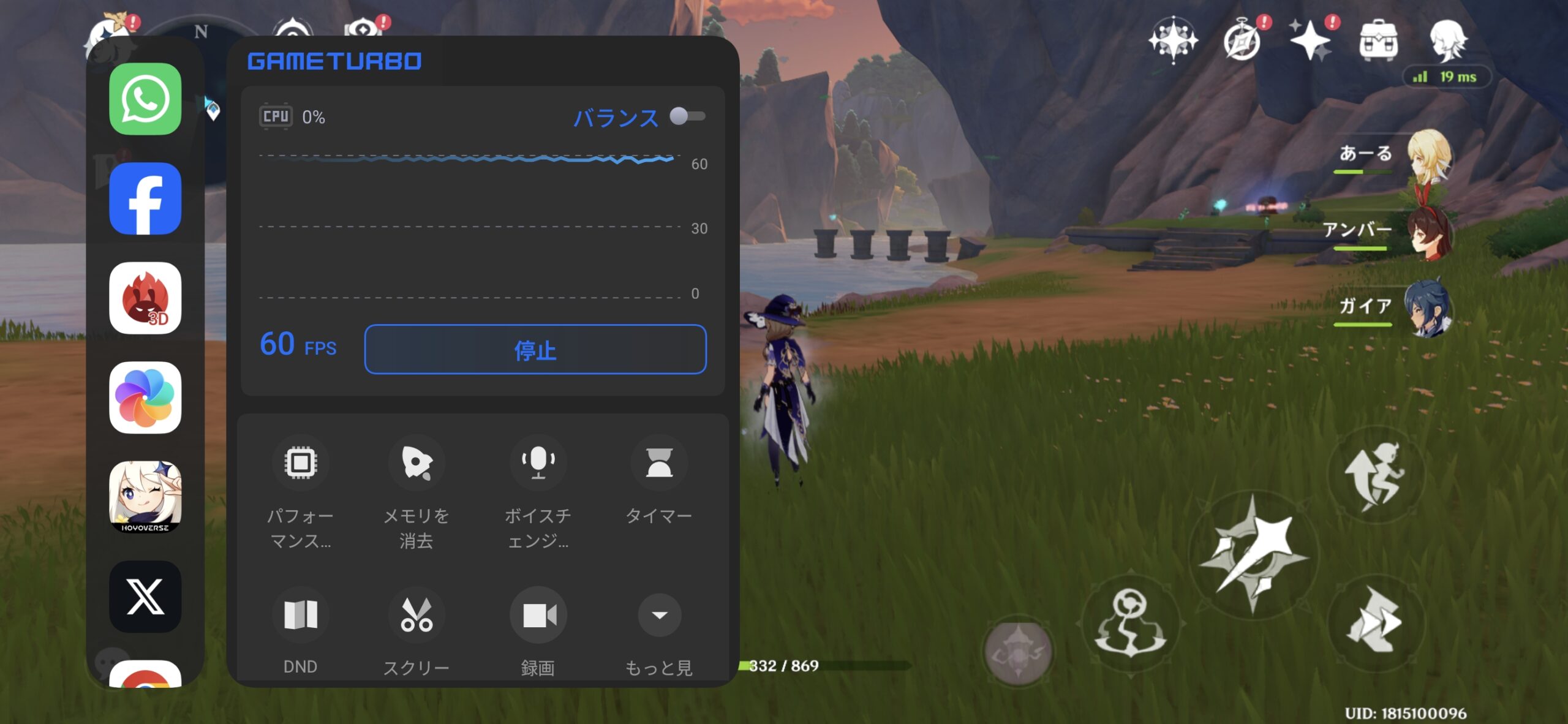 ゲーミングフラグシップを名乗る本機の真価が問われるのがゲーミング性能です。今回は定番の『原神』をインストールして検証しました。ゲームを起動するとXiaomi HyperOSのGame Turbo機能が自動的に有効化され、画面端からスワイプすることでフレームレートやCPU使用率のオーバーレイ表示、メモリ最適化、タイマー、スクリーンショット/録画、DND(Do Not Disturb)モードへの切り替えなどが利用可能になります。ゲーム時のシステム最適化機能はしっかり整備されている印象。