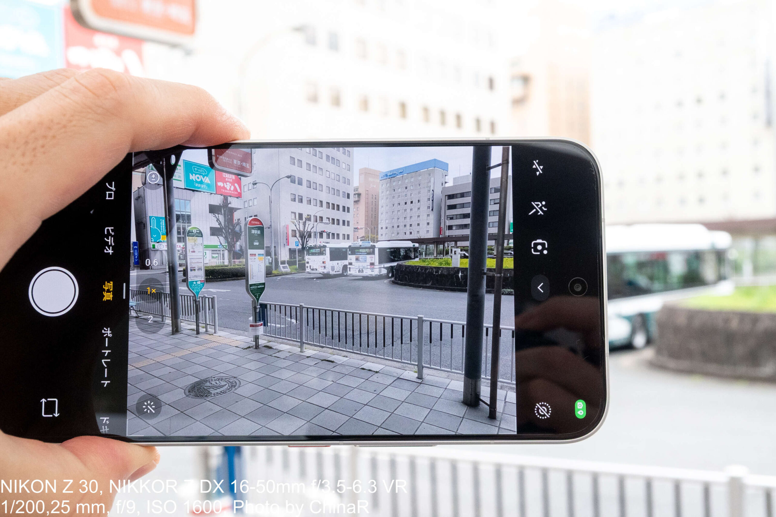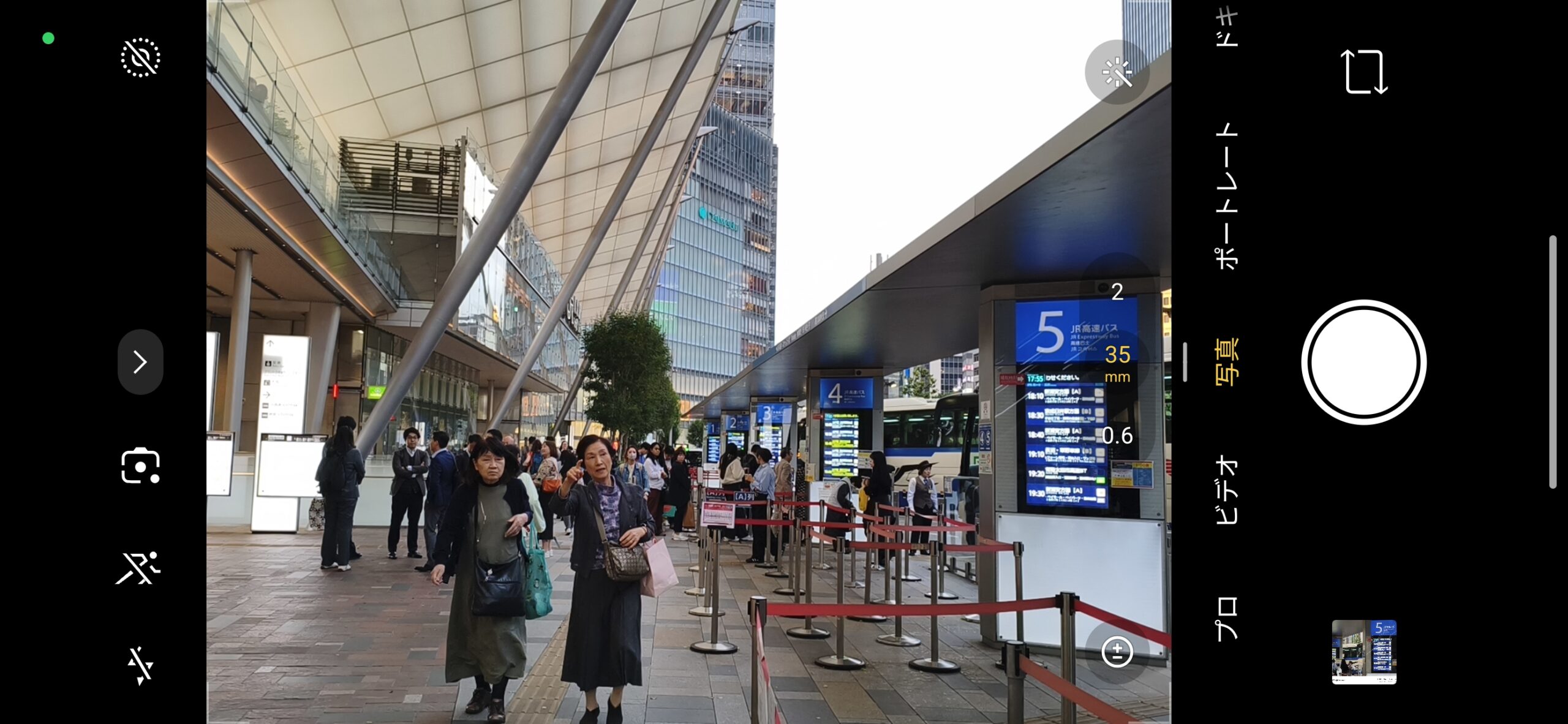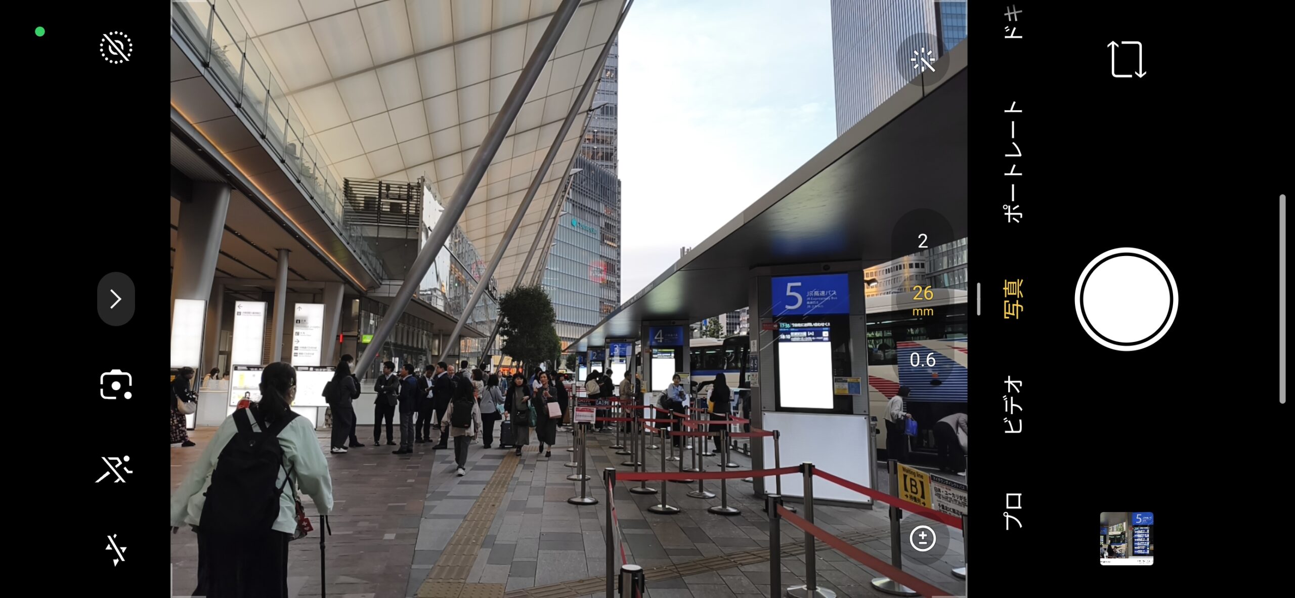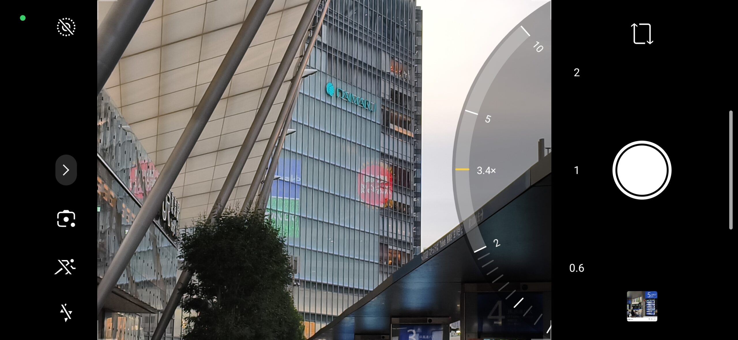 カメラアプリのUIは横持ち時の操作性をしっかり考慮した作りになっています。画面右側には縦方向のズームホイールが配置されており、0.6倍・1倍・2倍の主要ポイントには大きめの目盛りを、5倍・10倍にも目盛りを刻んでいるところ。指でホイールを回すと3.4倍や7.1倍といった中間倍率もスムーズに呼び出せます。1倍時には26mm相当、2倍時には35mm相当といった焦点距離換算値も画面上に表示してくれて、一眼レフユーザーにも分かりやすい設計。