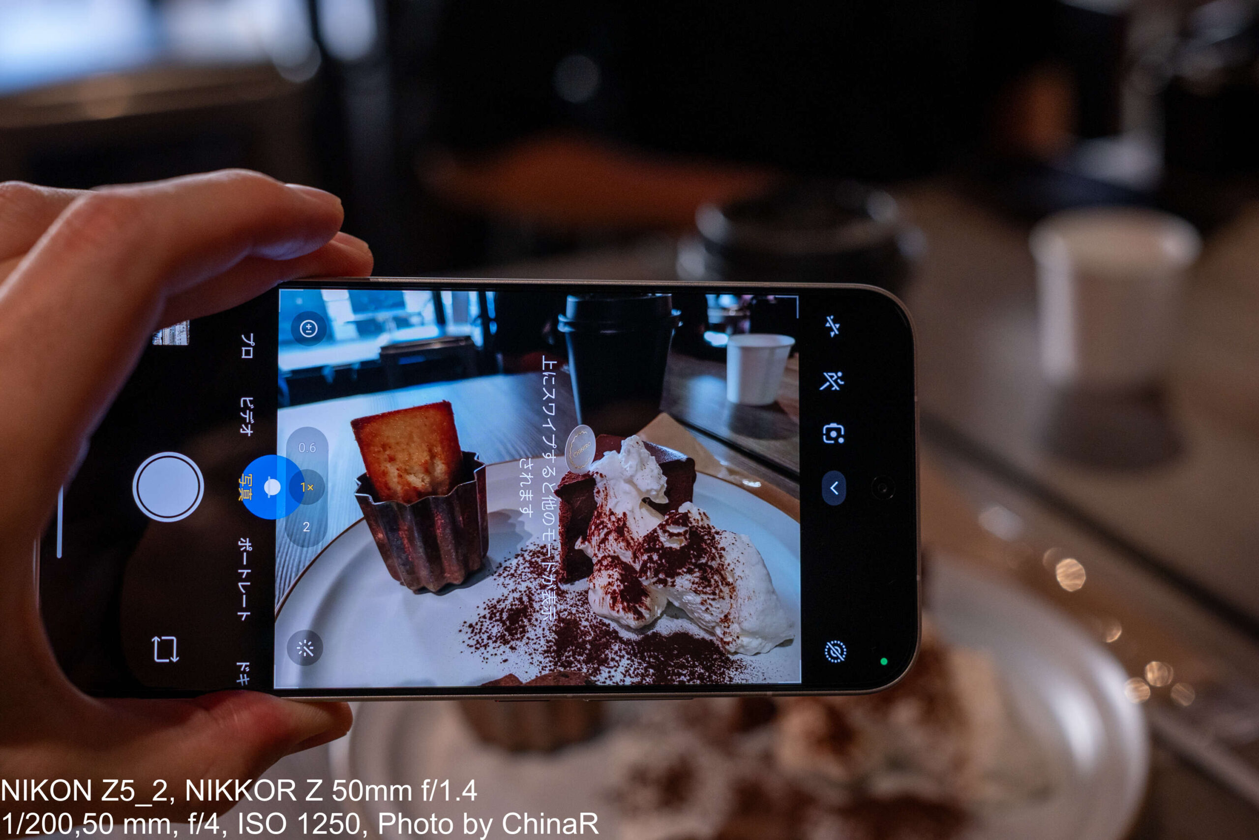 また、白金台のカフェで撮影したチョコケーキのように、暗い店内での撮影では料理と背景の境目が曖昧になりやすい傾向も確認できました。室内照明が抑えめのお店だと、ケーキ本体の色味と店内の暗さが被ってしまい、被写体が背景に溶け込んでしまう場面があるところ。料理写真をしっかり撮りたいシーンでは、明るい場所を選んで撮影するか、ライティングを意識した方が安心といえそうです。