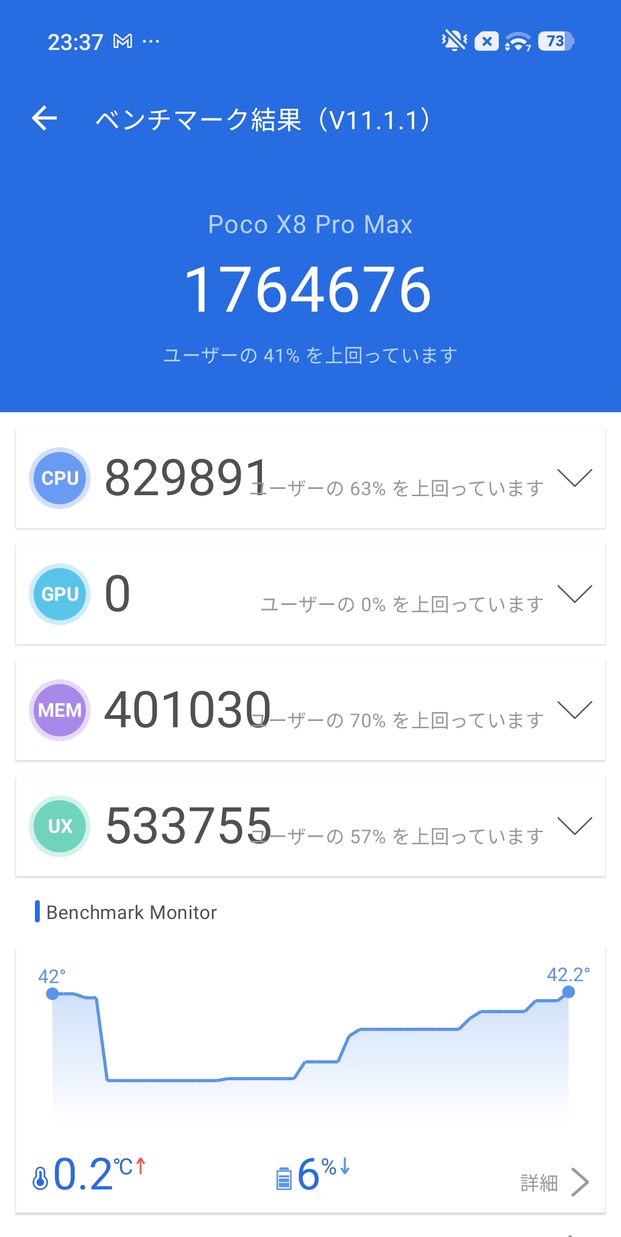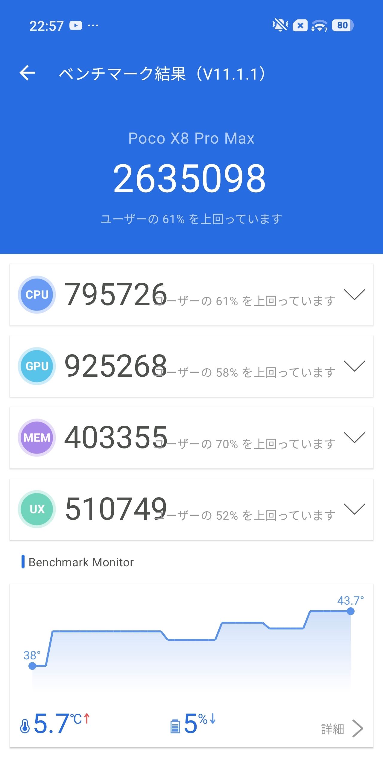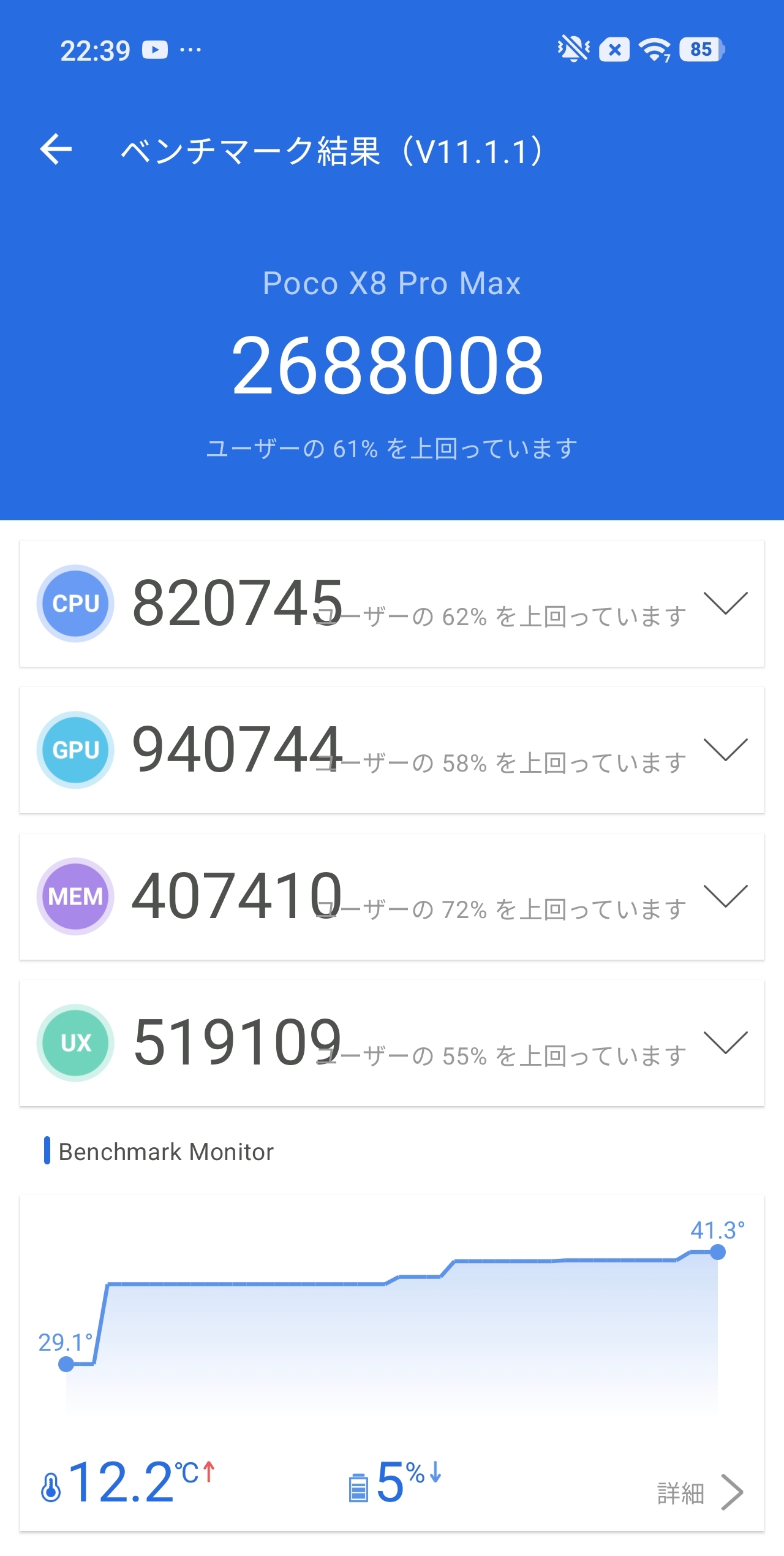 兄弟機POCO X8 Proに搭載されているDimensity 8500-Ultra(Antutu 228万点)と比較すると約60万点の差があり、SoCの世代差・プロセスルールの差がそのままスコアに表れる形となっています。重量級ゲームをガッツリ遊ぶならX8 Pro Max、日常使い中心ならX8 Proでも十分という棲み分けがハッキリしている印象です。