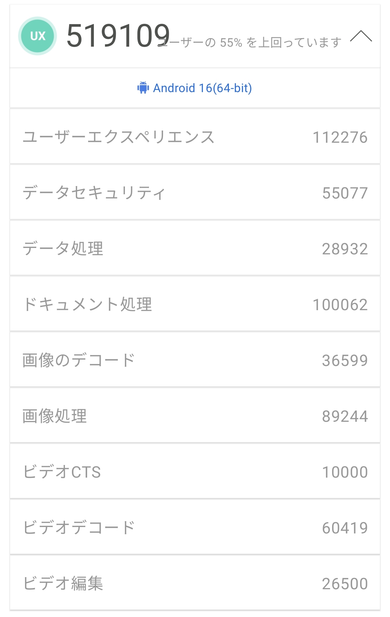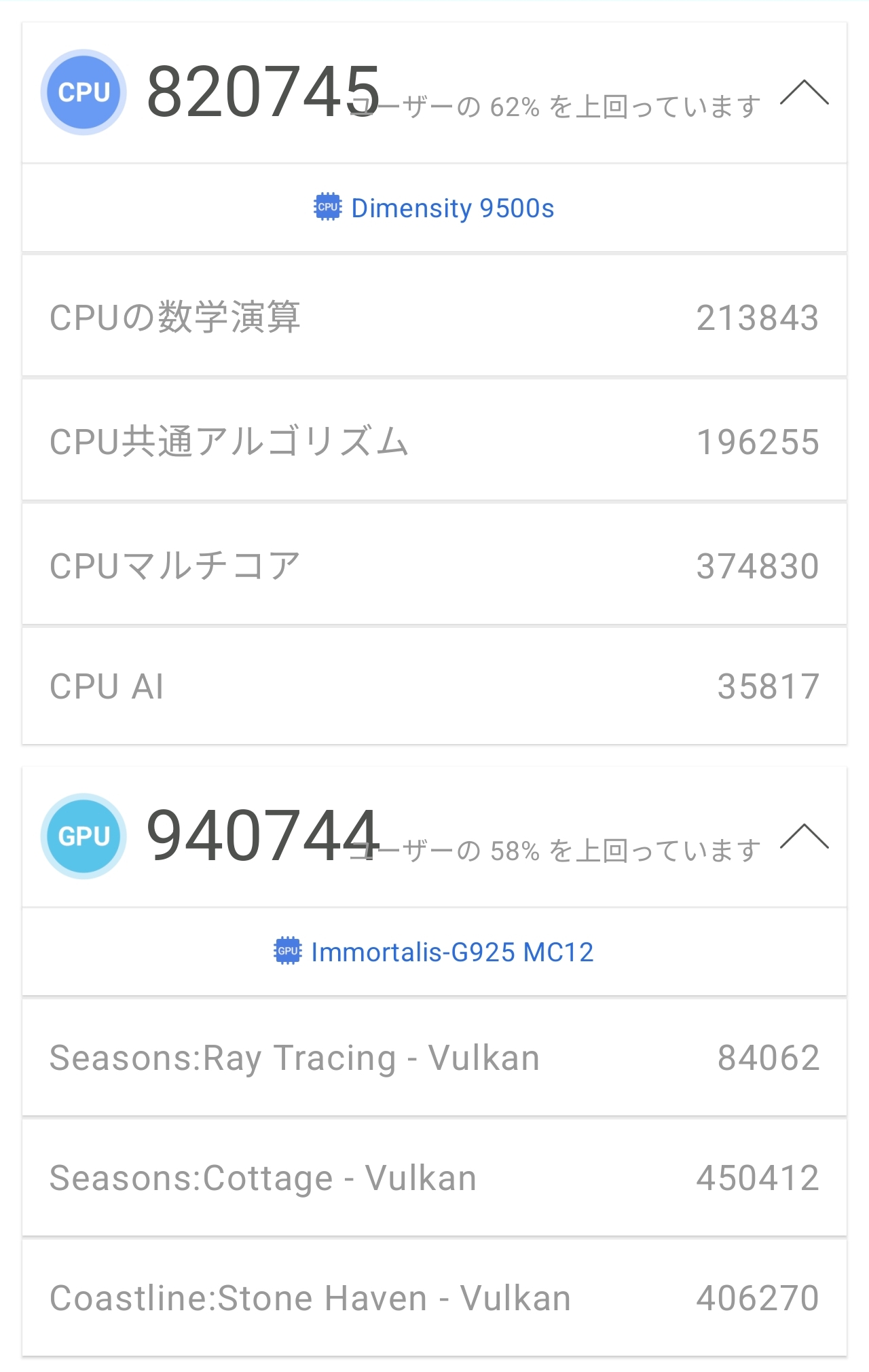 内訳はCPUスコア820,745点・GPUスコア940,744点・MEMスコア407,410点・UXスコア519,109点となっており、いずれの分野も現行Androidスマートフォンの中でトップクラスの数値。CPUの内訳ではマルチコア性能が374,830点と特に高く、Dimensity 9500sのオールビッグコア構成が効いている印象です。GPUテストでもVulkan APIを使用したSeasons:Cottageで450,412点、Coastline:Stone Havenで406,270点と高水準のスコアを記録しており、Immortalis-G925 MC12の性能の高さがしっかり数字に表れています。