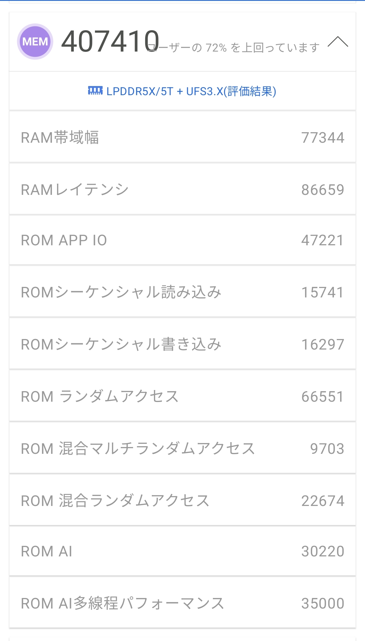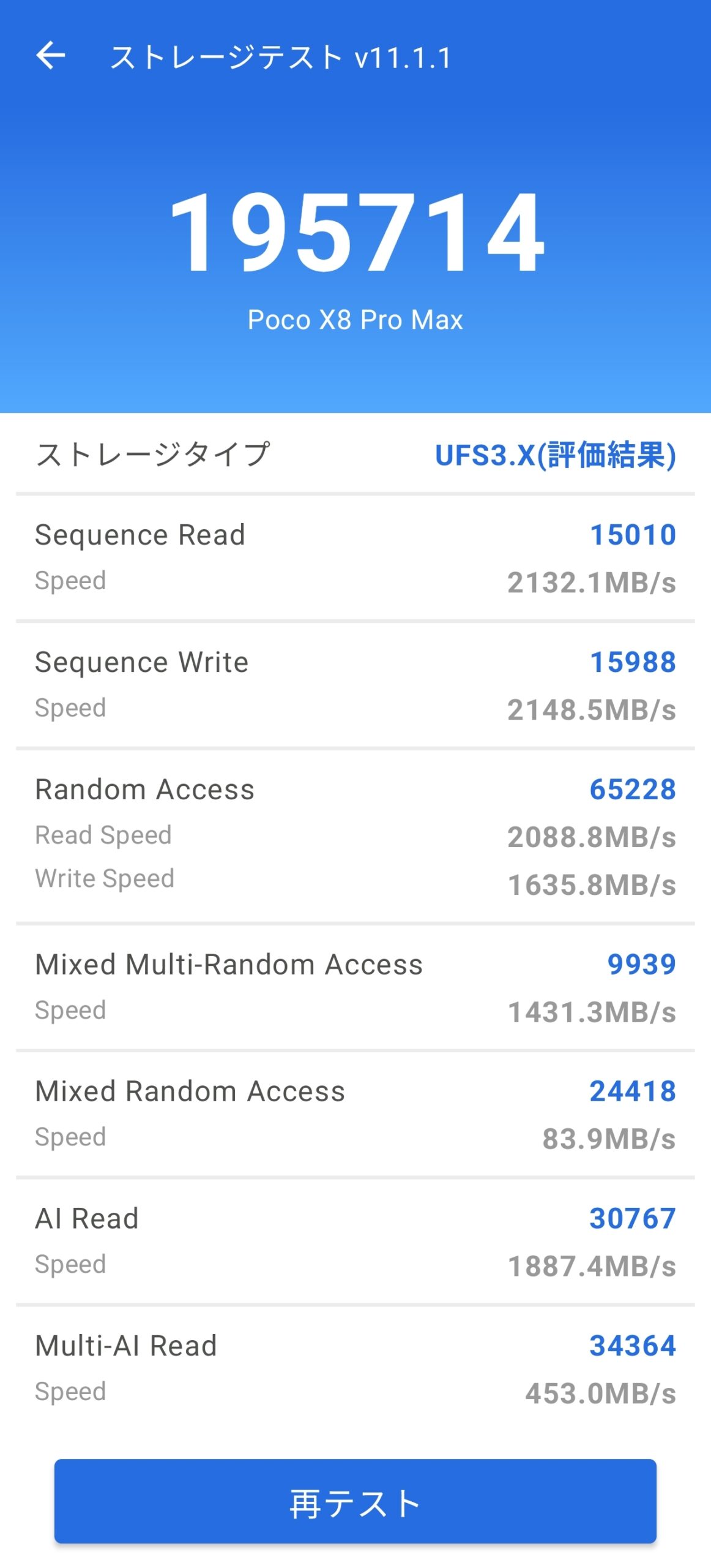 ストレージテストの結果はシーケンシャルリードで2,132.1MB/s、ストレージ単体スコアは195,714点を記録。MEMスコアの内訳でもRAM帯域幅が77,344と高水準で、メモリ・ストレージ系がボトルネックになる場面はまずなさそう。実際にアプリ起動やゲームのロード時間も明らかに高速で、日常使いでもこの恩恵はしっかり実感できます。