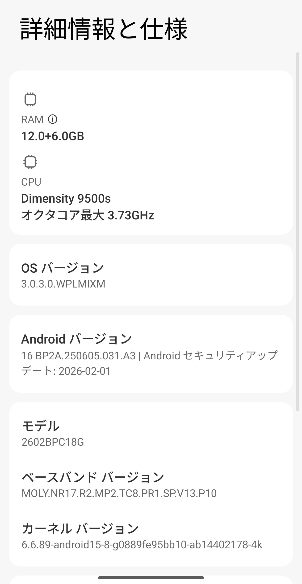 OSはXiaomi HyperOS 3.0.3.0を搭載。ベースはAndroid 16の最新世代となっています。セキュリティパッチも2026年2月1日付の最新版が適用。MIUIから刷新されたHyperOSになってから素のAOSPに近い操作感になっており、他社のAndroidスマホからの乗り換えでも違和感なく使える仕上がりになっています。