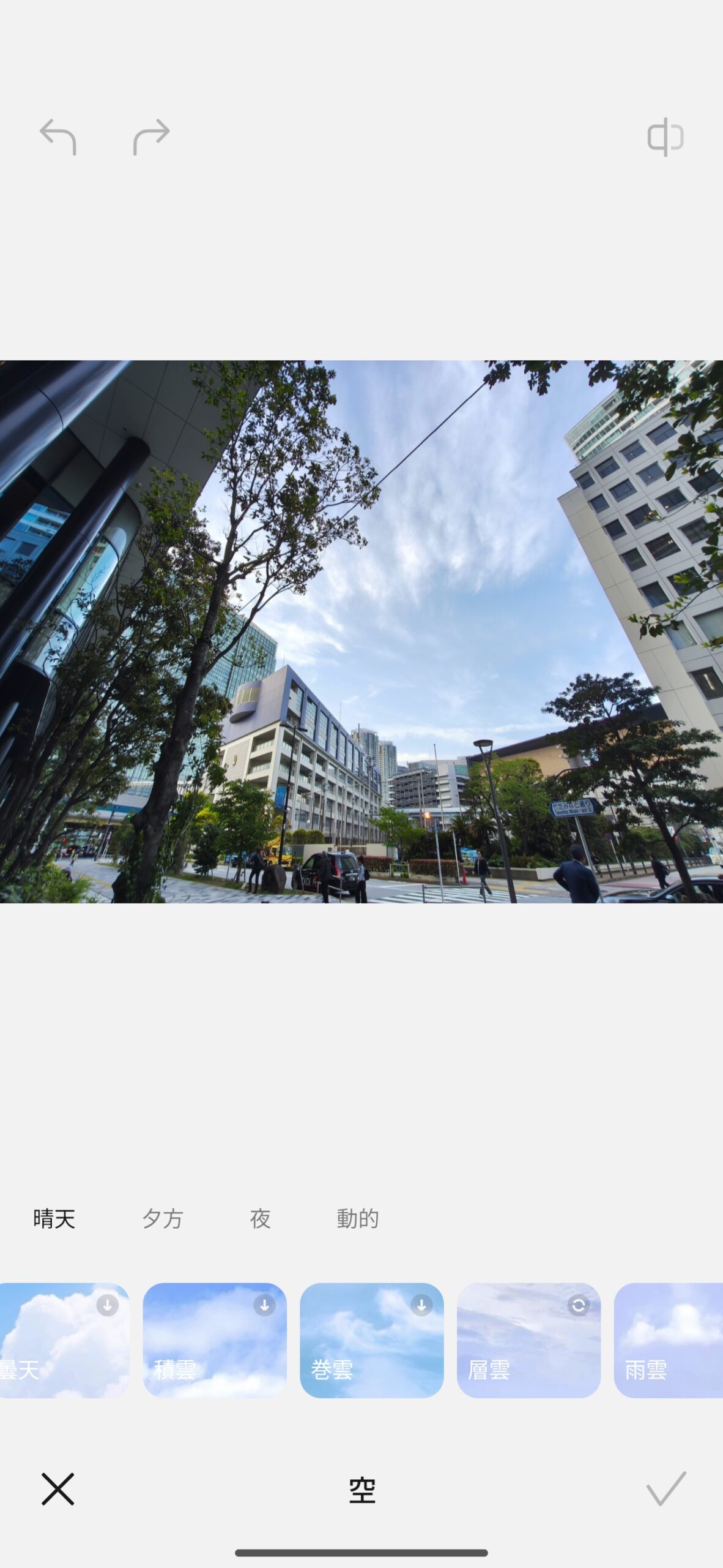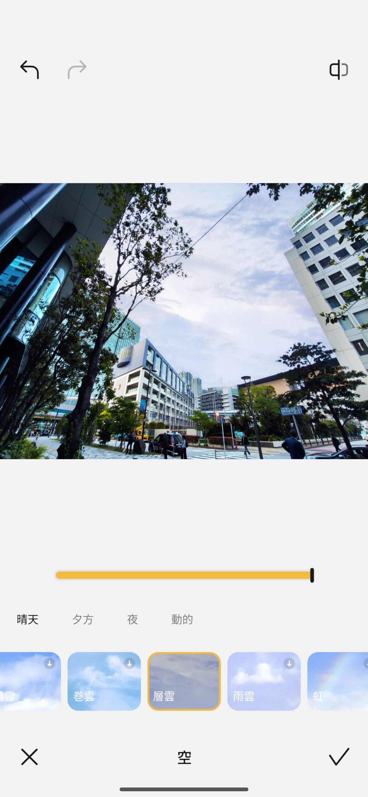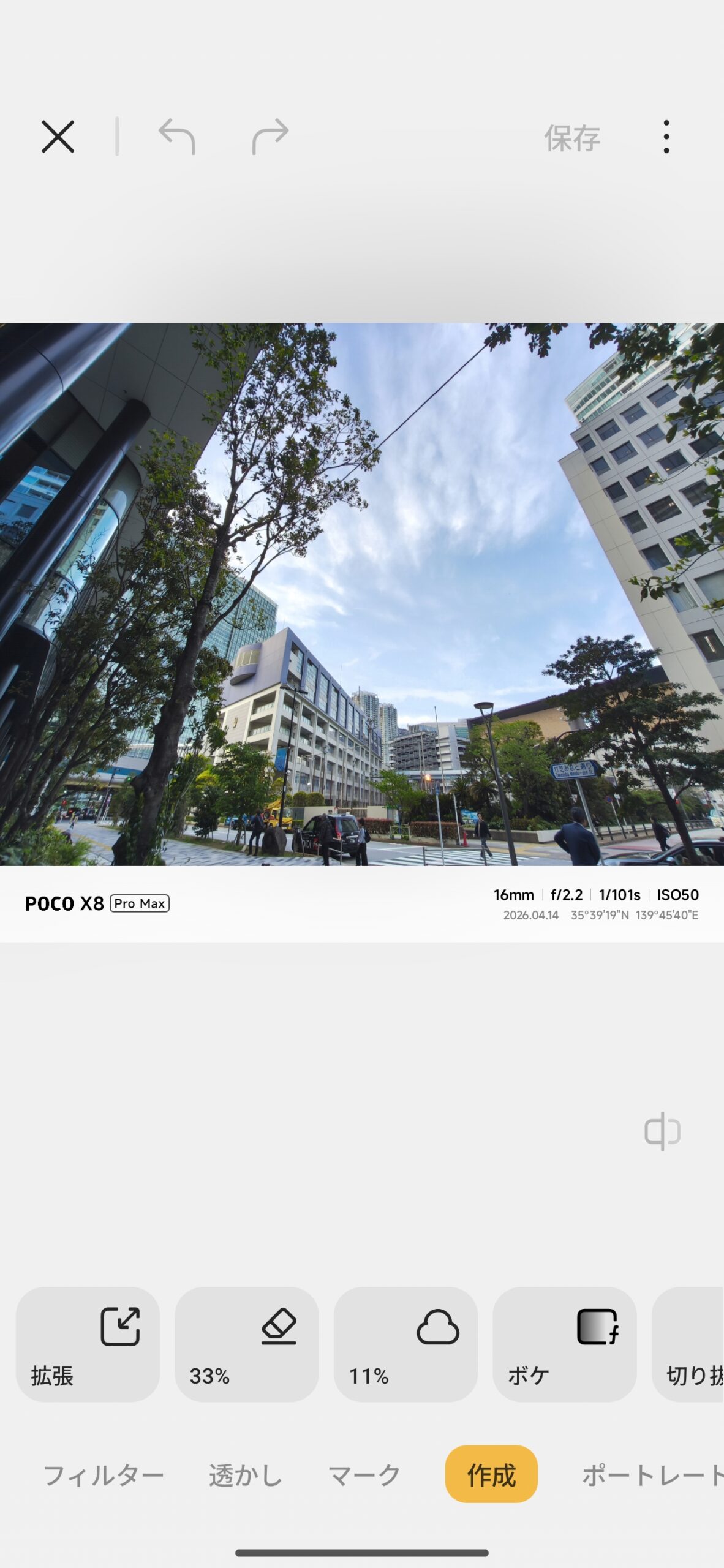 ハードウェアと並行してAI画像編集機能も大幅に強化されているのがHyperOS 3の特徴です。AIスカイ機能では晴天・夕方・夜・動的・層雲など雲の種類まで細かく選んで空を入れ替えられます。試しに16mm超広角で撮影した写真を編集してみたところ、ドラマチックな雰囲気には仕上がりました。ただ、建物全体にまで青紫系の色被りが発生してしまい、不自然さが残る仕上がりに。色被りを強くして雰囲気を演出する処理が入るため、元の写真を知らなければ違和感は少ないかもしれませんが、使いどころは限られそうです。