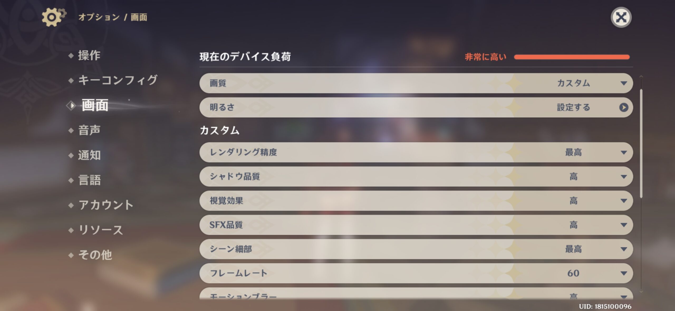 実際のプレイは原神の最高画質設定+60FPSモードで検証しました。設定画面では「現在のデバイス負荷:非常に高い」という警告表示が出るものの、実プレイでのフレームレートは60FPSをほぼ完全維持。シーン遷移、戦闘中のエフェクト多発シーン、フィールド移動のいずれでも目立ったフレームドロップはなく、快適にプレイできました。。