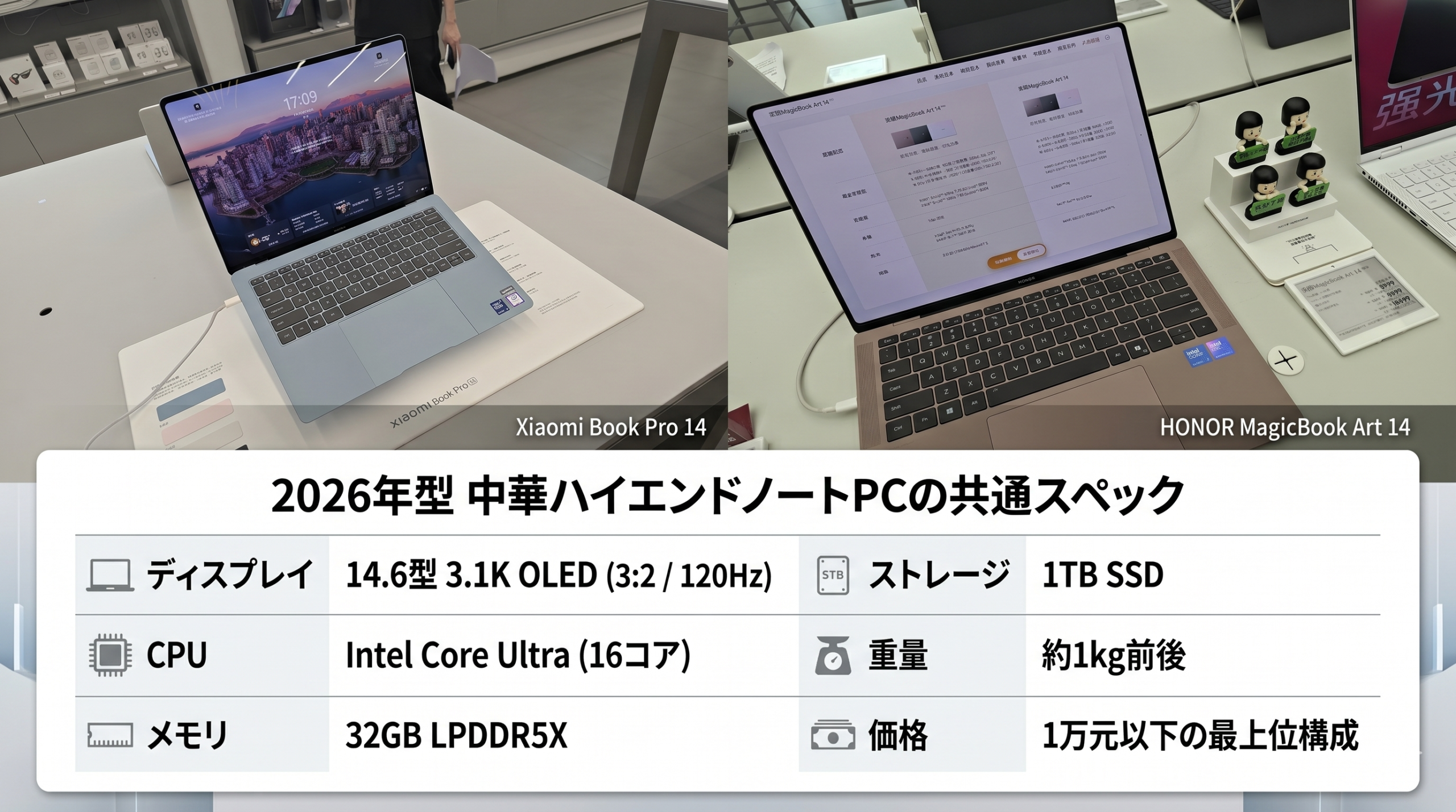 Xiaomi Book Pro 14とHONOR MagicBook Art 14の価格は以下の通り。店頭価格のため実際に日本からAliExpressで購入する際にはもう少し高くなるものの、コンパクトハイエンドとしては手が届く範囲の価格に仕上がっている印象でした。(為替は2026年4月時点の参考値1元≈23.3円で換算)。