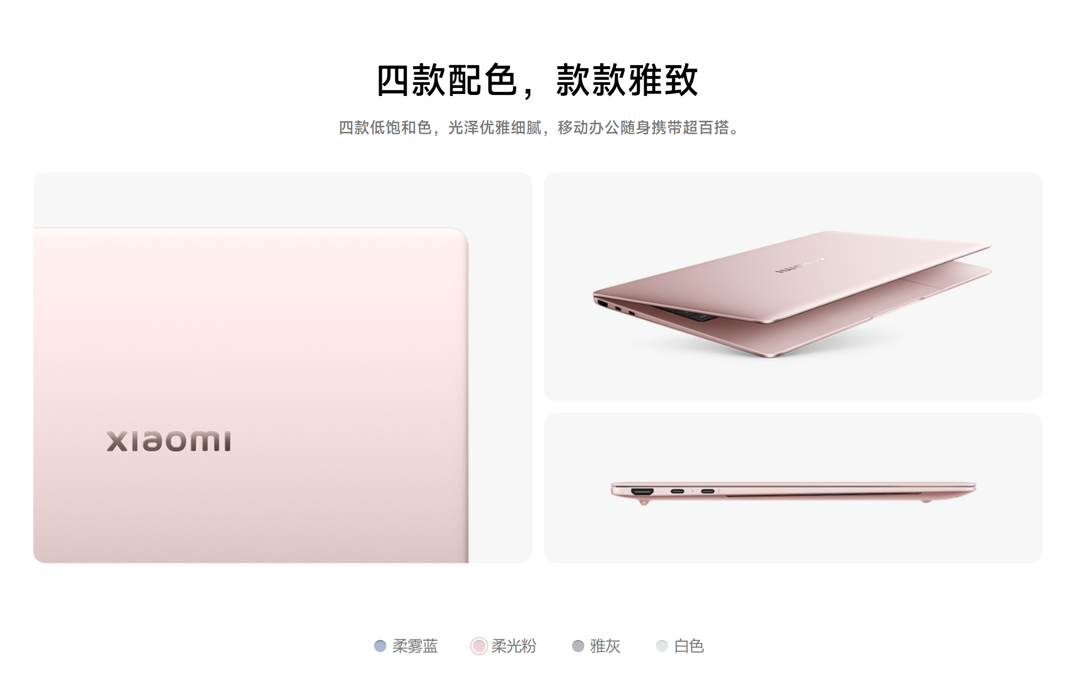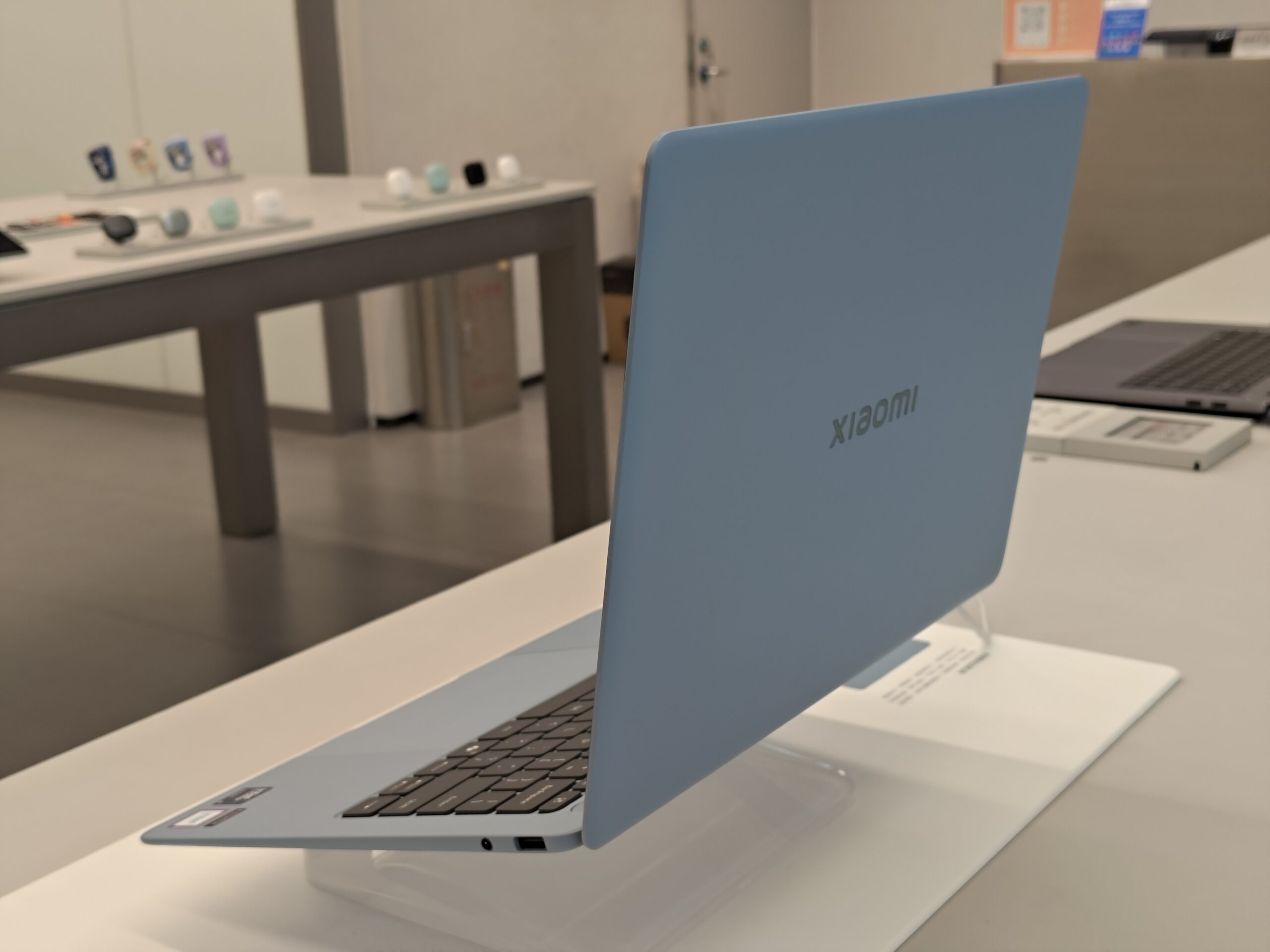 カラー展開もキャラクターの違いを反映していて、Xiaomiは白色・雅灰(エレガントグレー)・柔霧藍(ミスティブルー)・柔光粉(ピーチピンク)の低彩度系4色(写真ではミスティブルーを確認)。HONORはMocha BrownとEmerald Greenの2色展開で、写真ではゴッホの絵画にインスパイアしたというEmerald Greenではなく、自然の輪郭から着想したというMocha Brownが展示されていました。