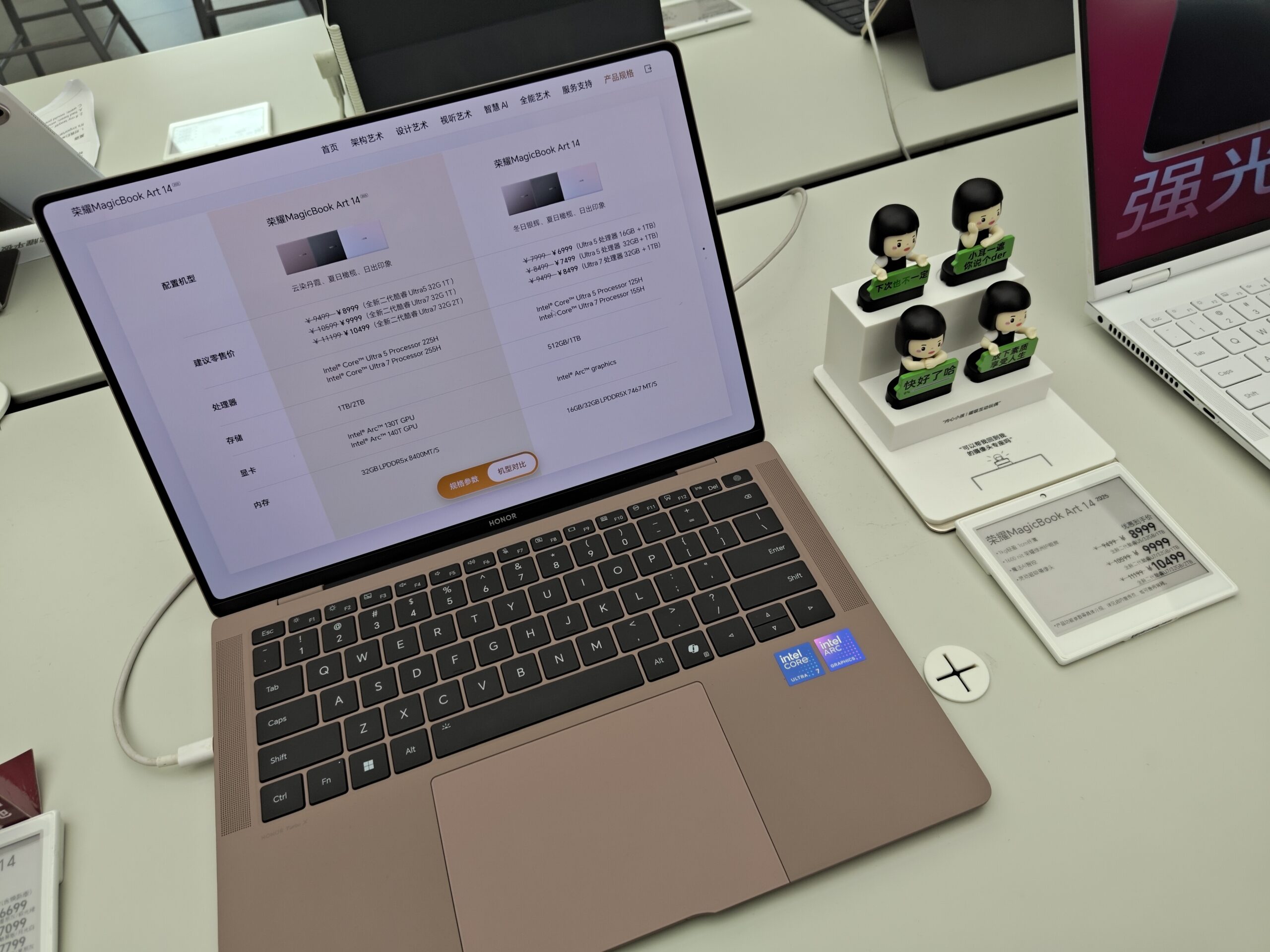 HONOR MagicBook Art 14の最上位はIntel Core Ultra 7 255H(16コア/16スレッド・最大5.1GHz・Intel Arc 140T GPU)。メモリは32GB LPDDR5X 8400MT/s。Turbo時の最大消費電力は40Wと、Xiaomiより10W低い設定です。