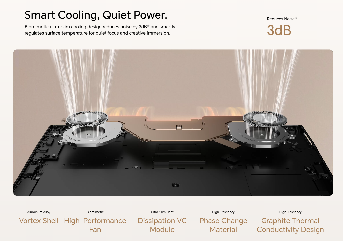 冷却機構の作り込みはどちらのモデルもかなりこだわった仕様になっているのもポイントです。Xiaomiは魚のヒレ状の軸流ファンブレード、底面と両側面からの三方向吸気、新設の第3内部送風路によるキーボード周辺冷却と、薄型ノートとしてこれでもかと詰め込んだ仕様に。HONORは生体模倣設計のアルミ合金ボルテックスシェル、相変化材料、グラファイト熱伝導設計を組み合わせ、ノイズを3dB低減しつつ表面温度を制御するアプローチとなっています。