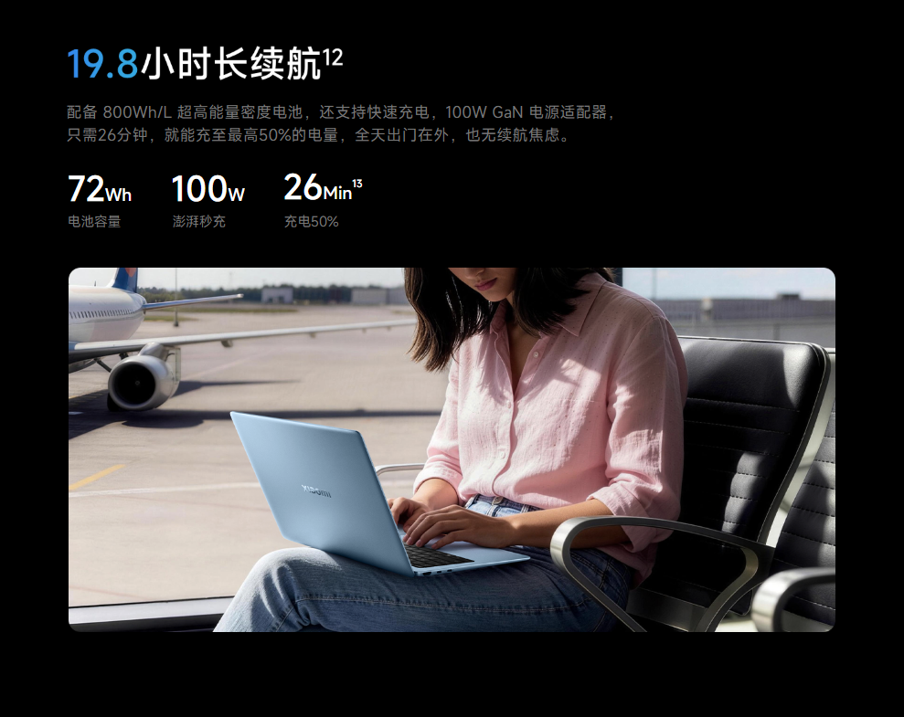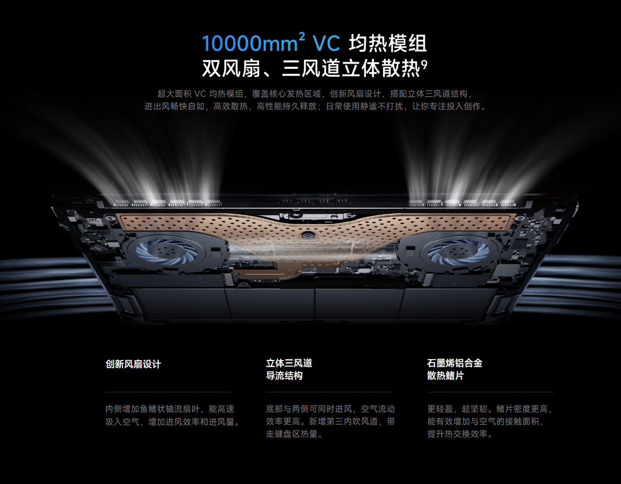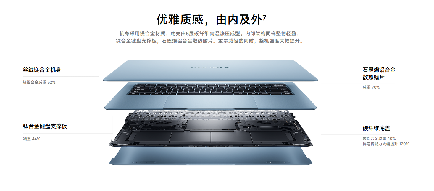 筐体素材の軽量化アプローチでは、Xiaomiが内部にも凝った構成。チタン合金キーボードサポートプレート(ステンレス比44%減)、グラフェンアルミ合金散熱フィン(銅比70%減)、5層カーボンファイバー底蓋(アルミ比40%減・抗弯曲性能120%向上)と、徹底した軽量・高剛性化を謳います。HONORもエアロスペースグレード・マグネシウム合金にフェザーリブ三角形トポロジー、チタン合金キーボード、ダイヤモンドカットアルミファンと、こちらも素材へのこだわりは半端ではありません。