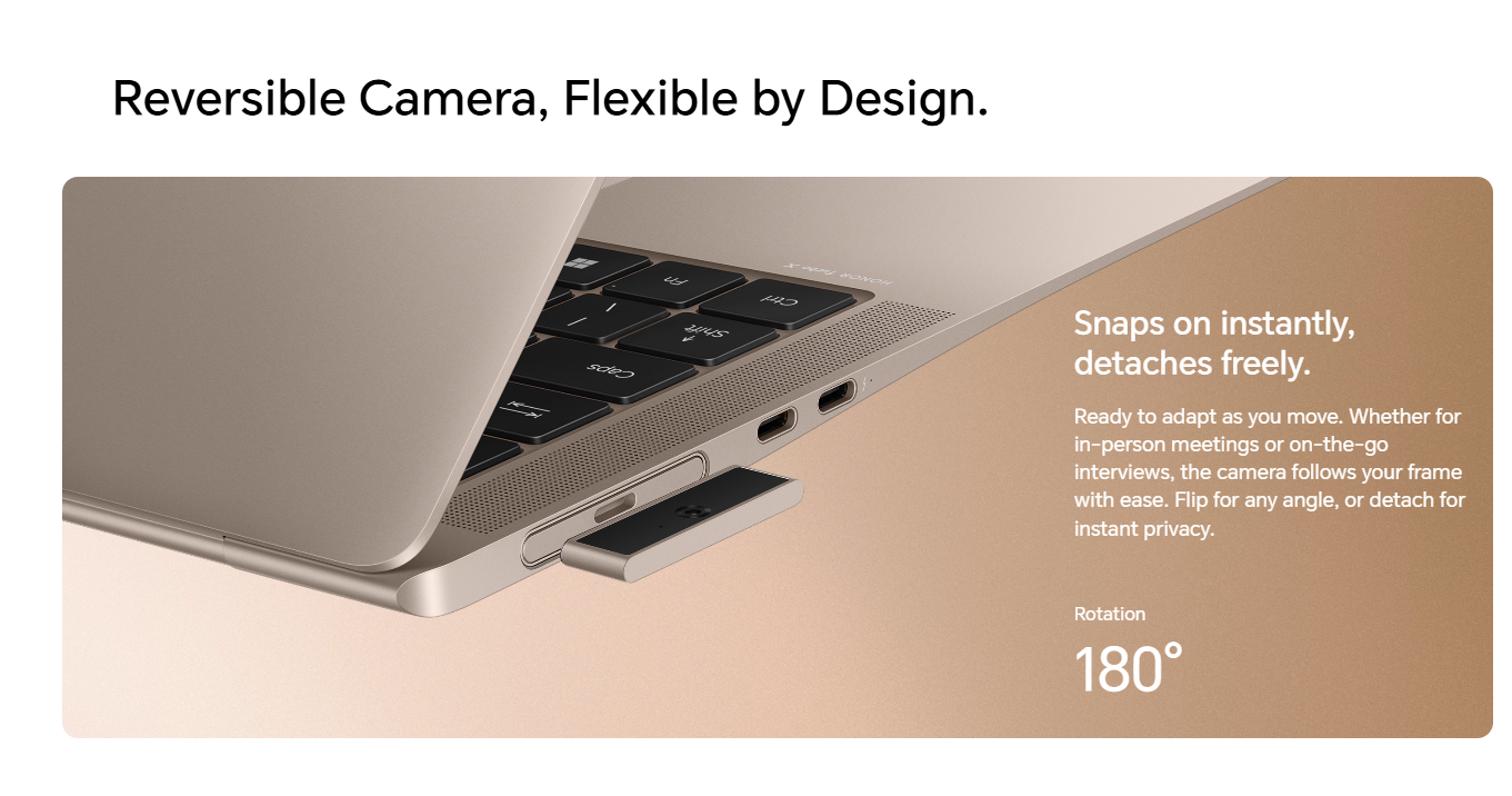 HONORの磁気着脱カメラは、店頭で見たなかでもっとも印象的なギミックでした。カメラユニットがマグネット装着式になっており、ワンタッチで取り外しが可能。さらに180°回転対応で、対面の被写体を撮ったり、自分側に向けてビデオ会議用にしたり、外したまま物理的にプライバシーを確保したりと、自由度の高さは唯一無二の体験です。固定カメラのXiaomi(1080P)ではなかなか実現できない使い勝手で、リモートワーク主戦場の方には強烈にアピールします。