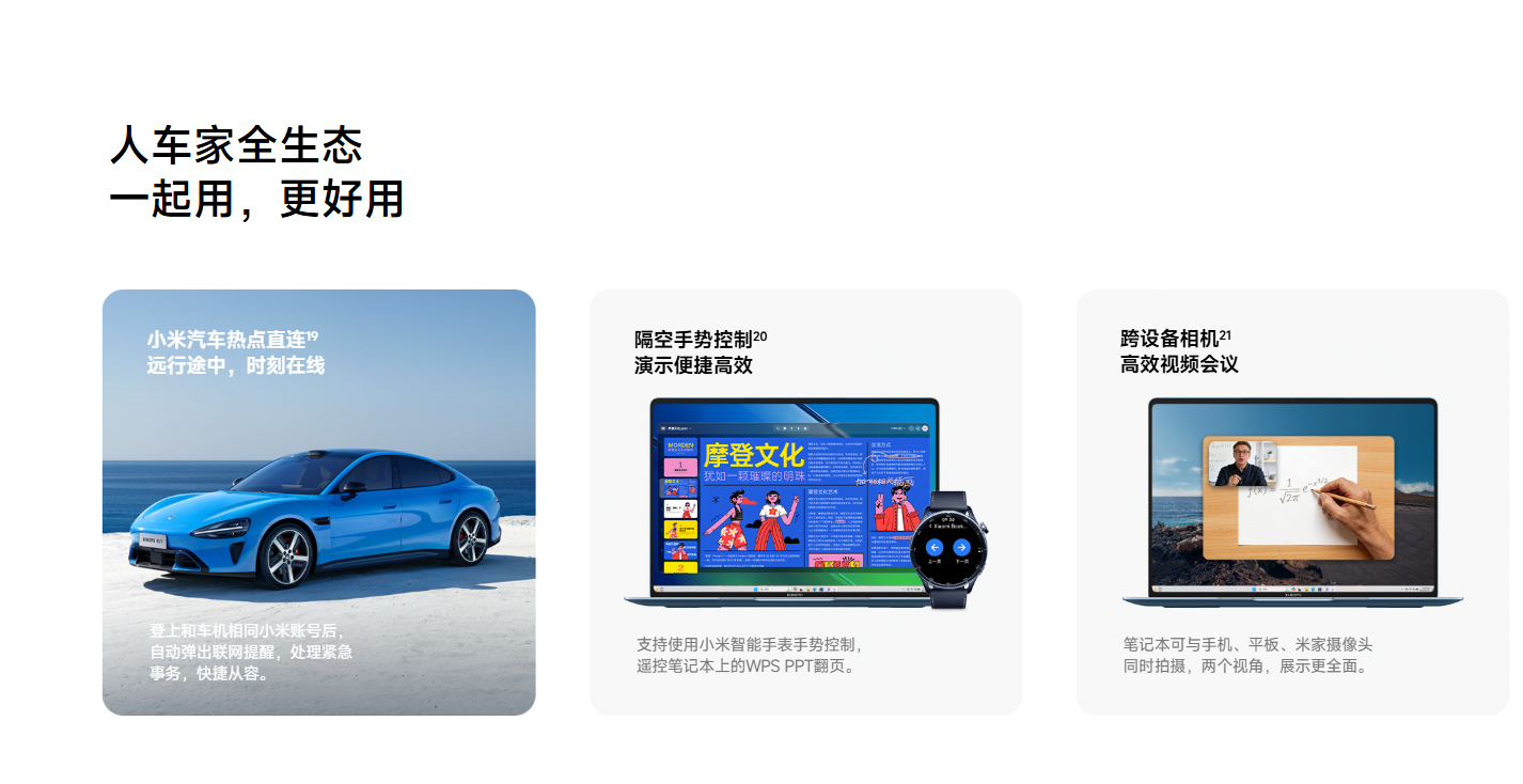 そのうえで、Xiaomi Book Pro 14の真骨頂はやはり「人車家全エコシステム」との連携。超級小爱(スーパー小愛)と呼ぶ統合AIアシスタントは、AIディープサーチ・個人知識ライブラリ・AIマルチモーダル問答を統合したオールインワン体験を実現。HyperOS 3.0以降のXiaomi端末(スマホ・タブレット・スマートウォッチ)との連携機能が圧巻で、Mi Watchのジェスチャーで PowerPoint をめくれる「隔空手势制御」、Xiaomi車(Xiaomi YU7など)との自動Wi-Fi接続「小米汽車熱点直連」、タブレットをPCのサブディスプレイとして使える「無線副屏」、タブレット・スマホ・米家カメラを同時に複数視点で使える「跨設備カメラ」、Appleデバイスとのファイル相互転送などの機能を実装しています。