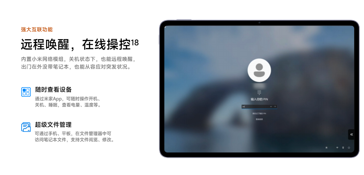 特に興味深いのがXiaomi独自の小米網絡モジュール。ノートPCの電源オフ状態でもリモート起動・遠隔操作ができるというもの。出張先で「家のPCにアクセスしたい」というケースでも、Xiaomi Homeアプリやタブレットのファイルマネージャー経由でPCを起動して使えるというもの。